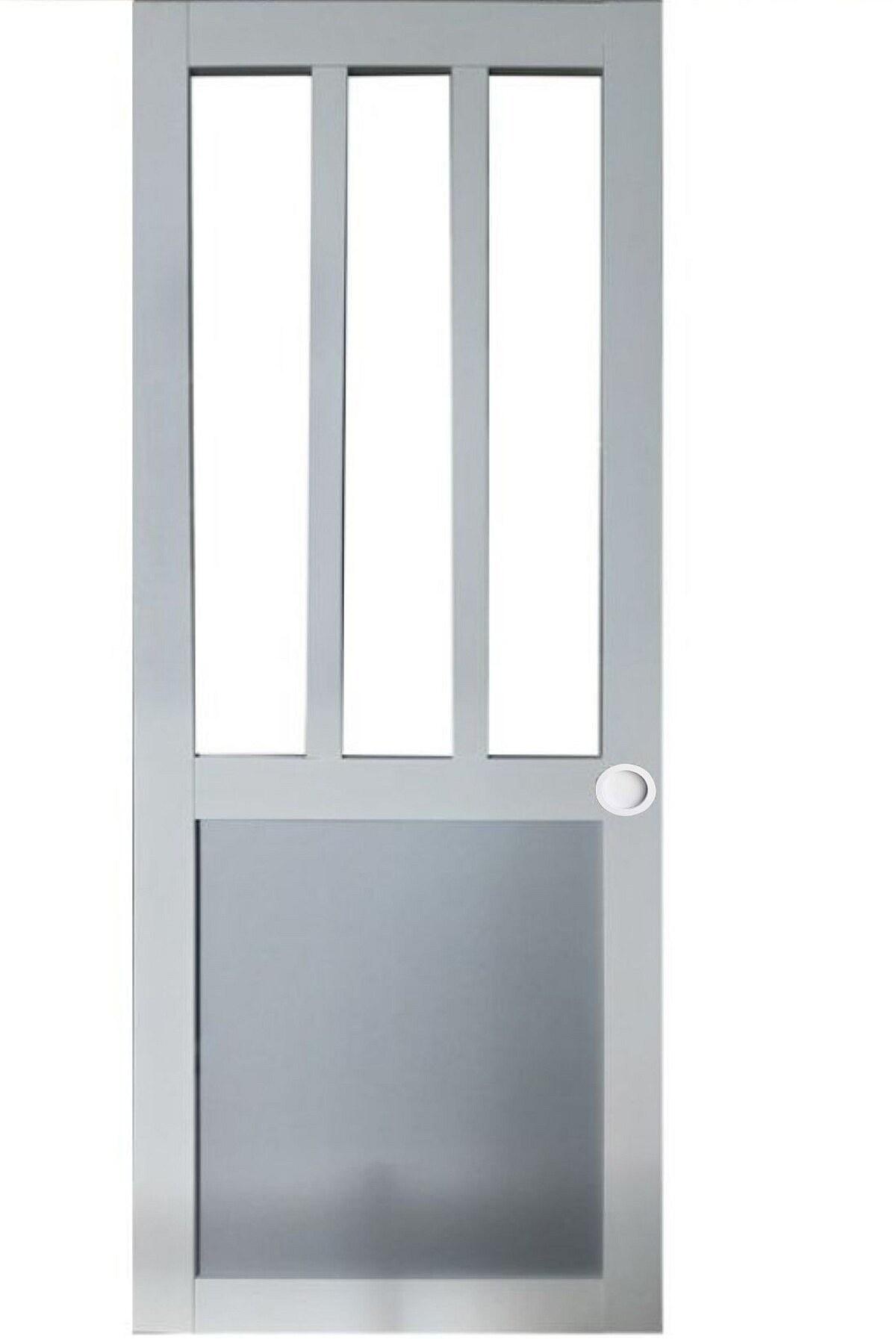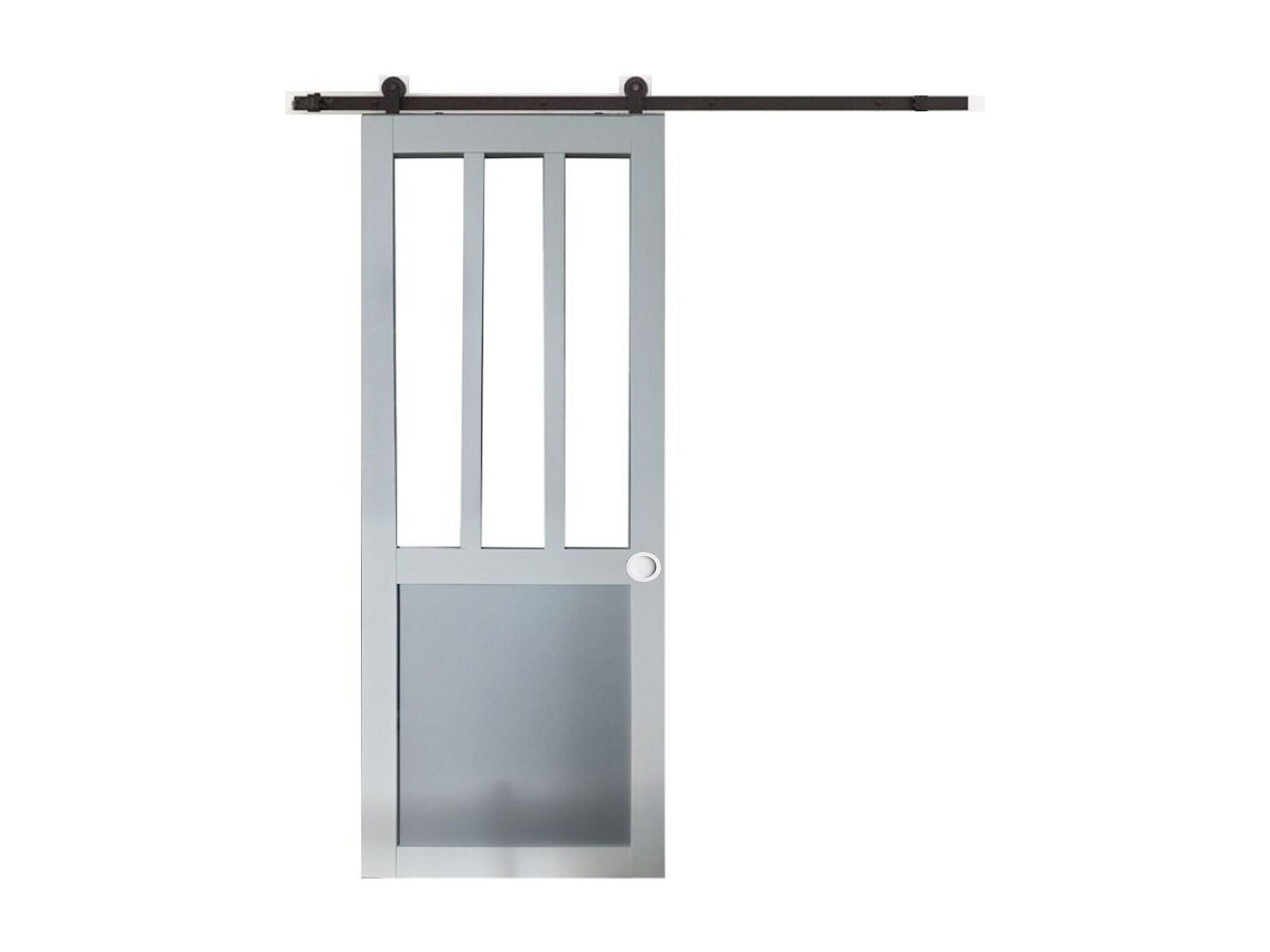 Porte Coulissante Atelier Blanc Et Gris Ral7035 Vitree H204 X L83 + Rail A Roulettes Noir Et Coquilles Blanc Gd Menuiseries