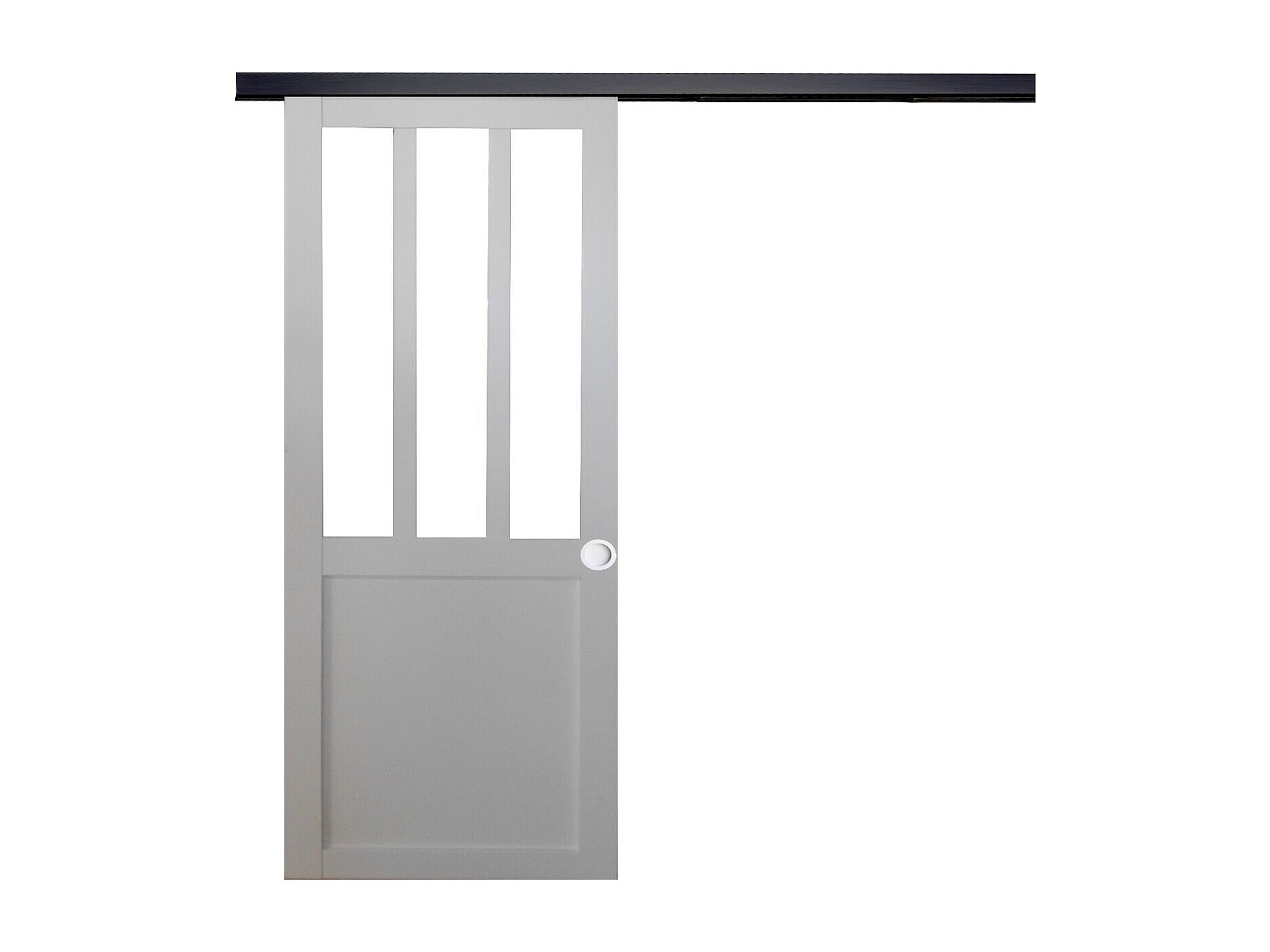 Porte Coulissante Atelier Blanc H204 X L93 + Rail Alu Bandeau Noir Et Coquilles Blanc Gd Menuiseries