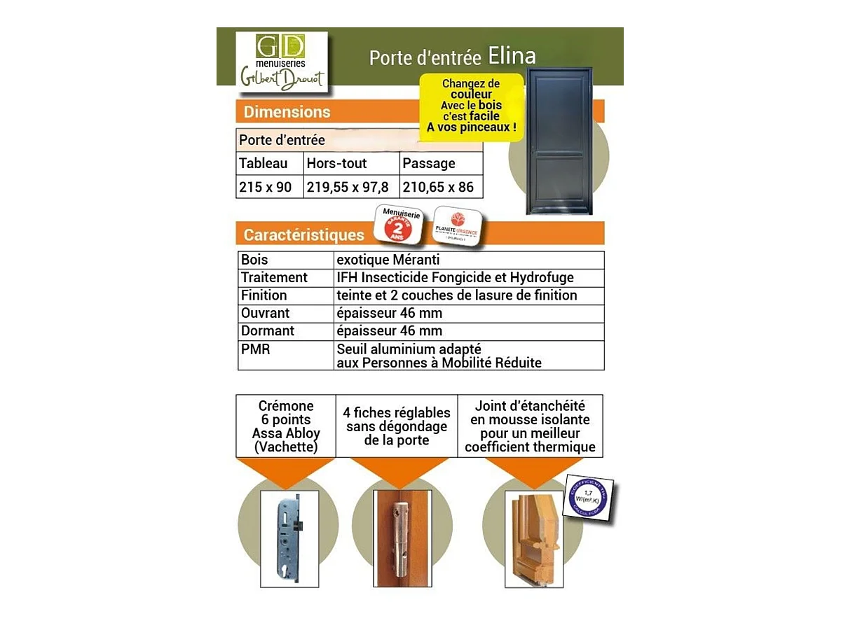 Porte d'entree Bois Pleine, Elina, H,215xl,90 p,gauche Cote Tableau