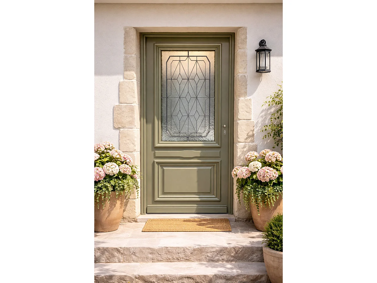 Porte D'entrée Bois Vitrée Canelle Vert Ral 7002, H.215xl.90 Côte Tableau P. Gauche Gd Menuiseries
