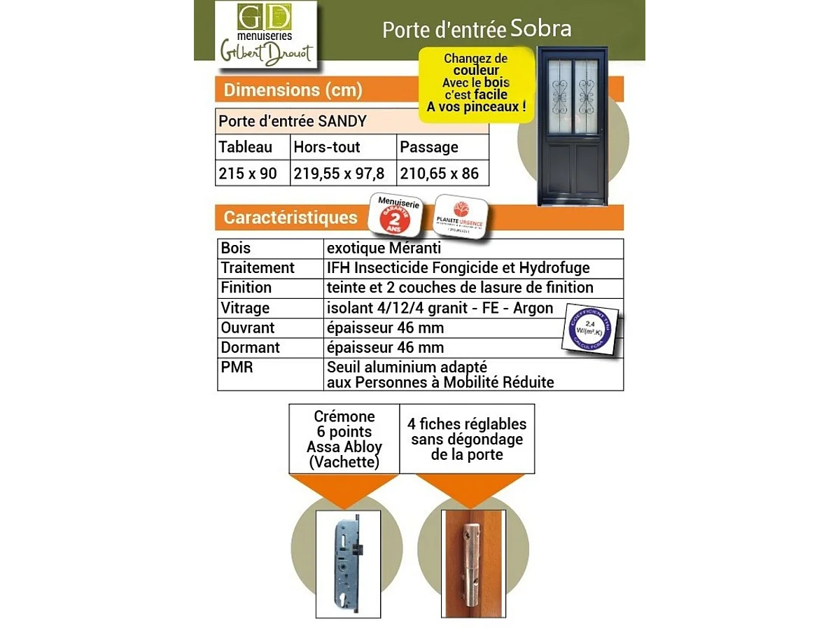Porte D'entrée Bois Vitrée Sobra, H215 X L90 Cm Côte Tableau P.gauche (poignée, Barillet Ref 010403fp) Gd Menuiseries