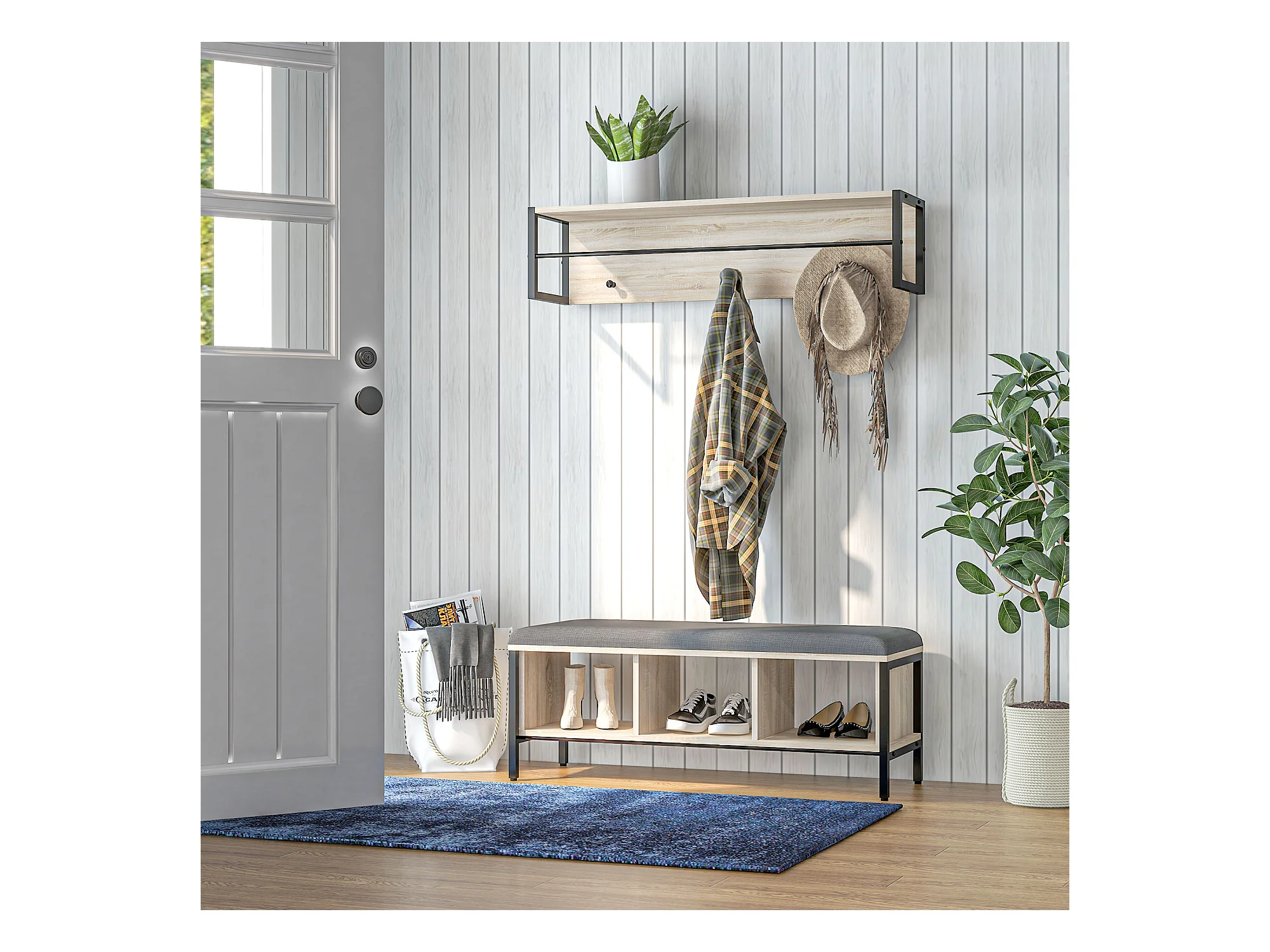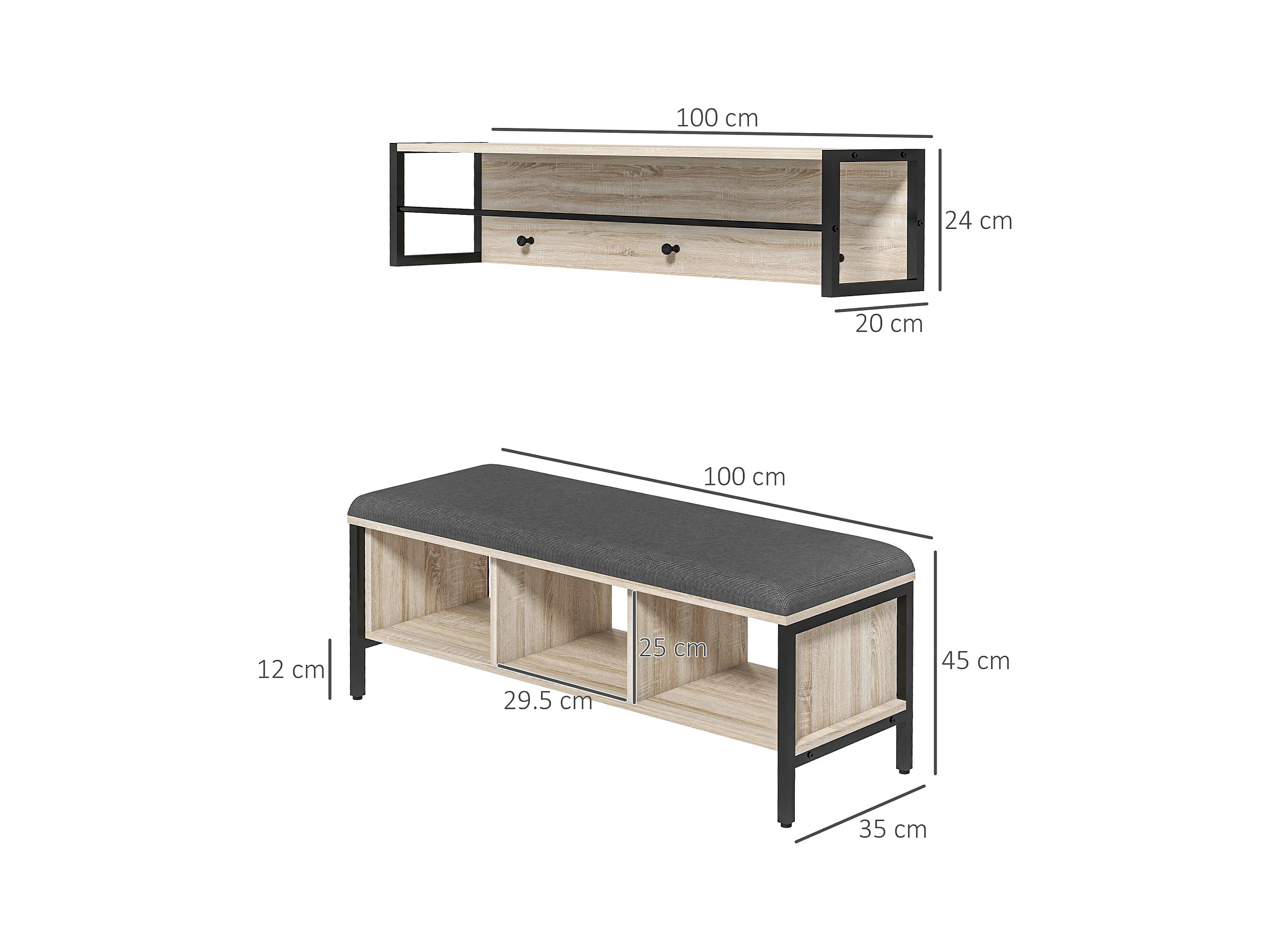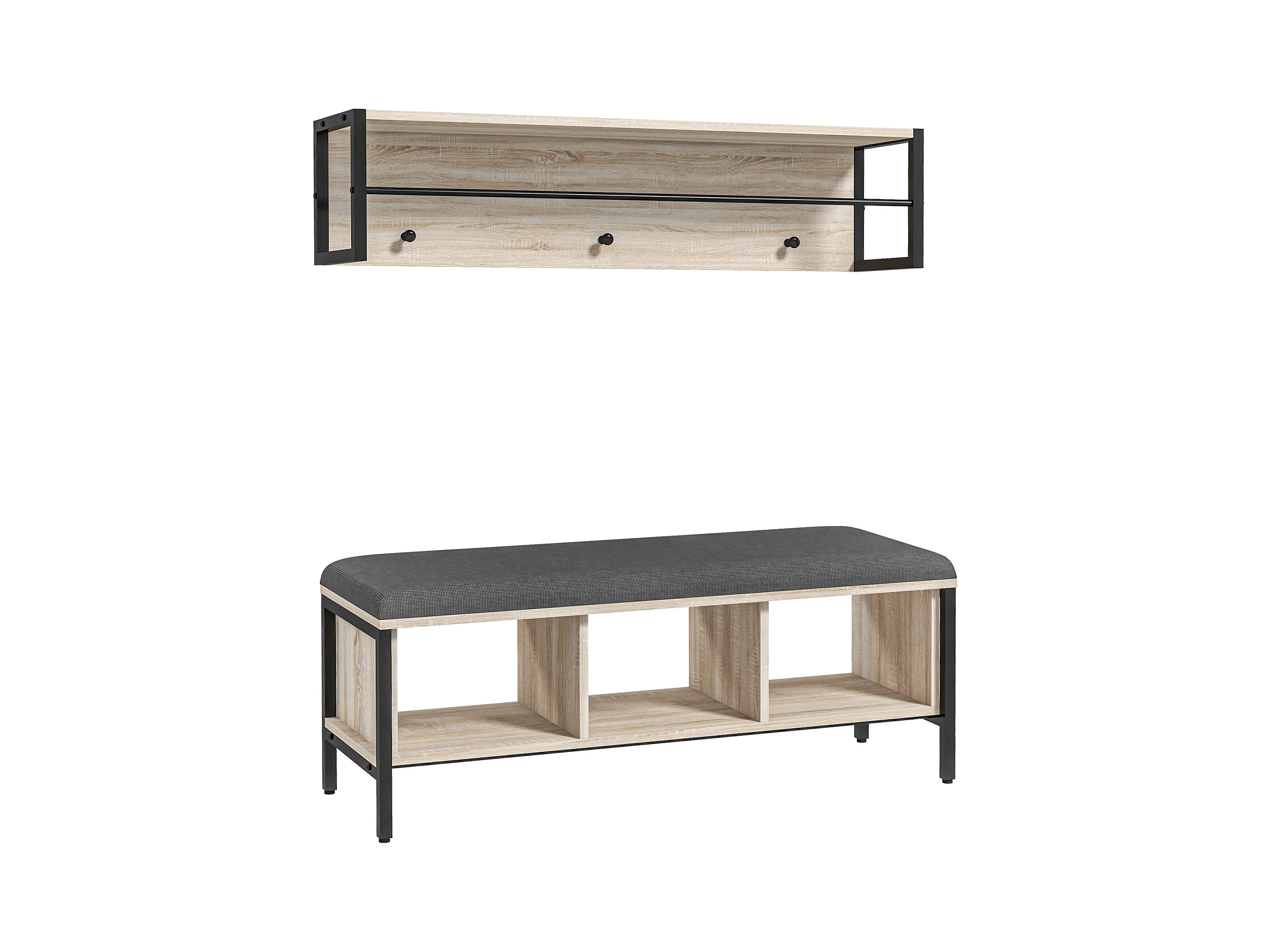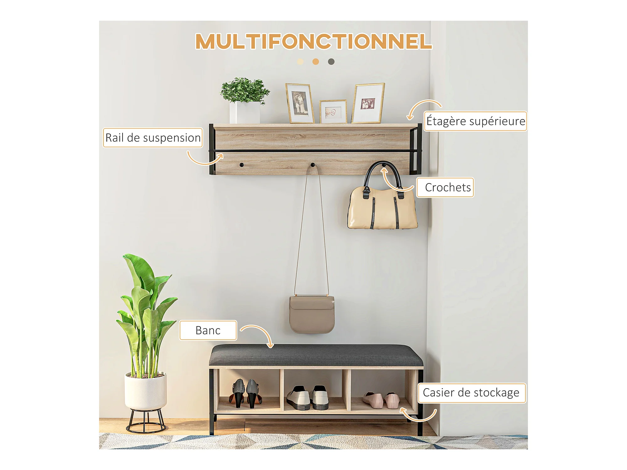 Porte-manteau mural vestiaire d'entrée banc à chaussures 3 compartiments 3 patères barre penderie acier noir aspect chêne clair