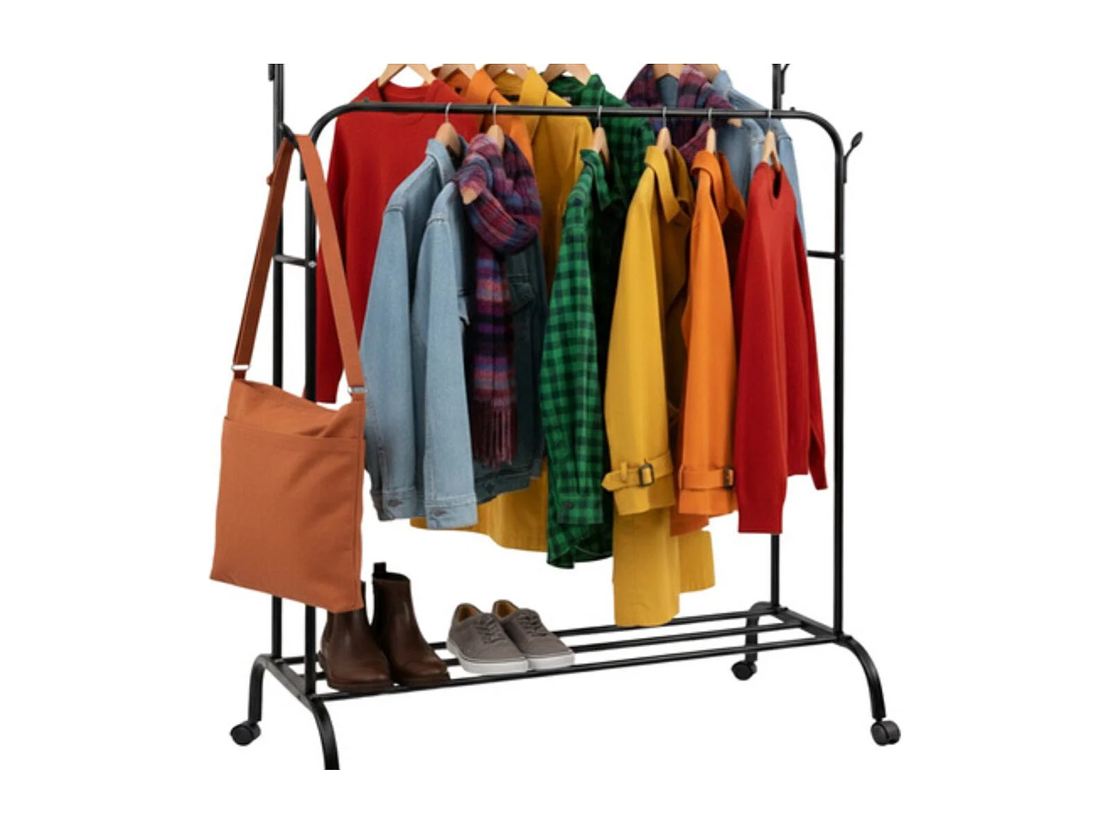 Porte Manteau Noir Sur Roulettes Avec Double Barre Et Étagère 150 x 110 x 57 cm