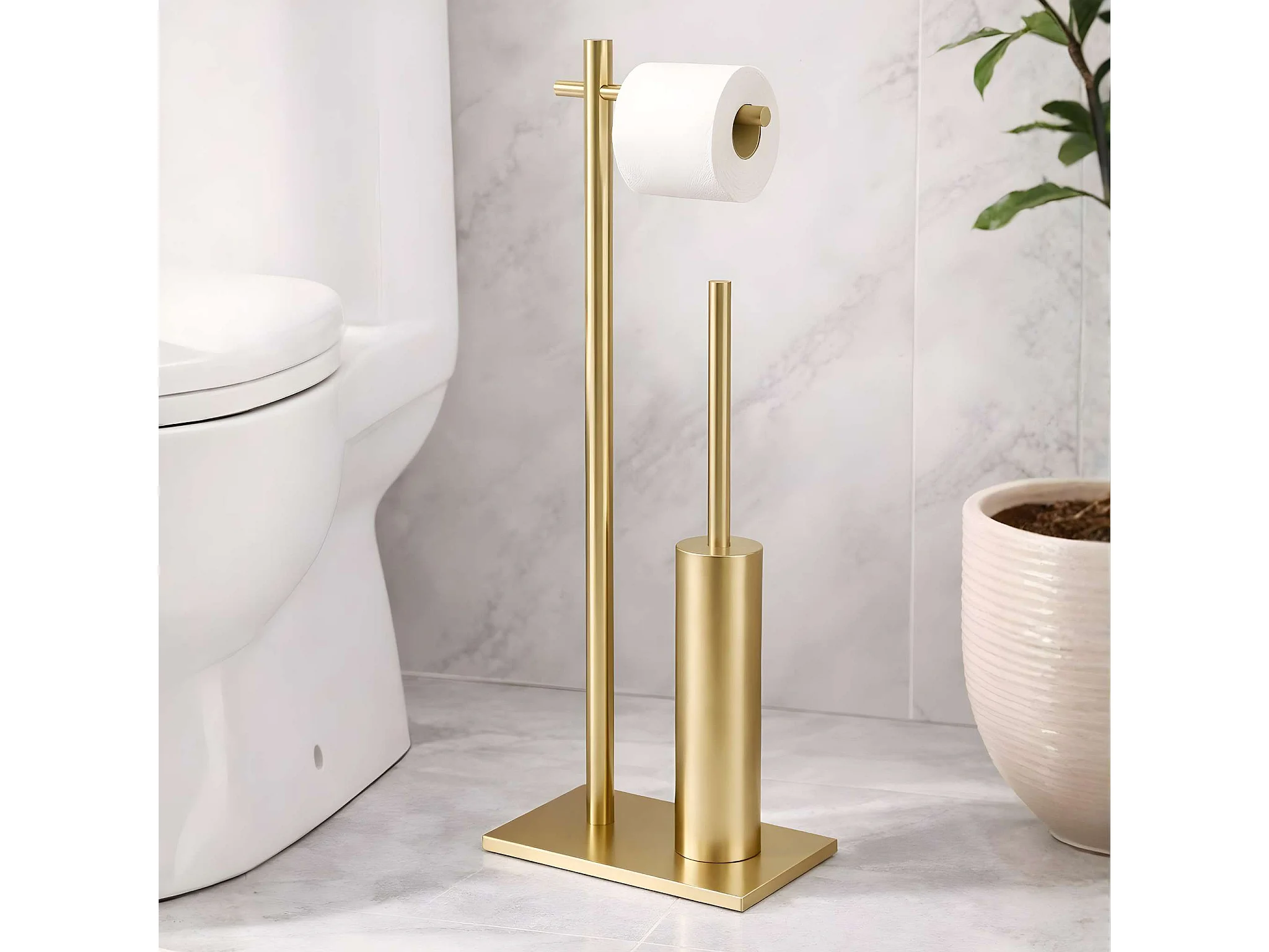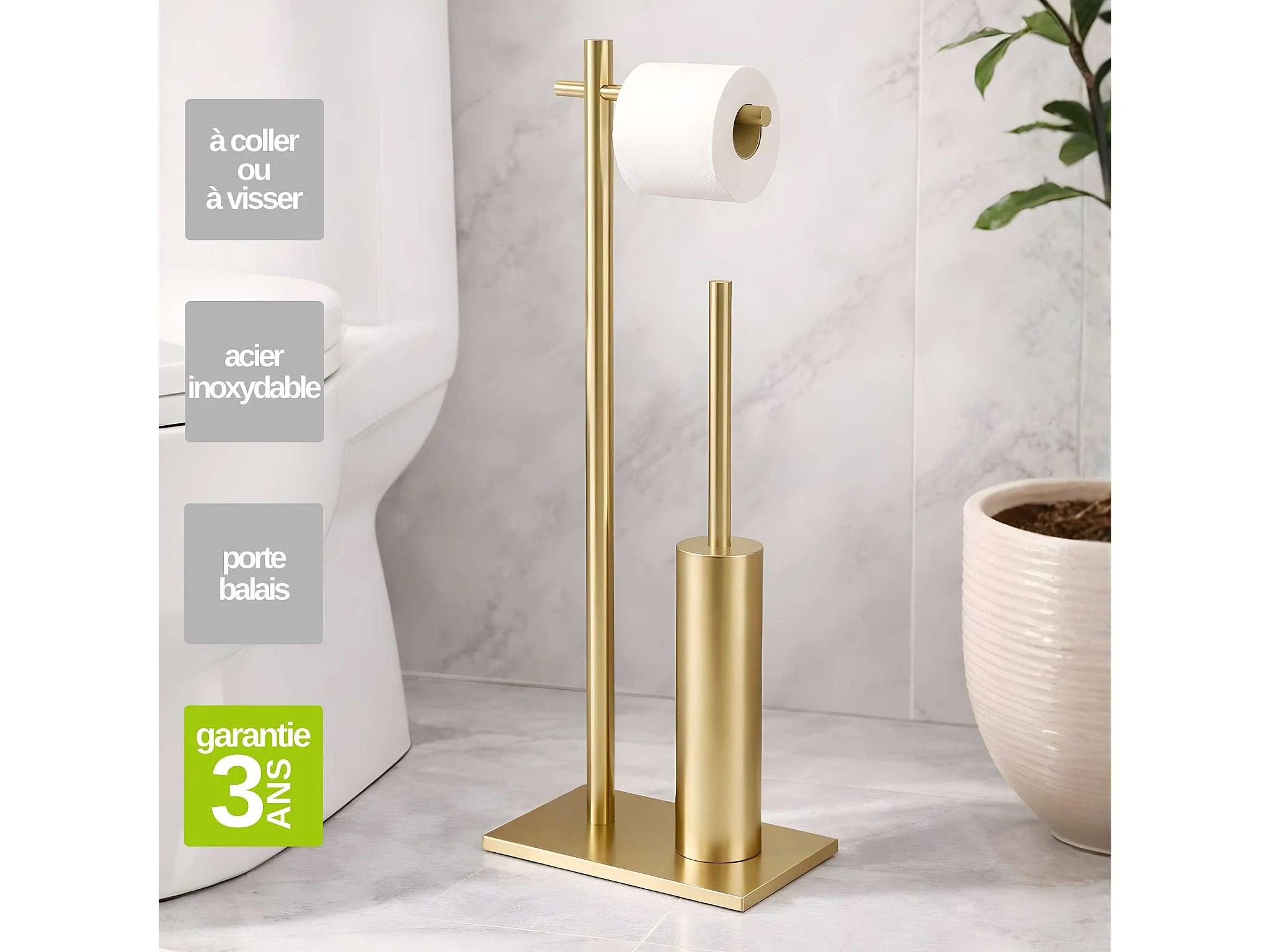 Porte papier toilette avec Porte-balai WC intégré - acier inoxydable S.304 or brossé - Fixation Collée ou Vissée
