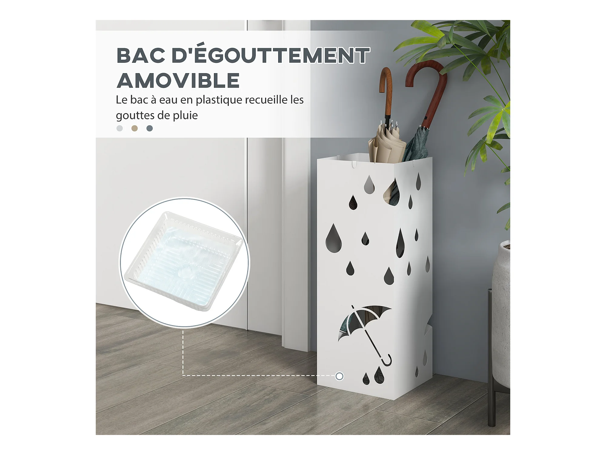 Porte-parapluie design - support à parapluie H. 41 cm - 4 crochets, bac à eau - acier blanc