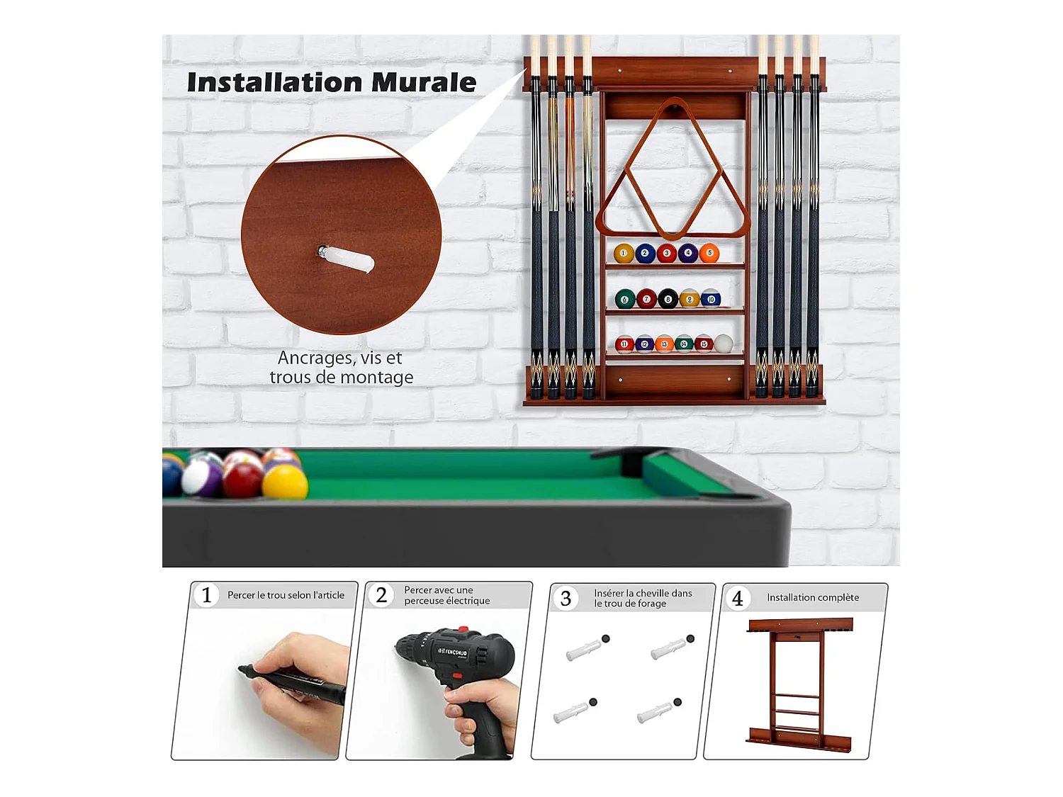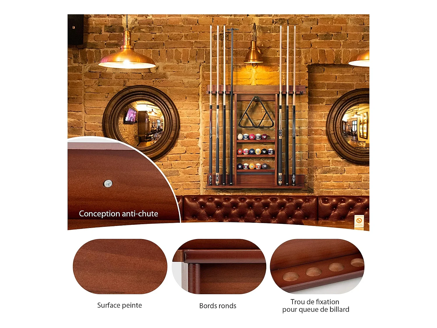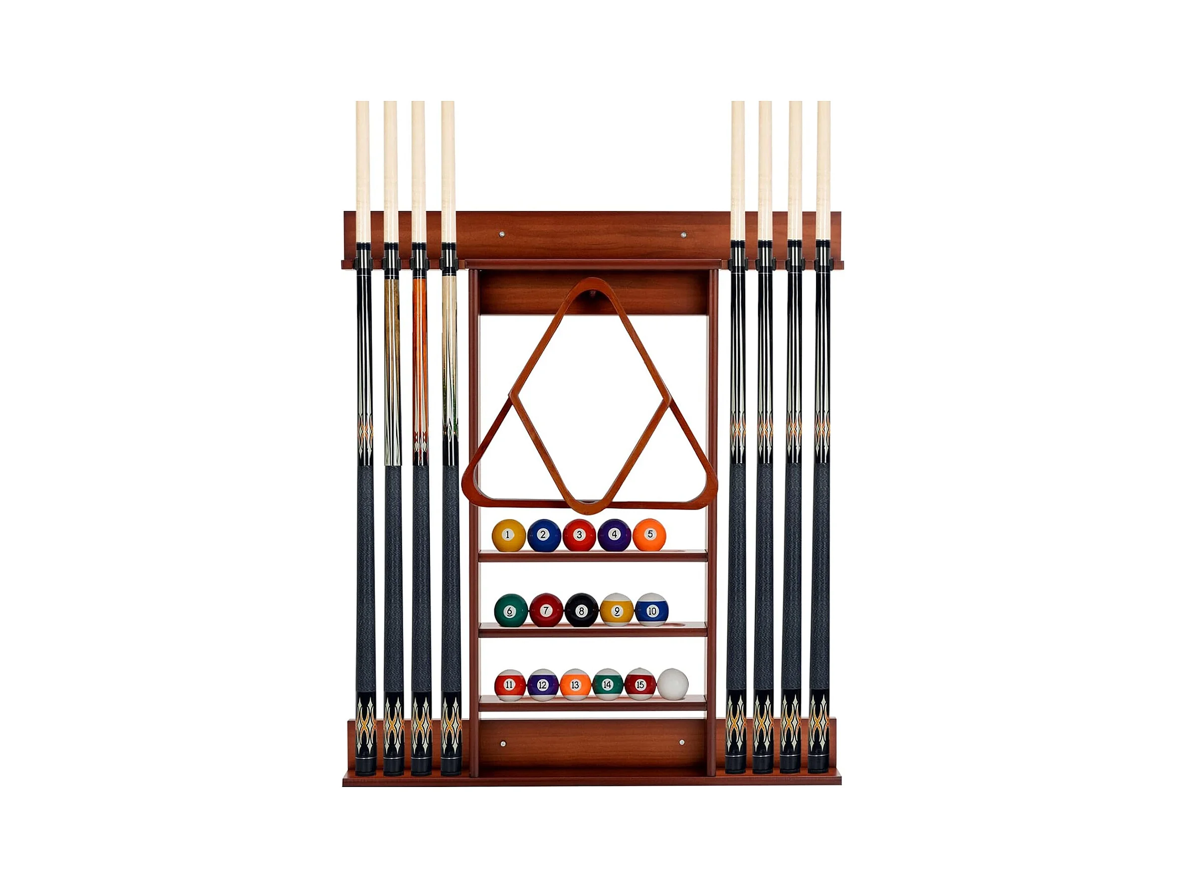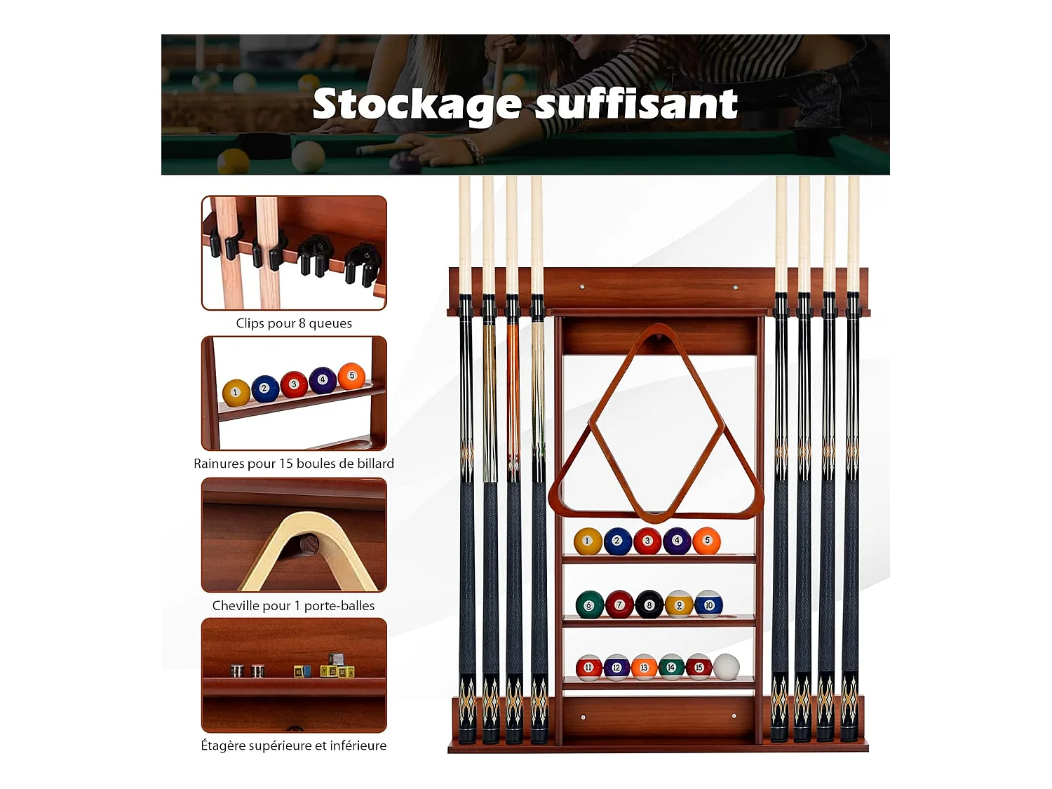 Porte-Queues de Billard Mural, Support de Billard 8 Queues et Rainures à 3 Niveaux 15 Porte-balles, 1 Porte-boules en Bois de Pin pour Salle de Billard, Club (Marron)