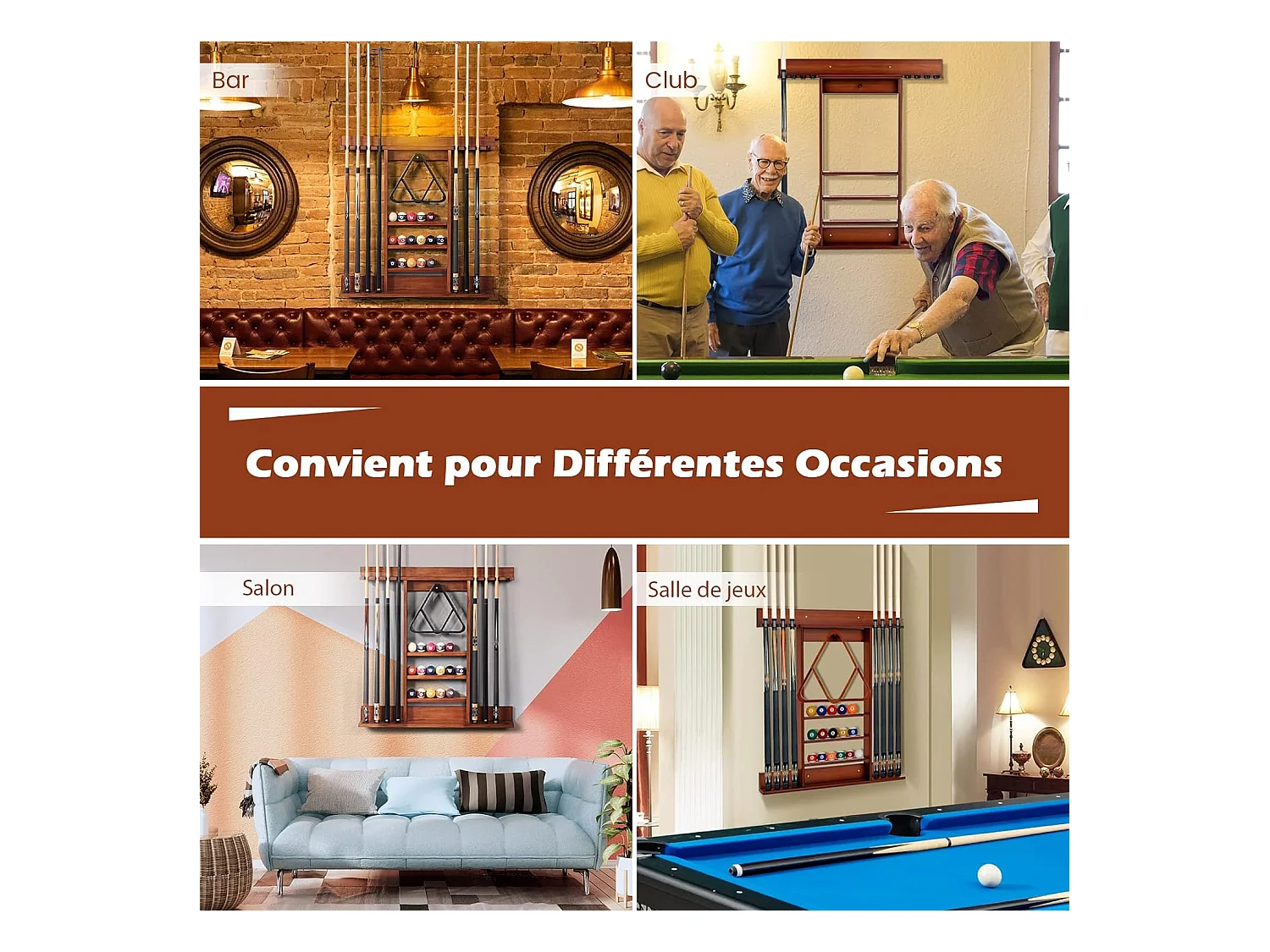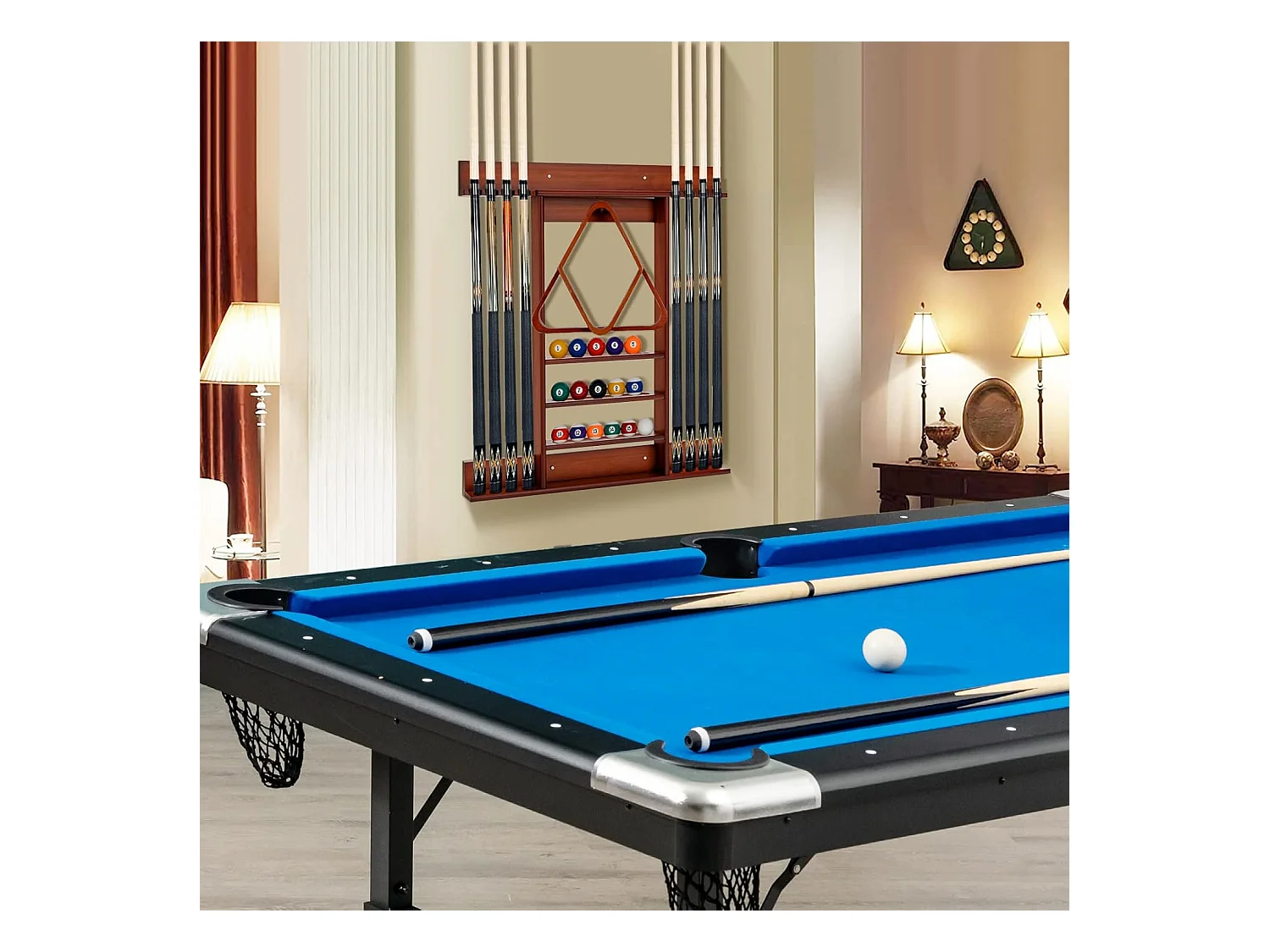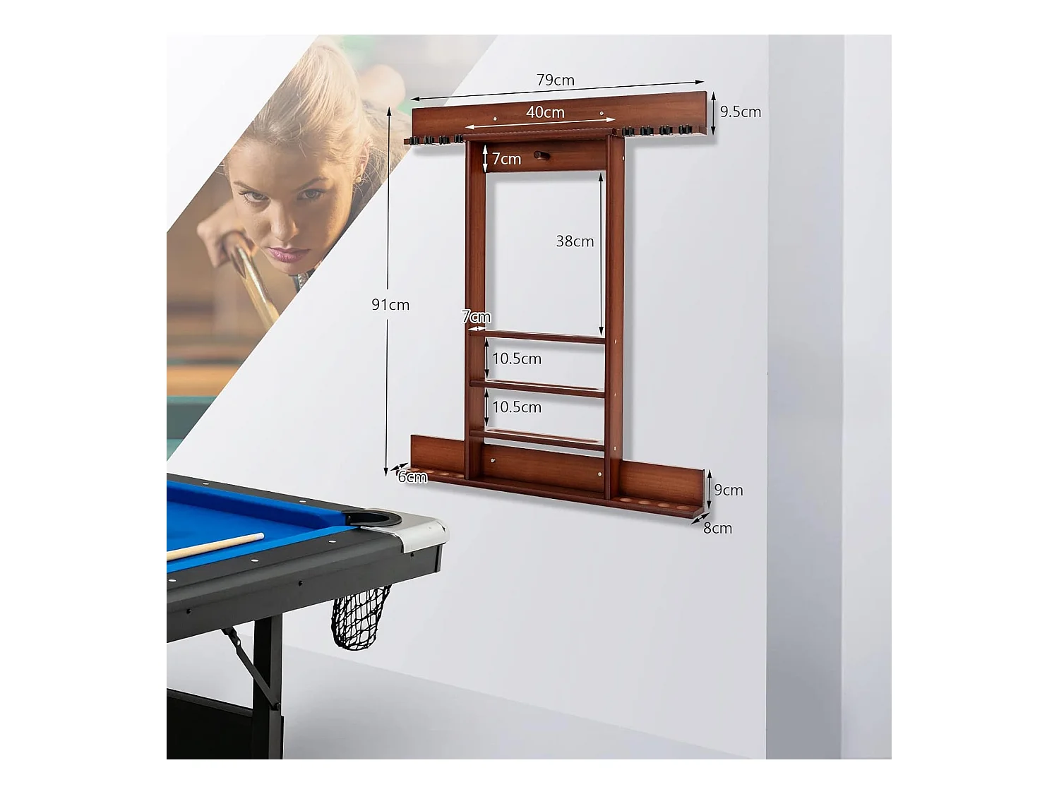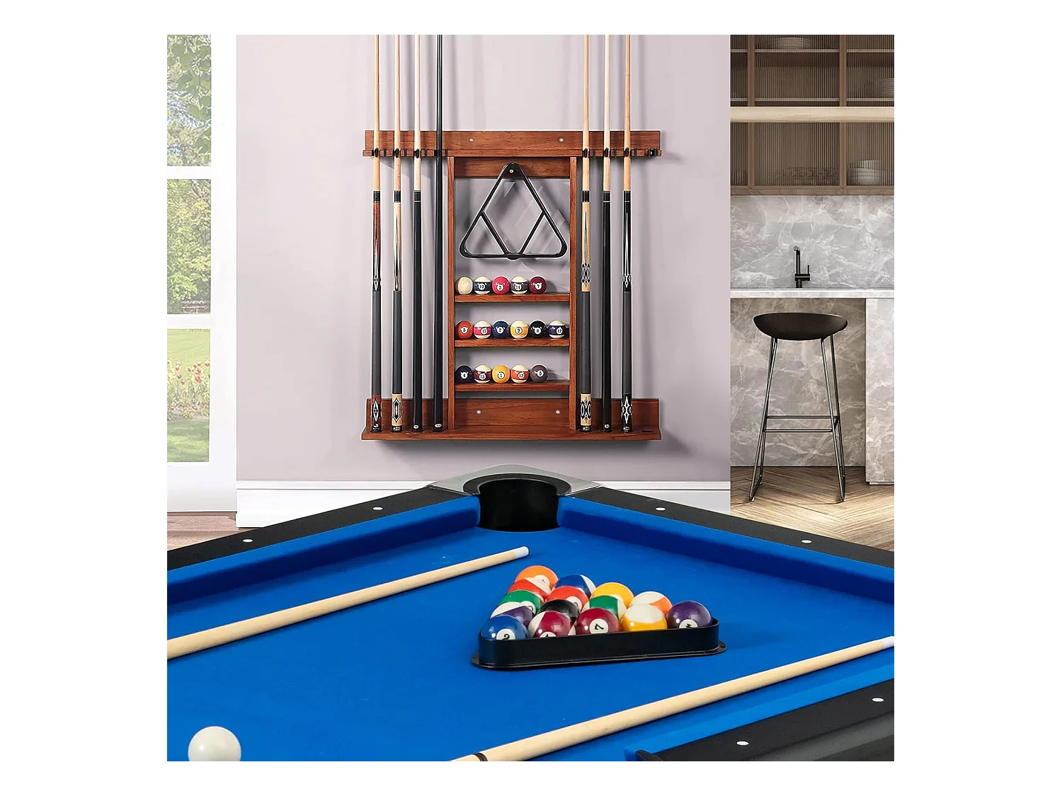Porte-Queues de Billard Mural, Support de Billard 8 Queues et Rainures à 3 Niveaux 15 Porte-balles, 1 Porte-boules en Bois de Pin pour Salle de Billard, Club (Marron)
