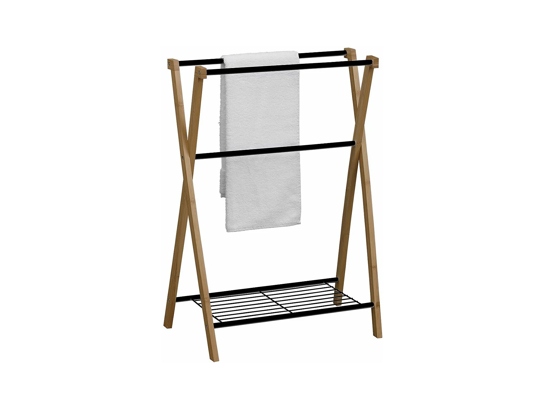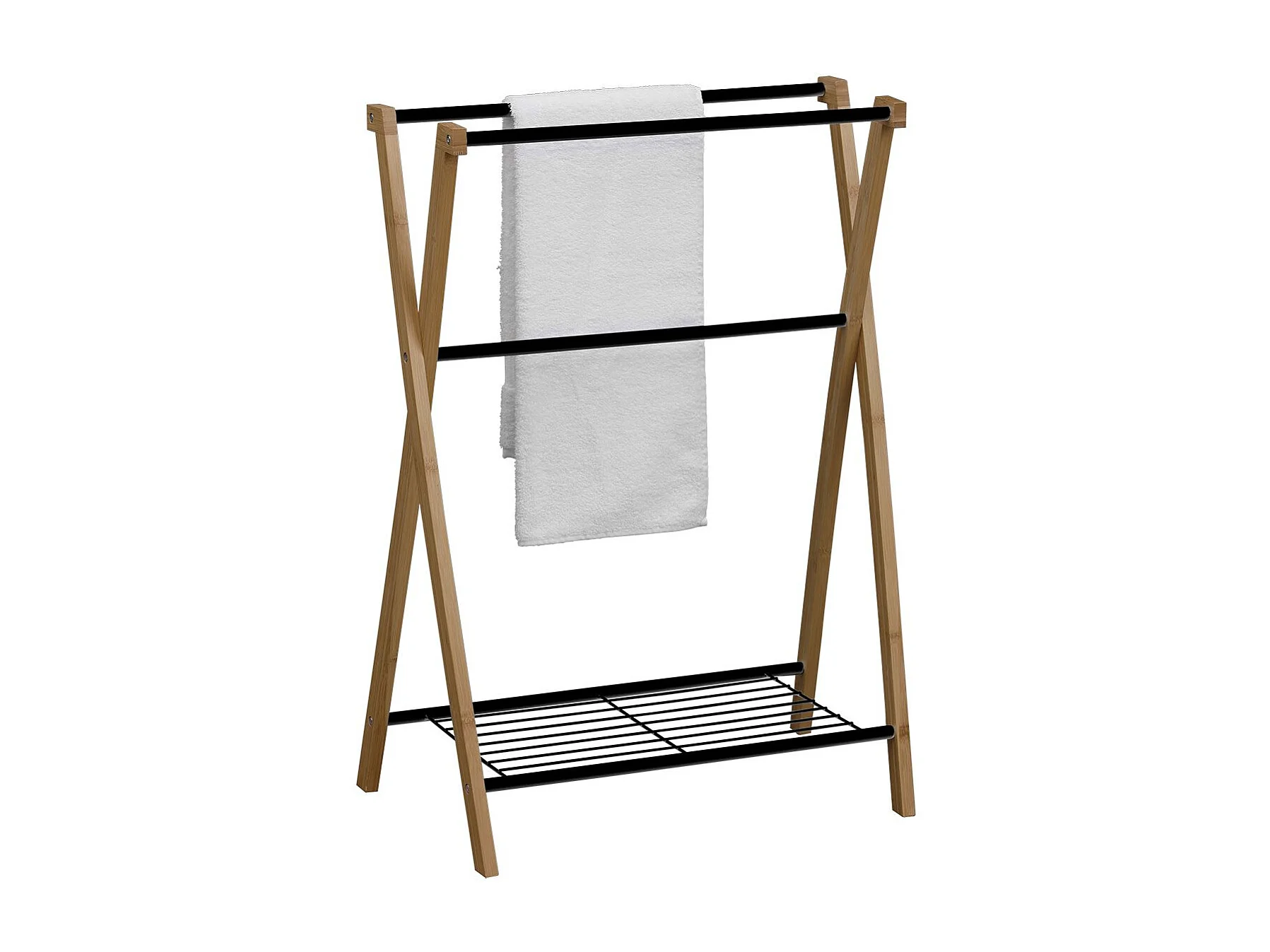 Porte-serviettes pliable 3 barres de suspension et 3 étagères en bambou pour salle de bains, structure métal noir