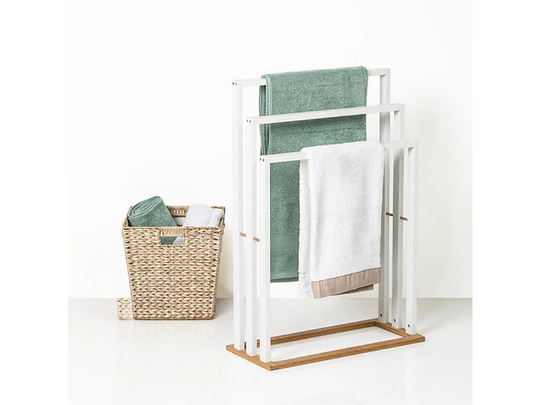 Porte-serviettes 3 Barres et 1 Tablette en Bambou et Métal Blanc H 86 cm
