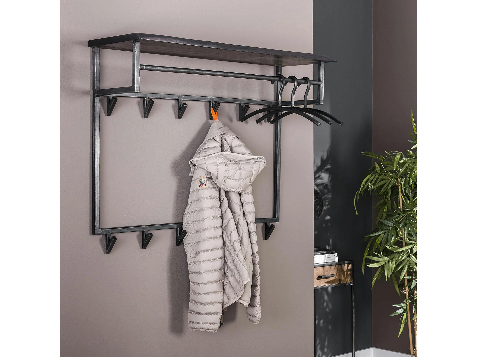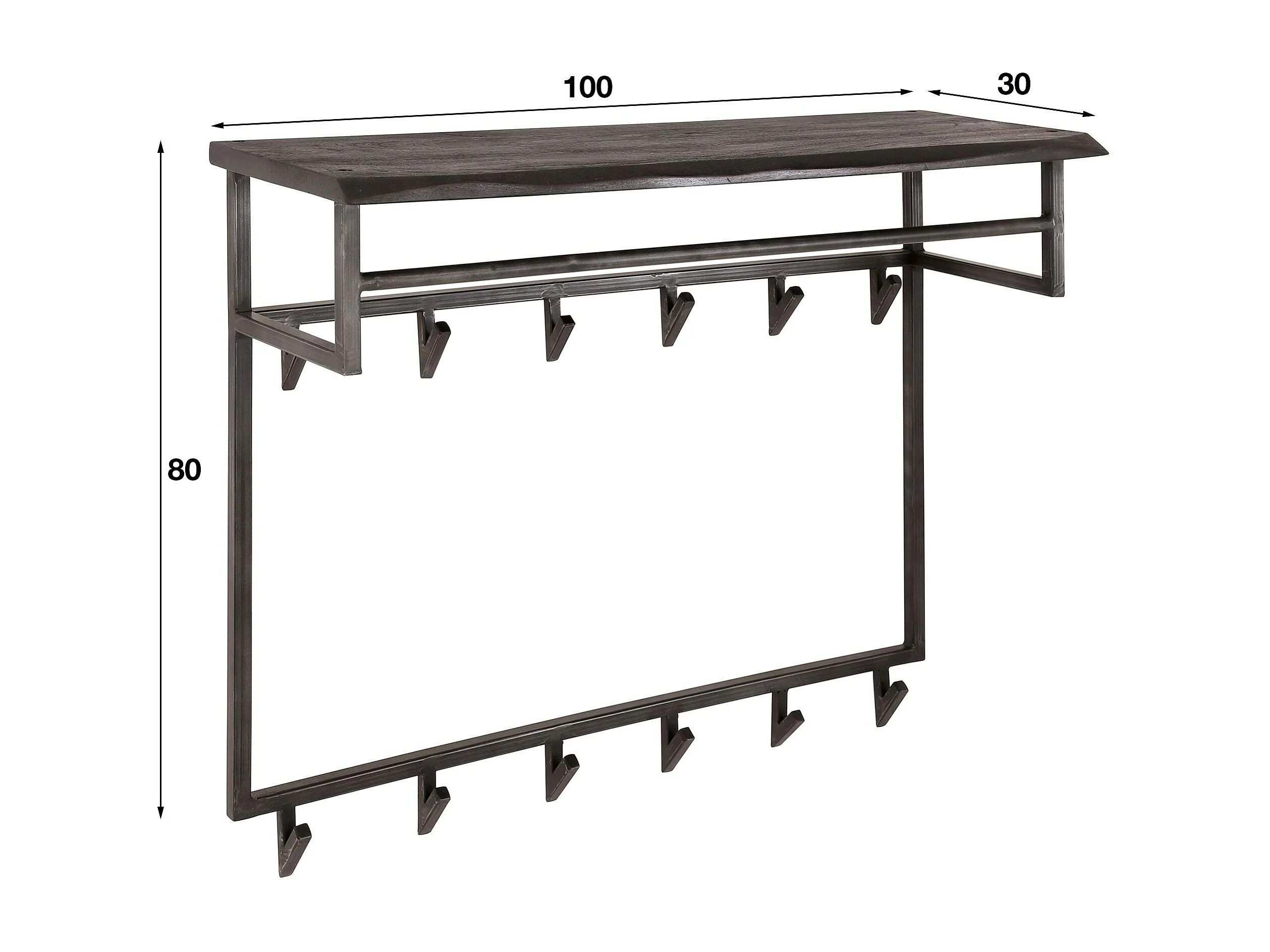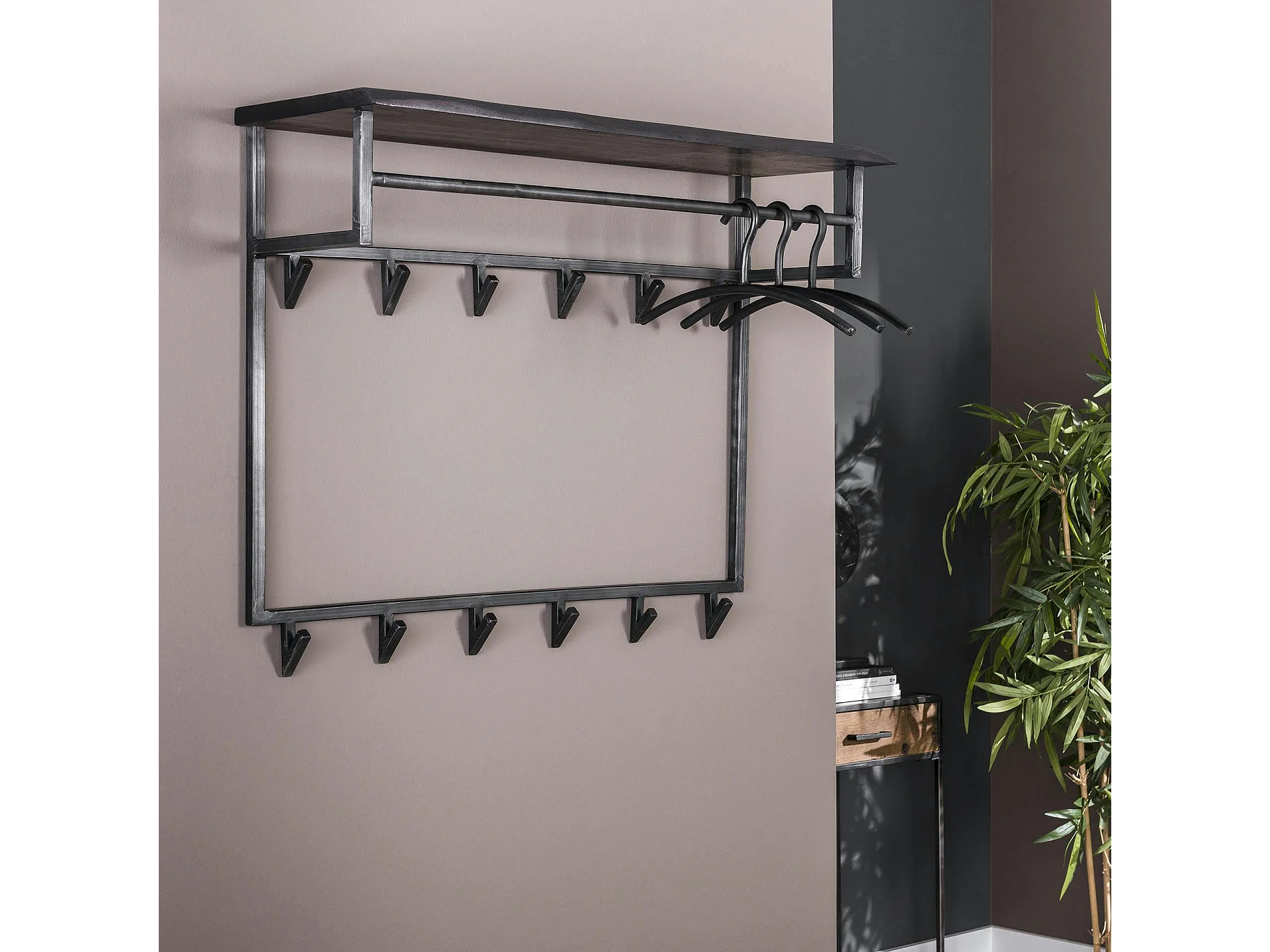 Portemanteau mural noir 12 crochets 1 étagère bois MELBOURNE