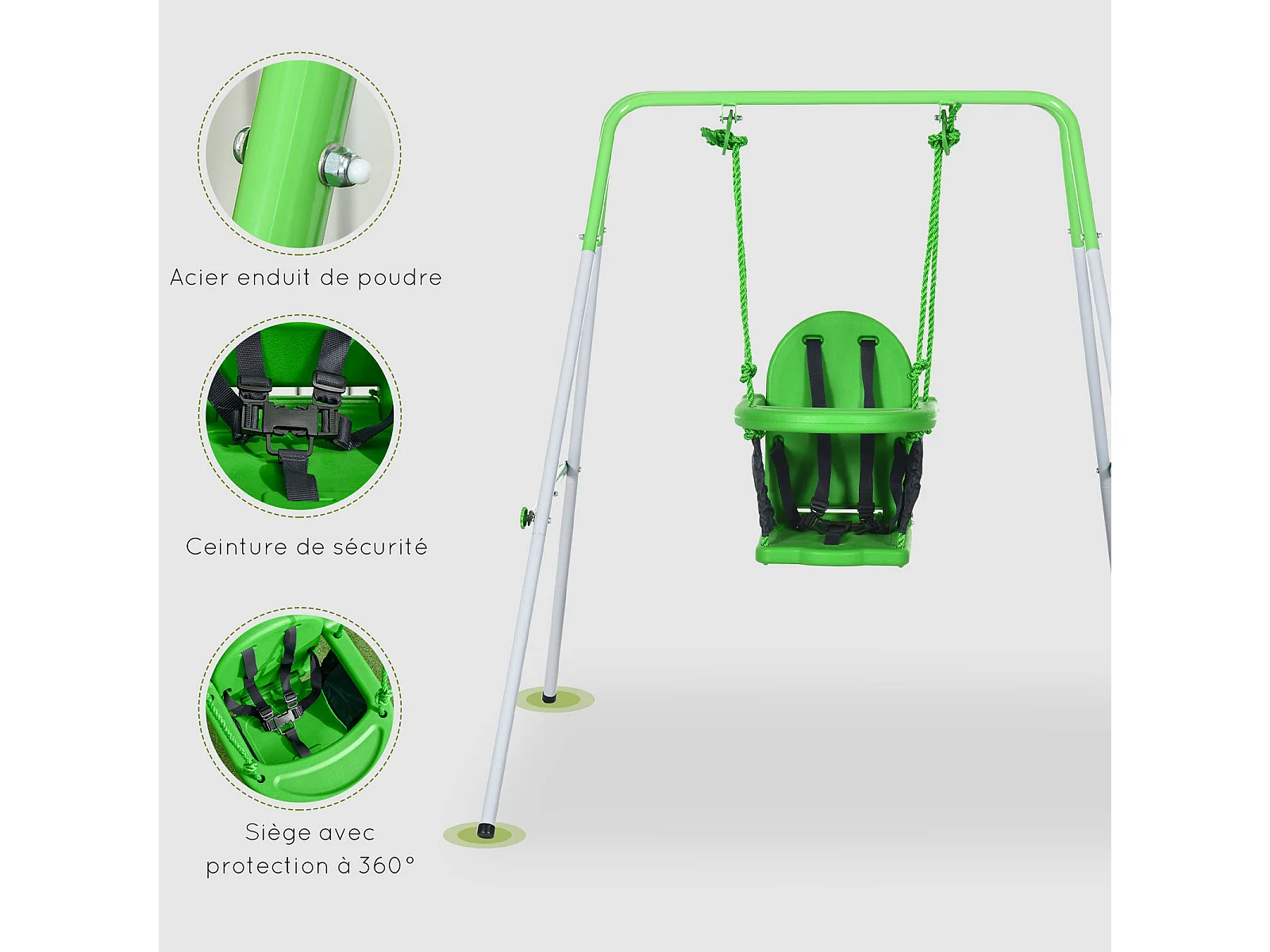 Portique balançoire enfant 6-36 mois - siège haut, accoudoirs, ceinture sécurité 2 points, barre protection - métal époxy blanc vert
