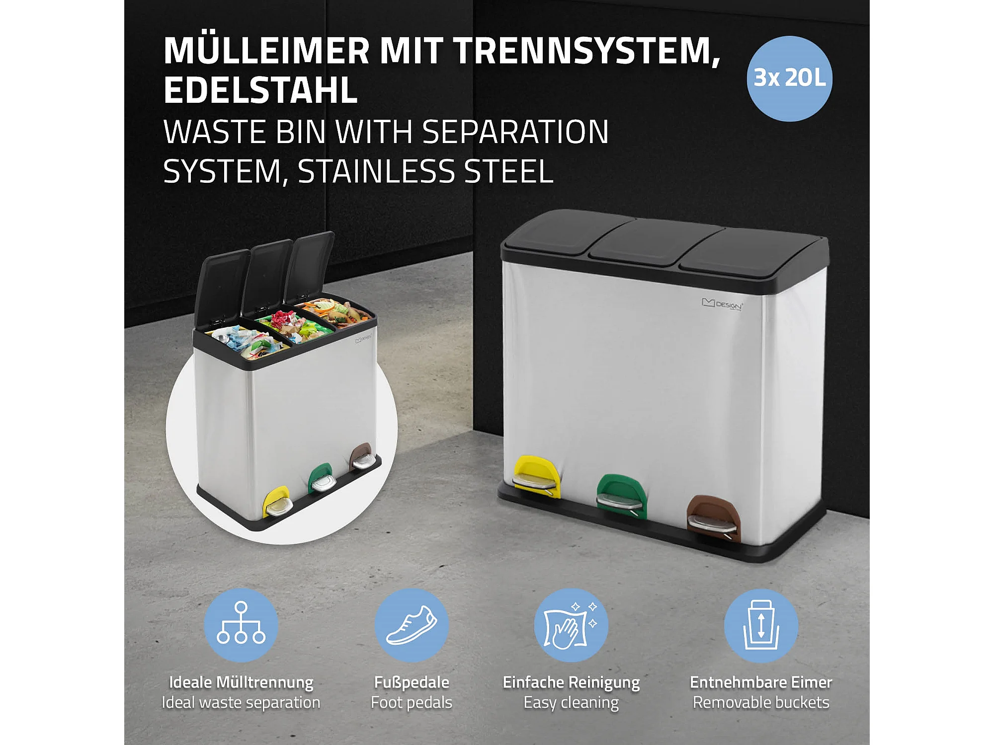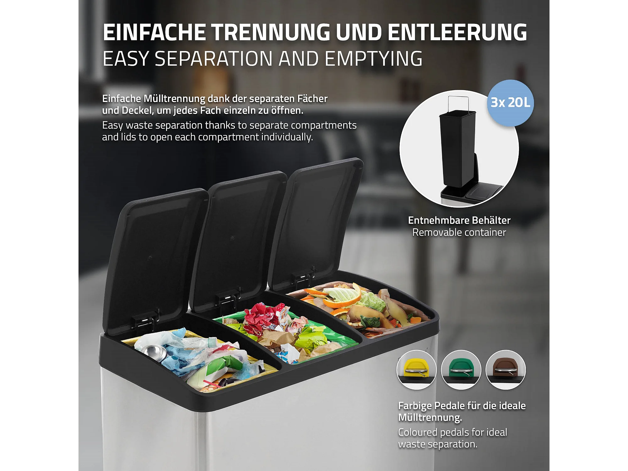 Poubelle cuisine à pédale tri des déchets avec 3 compartiments 3x20L argent 60L