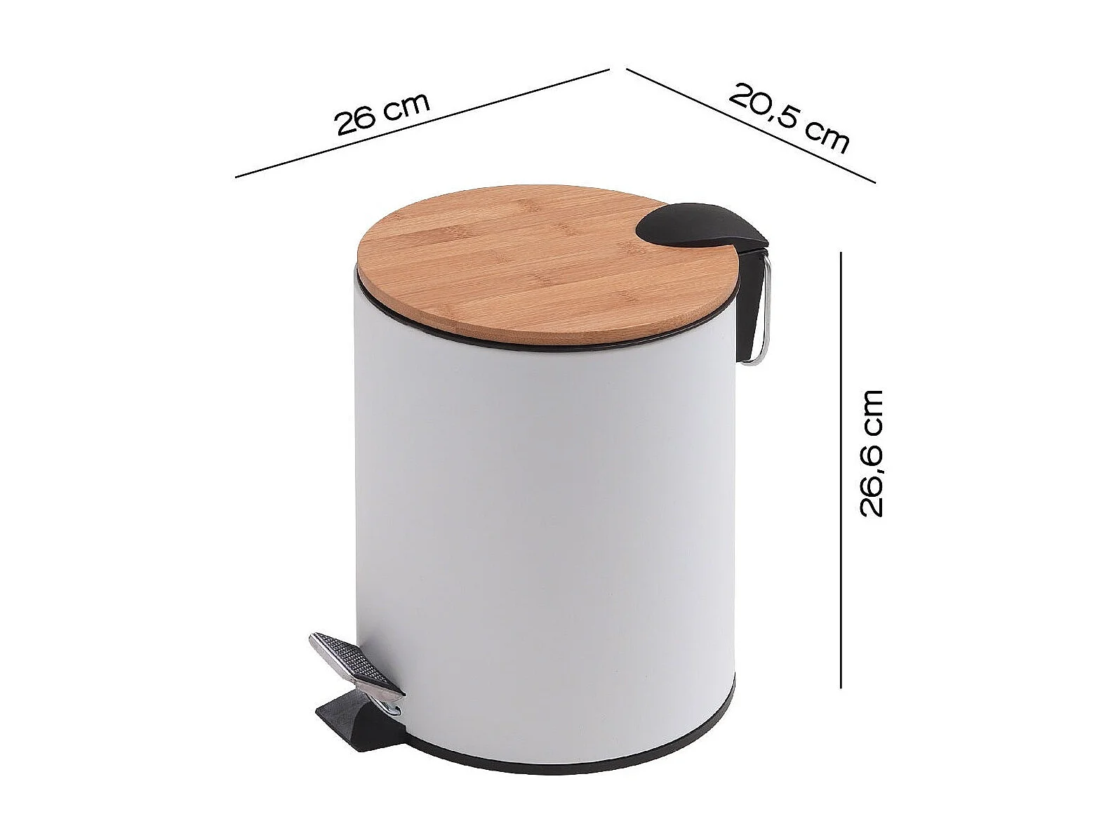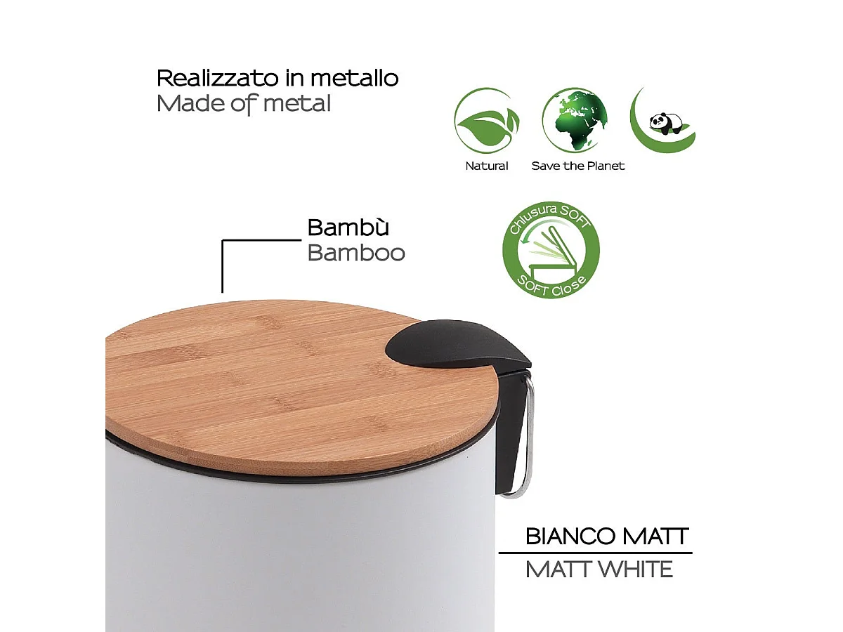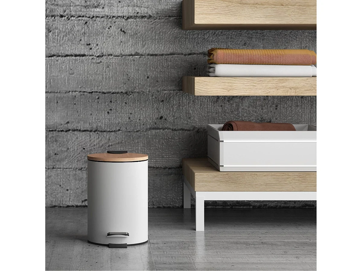 Poubelle De Salle De Bains Ronde De 5 Litres À Pédale, Blanche/Fermeture Douce, En Métal Et Bambou | Ortensia