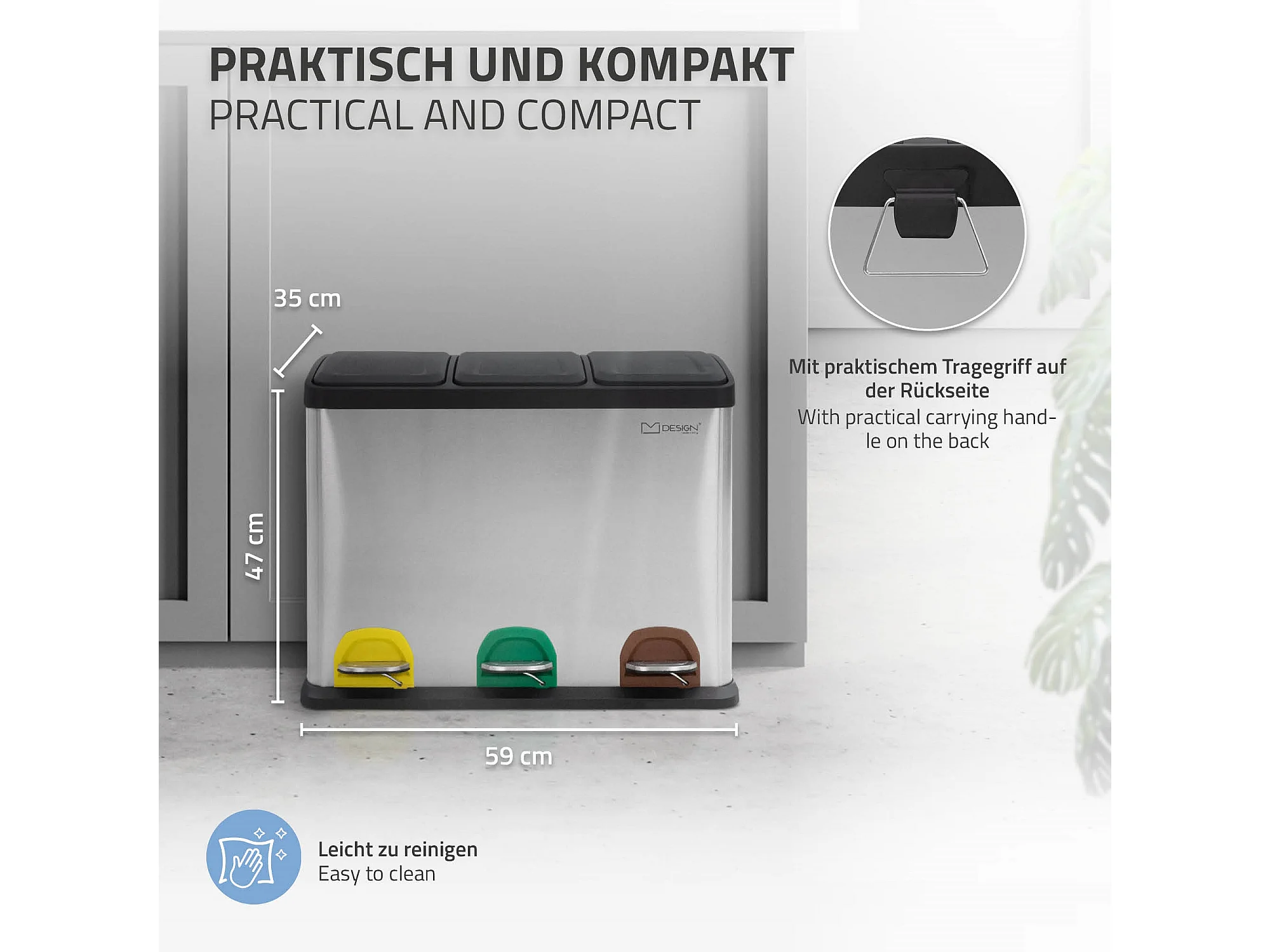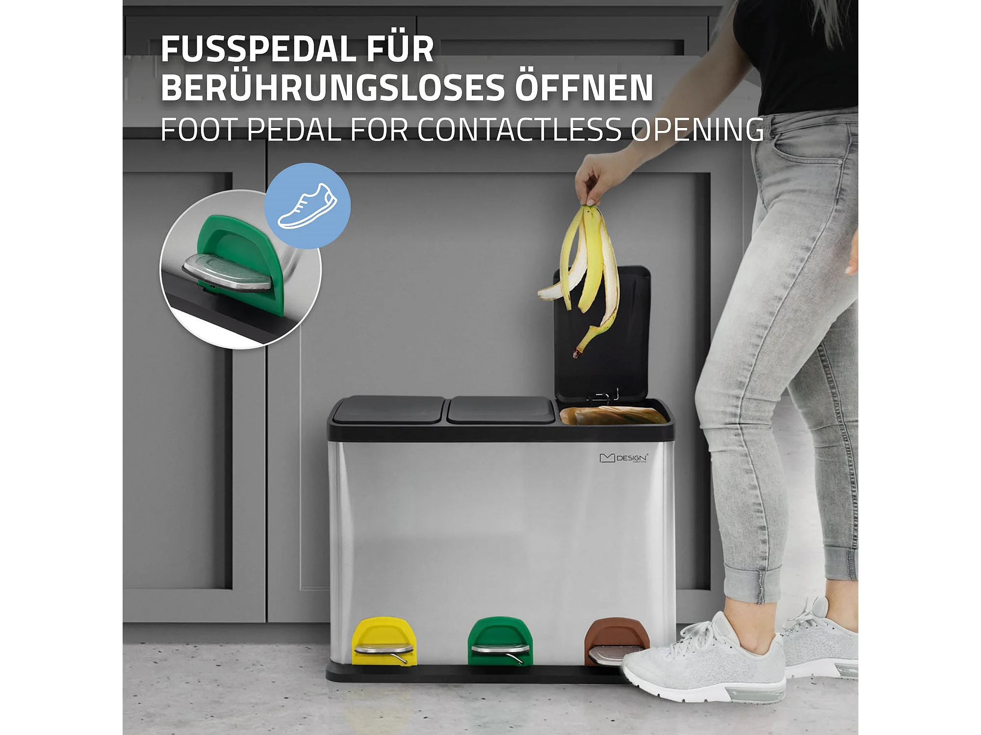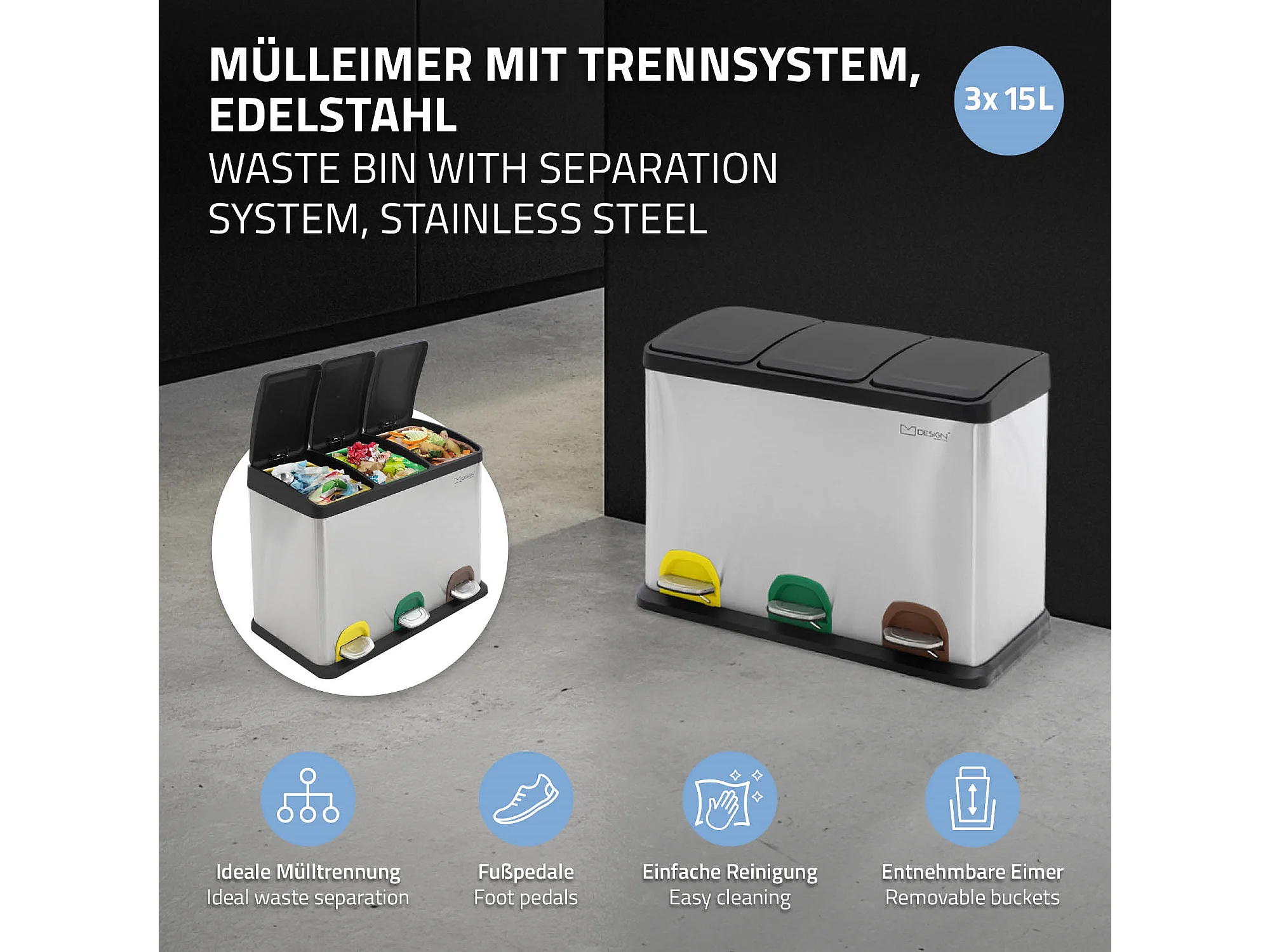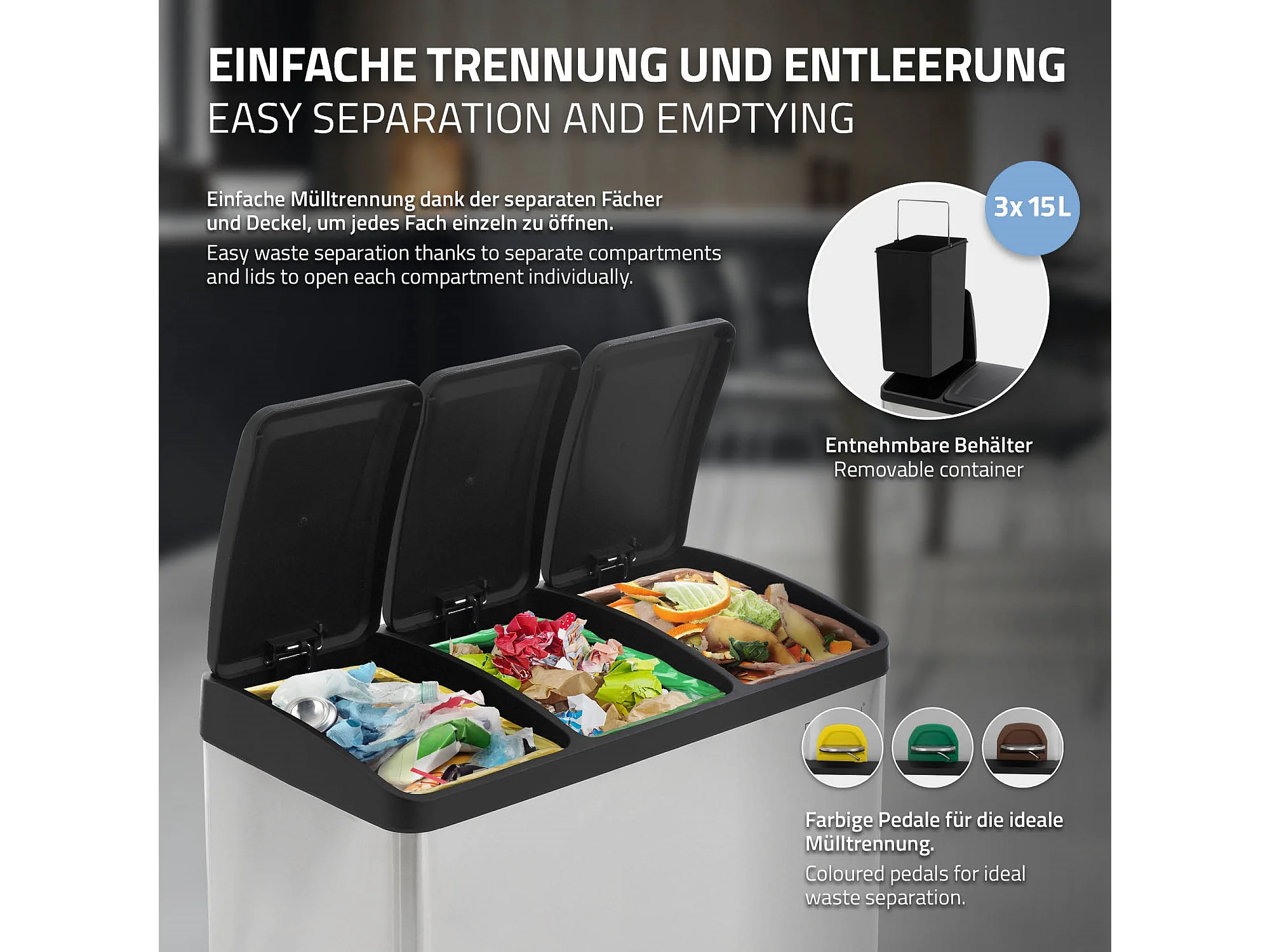 Poubelle triple cuisine à pédale tri déchets ménagers 3 bacs 3x15L argentée 45L