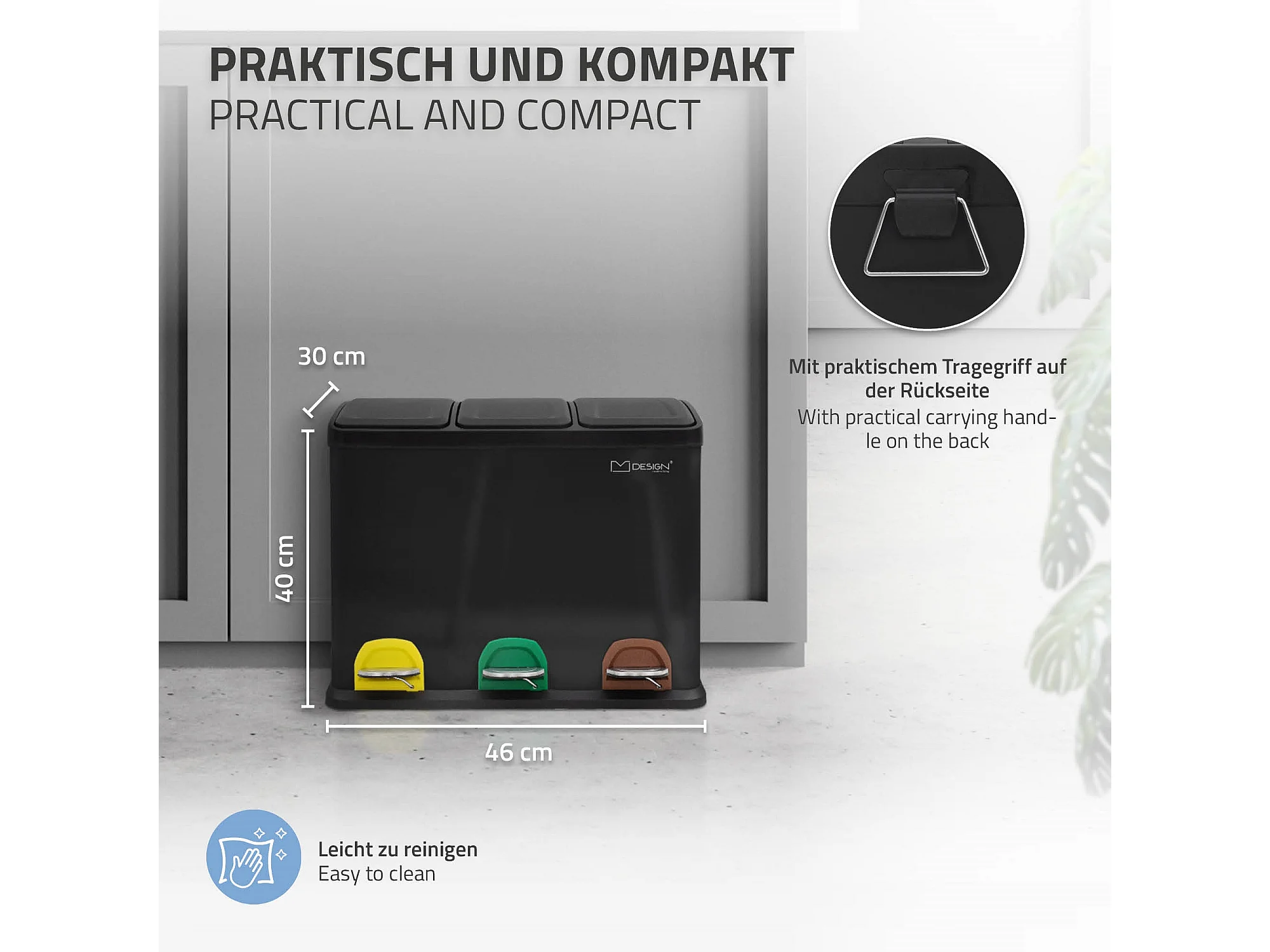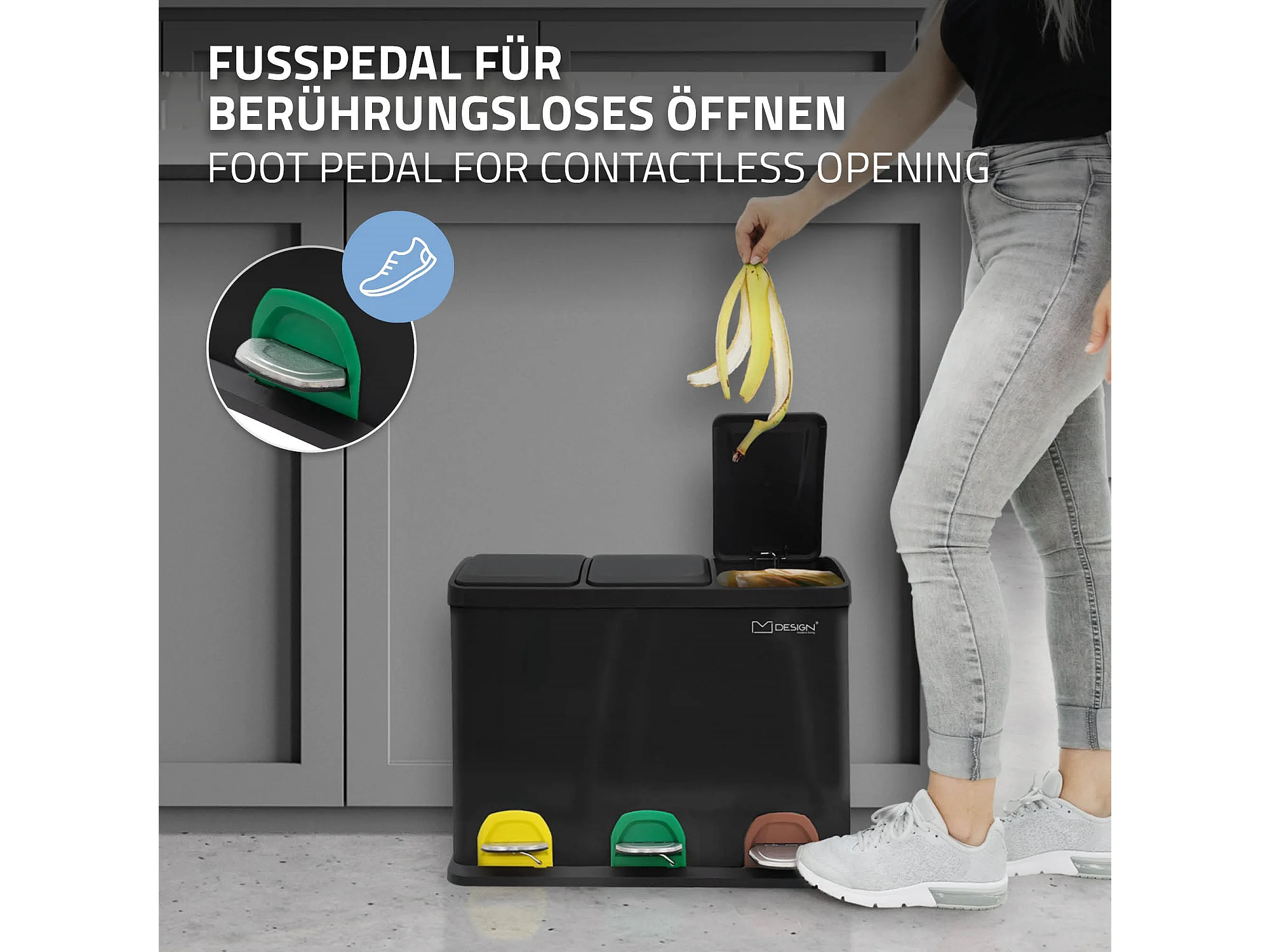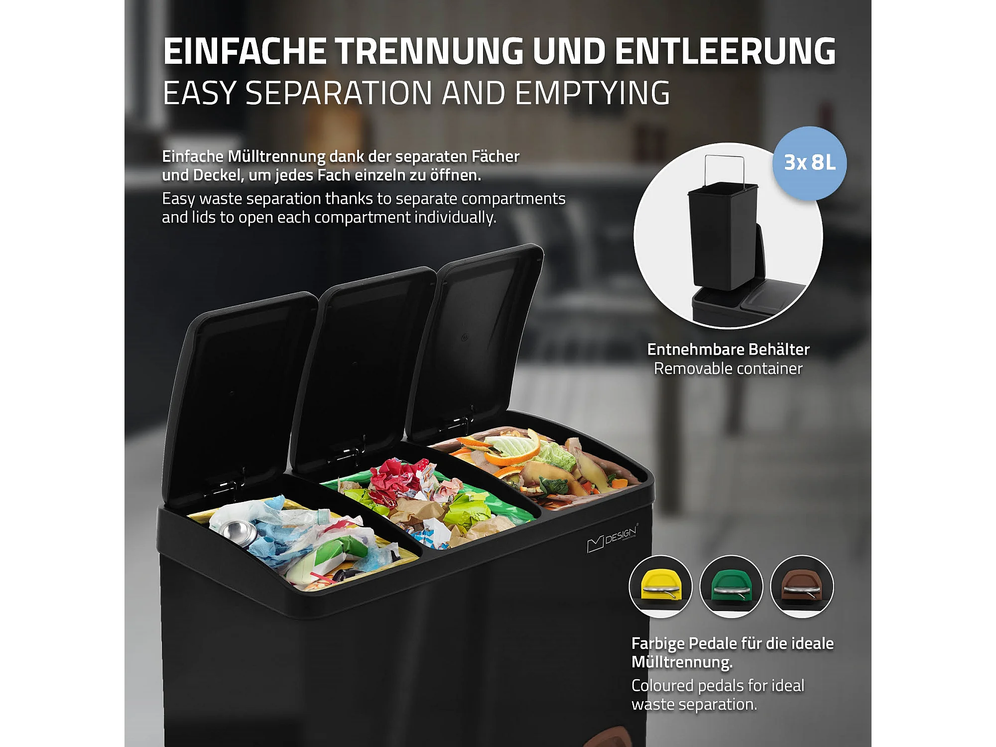 Poubelle triple cuisine à pédale tri déchets ménagers 3 bacs 3x8 L noir 24L