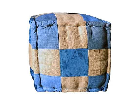 Pouf carré en patchwork jeans damier bleu et beige vintage - DENIM