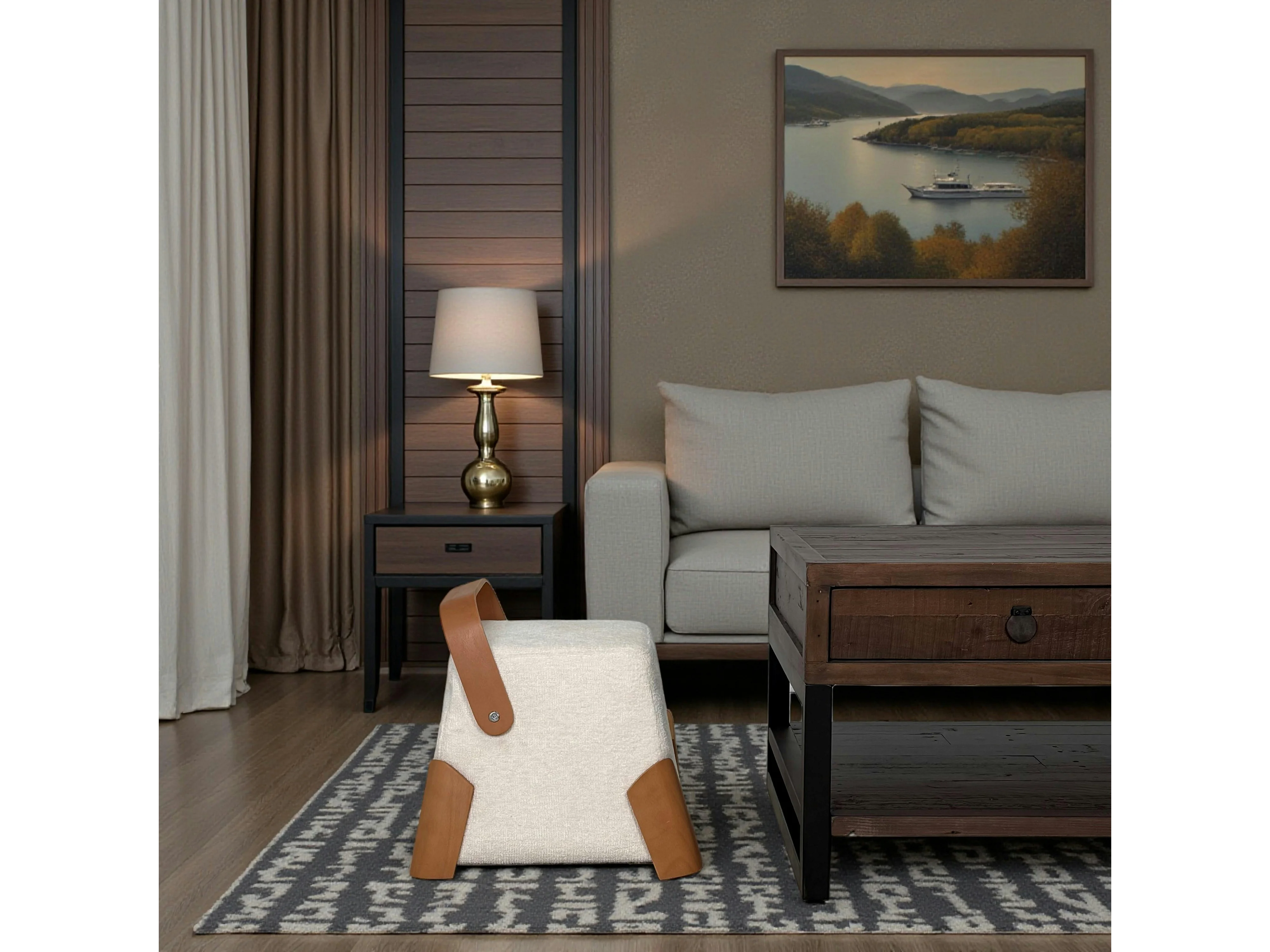 Pouf design blanc avec poignée en bois IENA