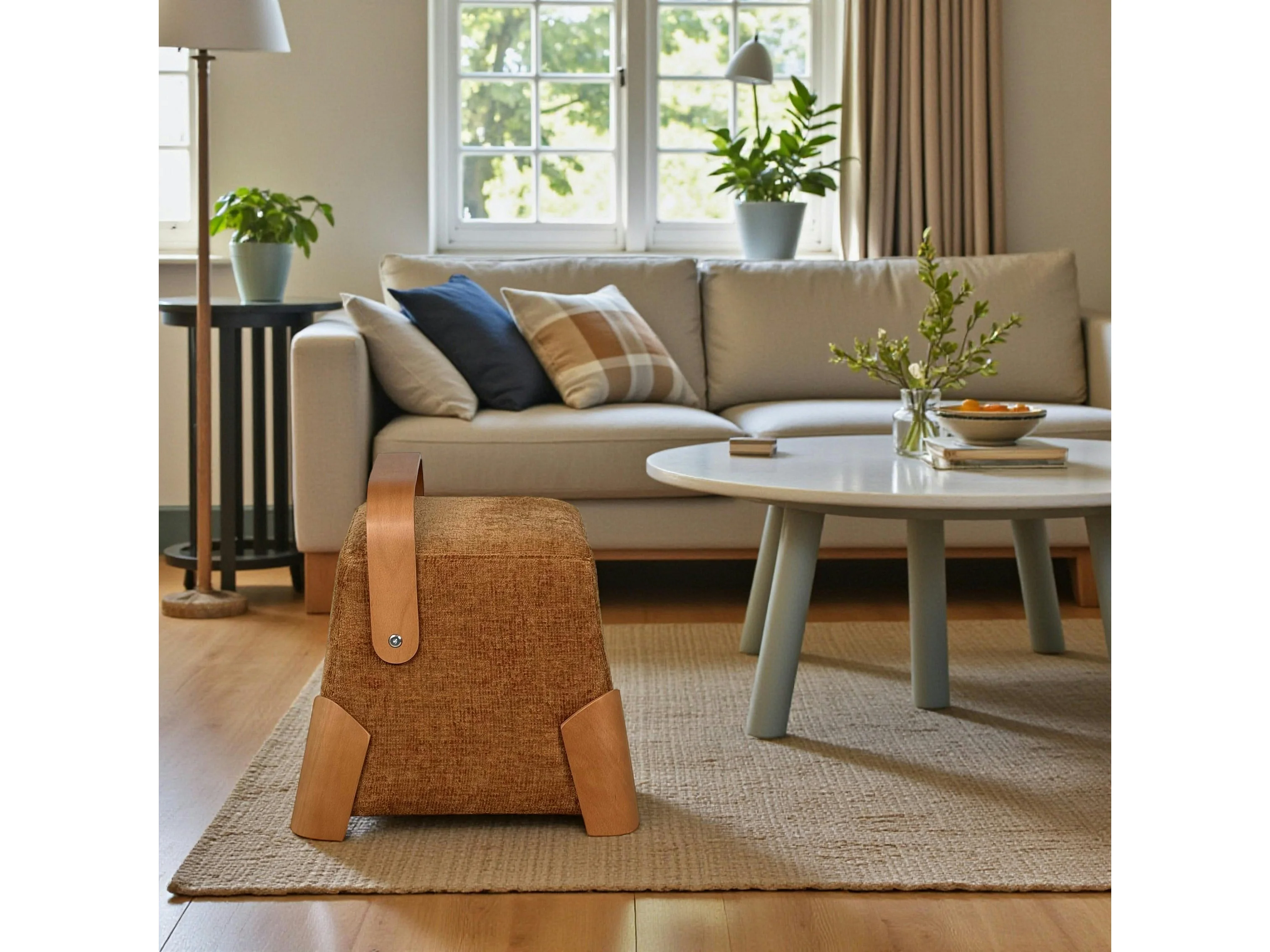 Pouf design moutarde avec poignée en bois IENA