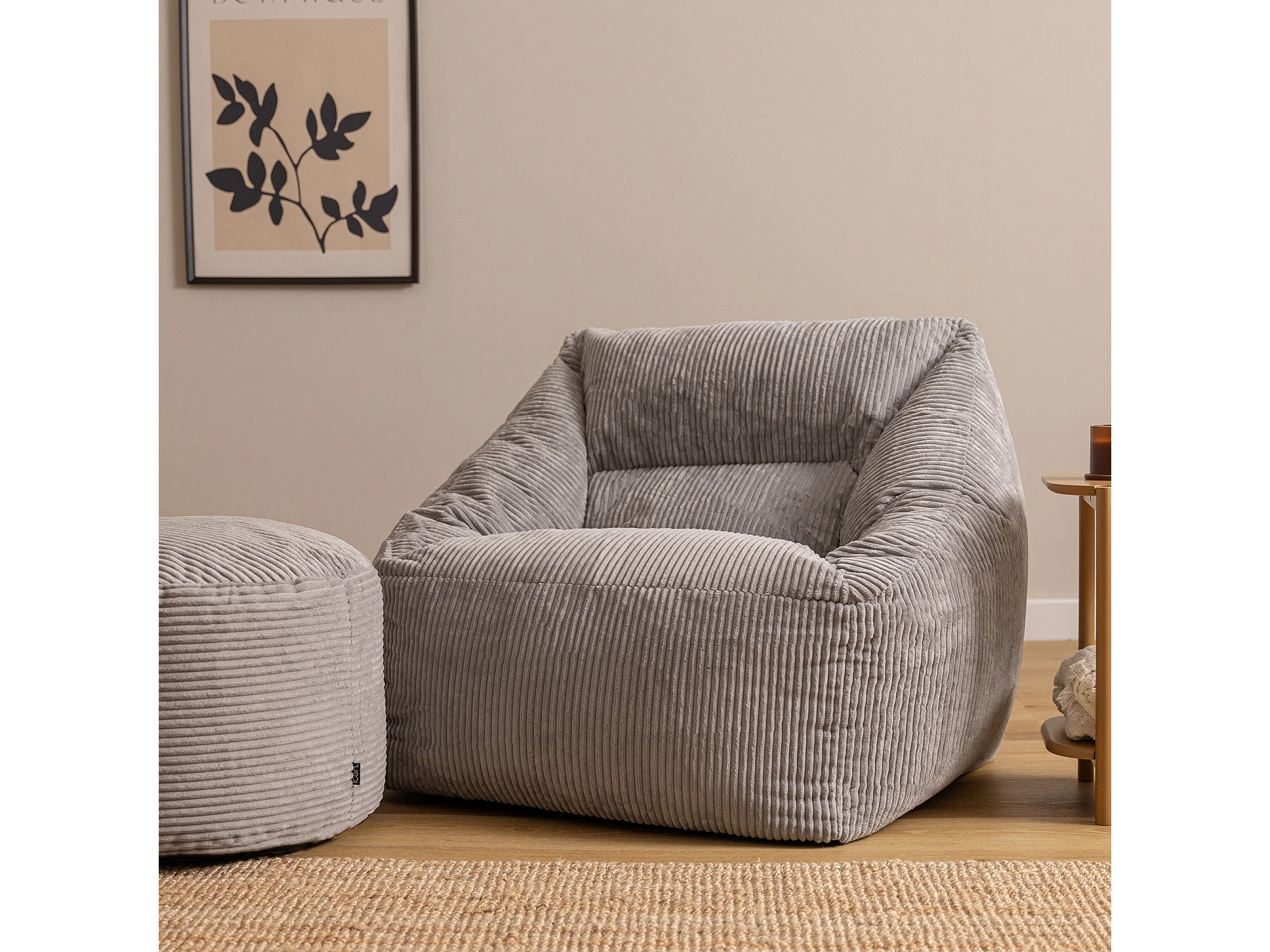 Pouf fauteuil avec repose-pied rond velours côtelé gris clair, salon ou chambre - NATALIA