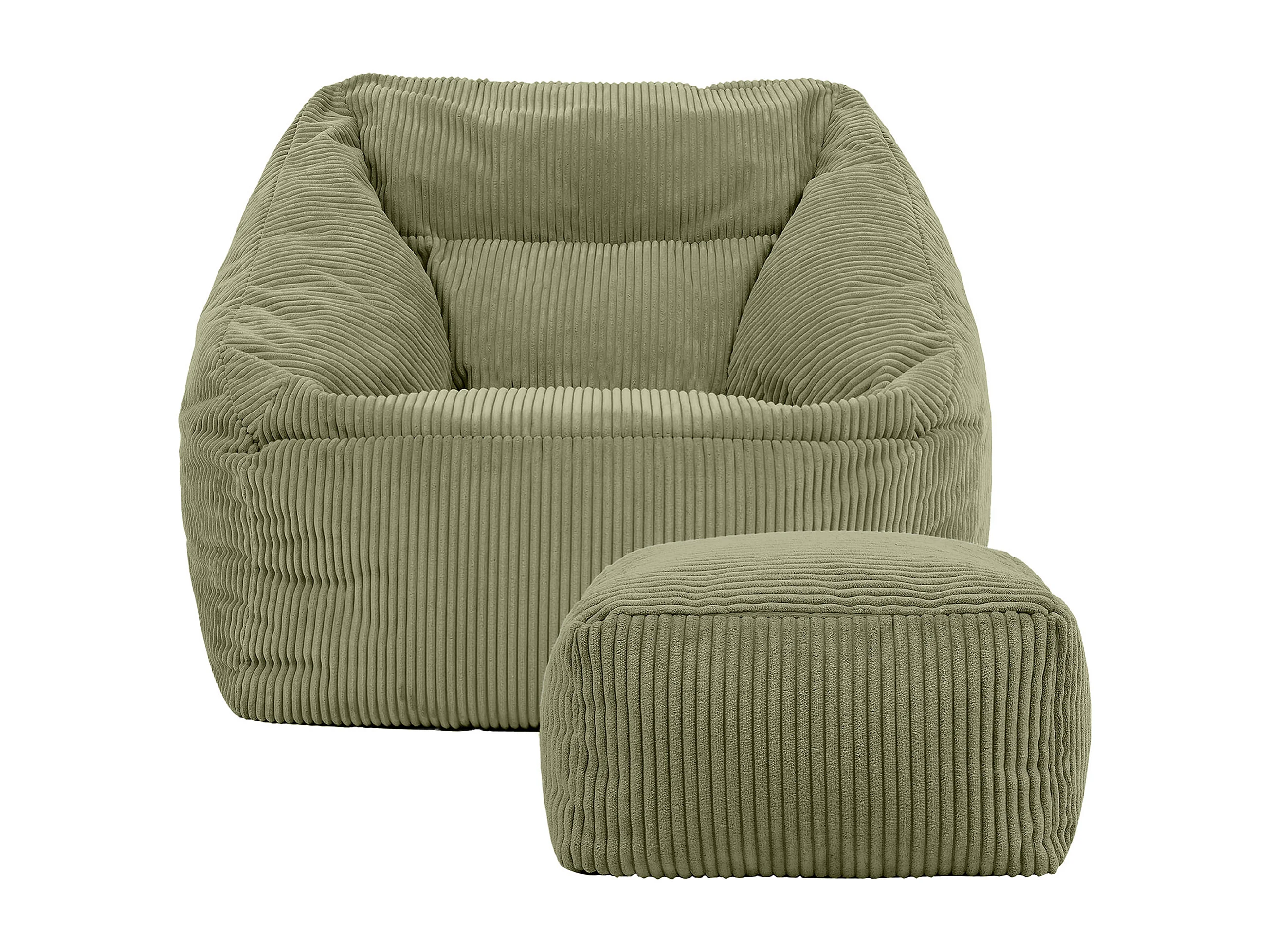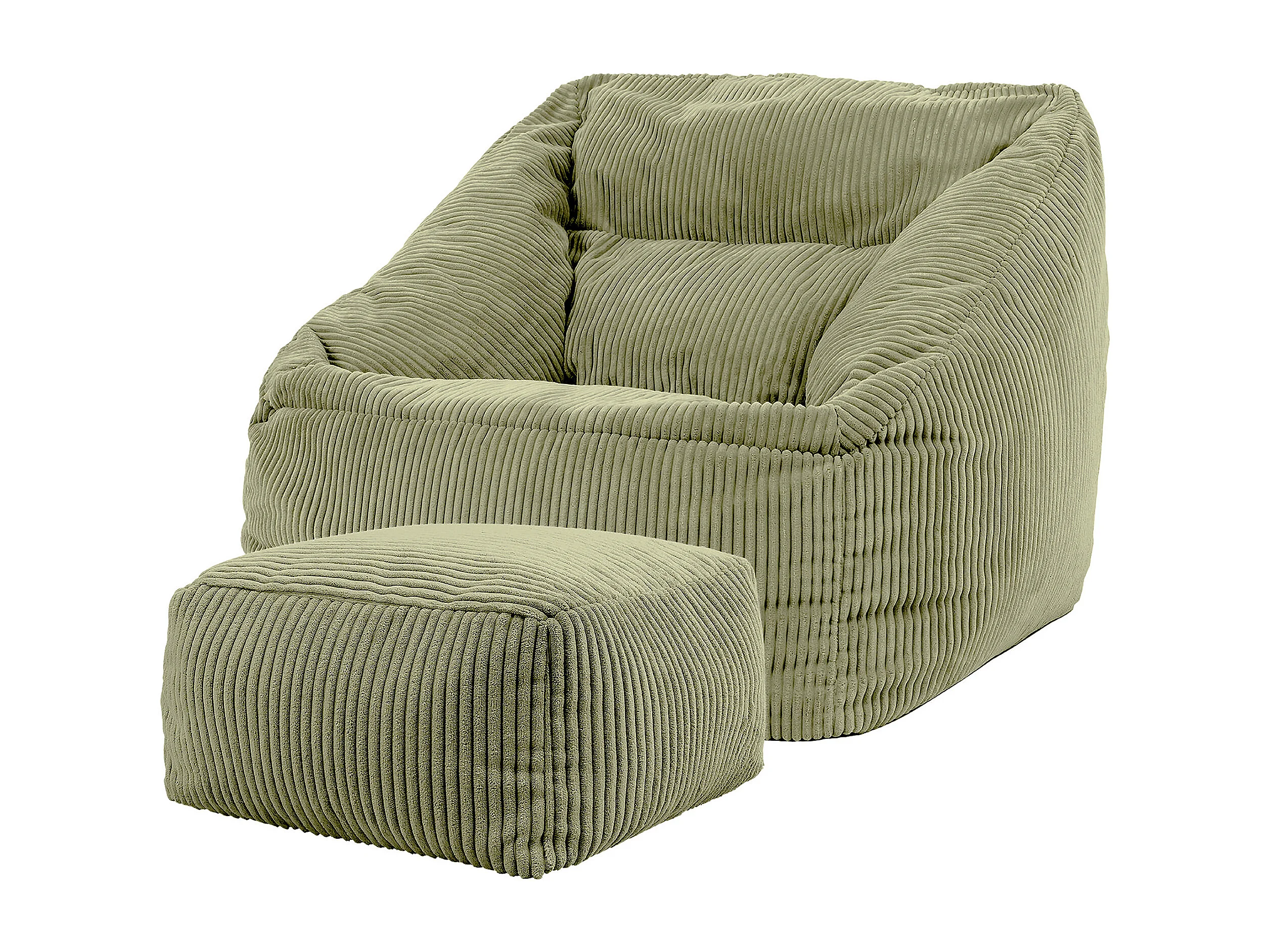 Pouf fauteuil et son repose-pieds carré velours côtelé vert sauge, salon ou chambre - NATALIA