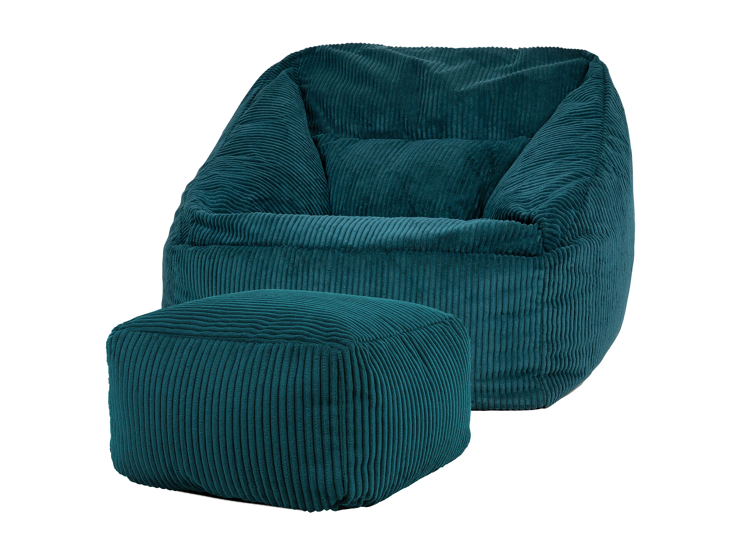 Pouf fauteuil et son repose-pieds carré velours côtelé bleu canard - MORGAN