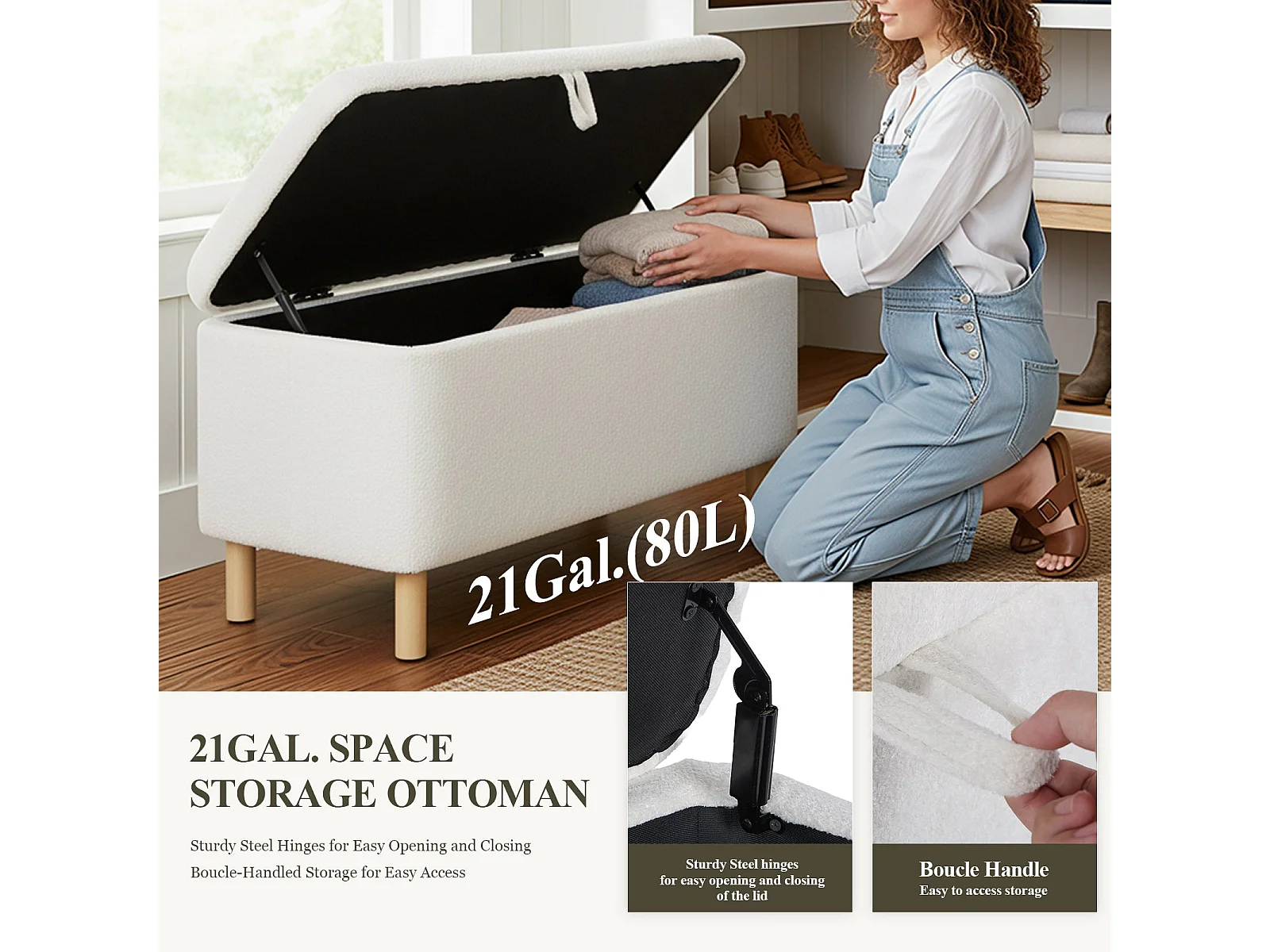 Pouf rond avec rangement, tissu polyester, pieds en bois, blanc (56x56x42 cm)