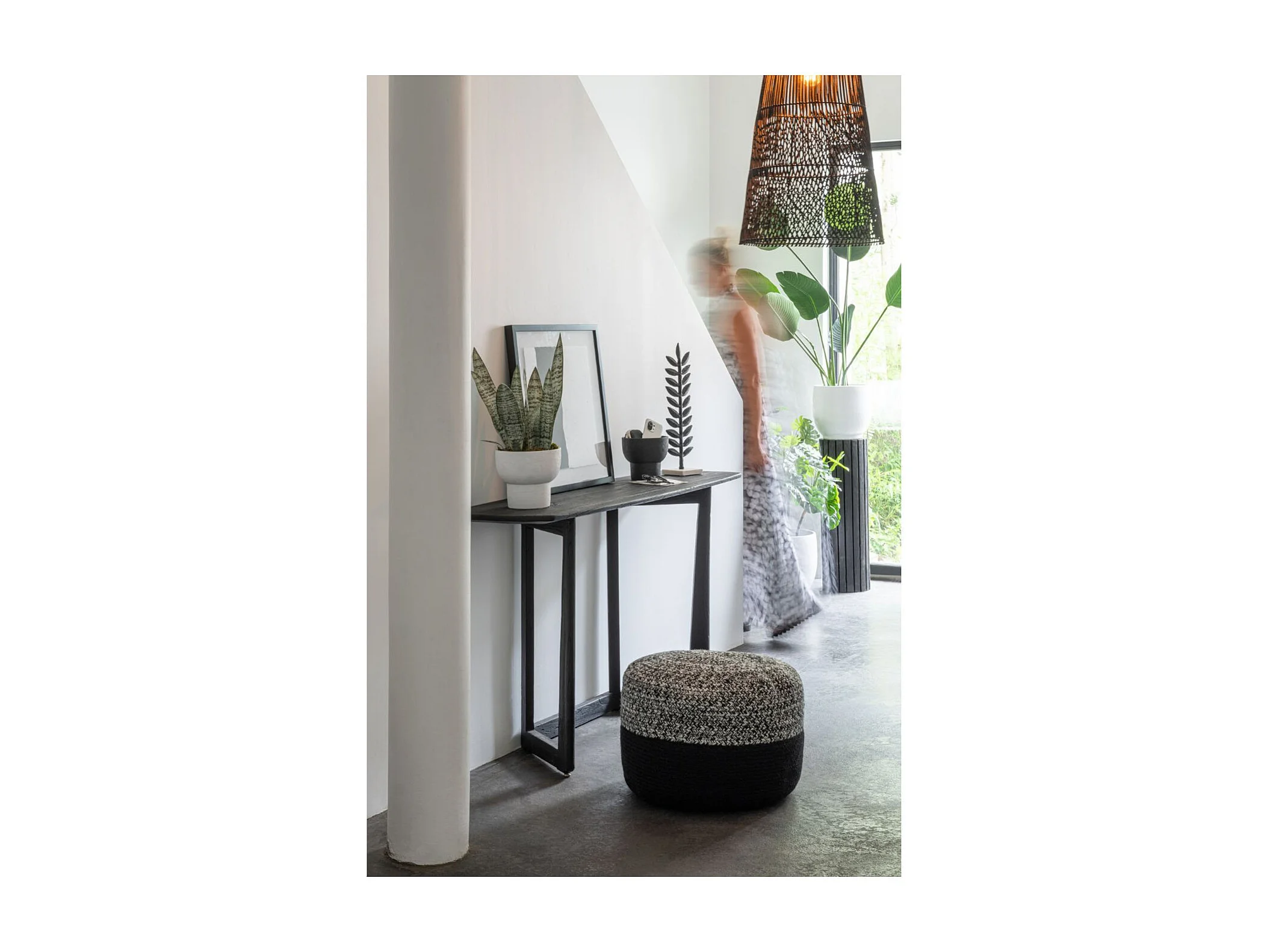 Pouf ovale en tissu noir effet laine et anneau en bois - BOSTON