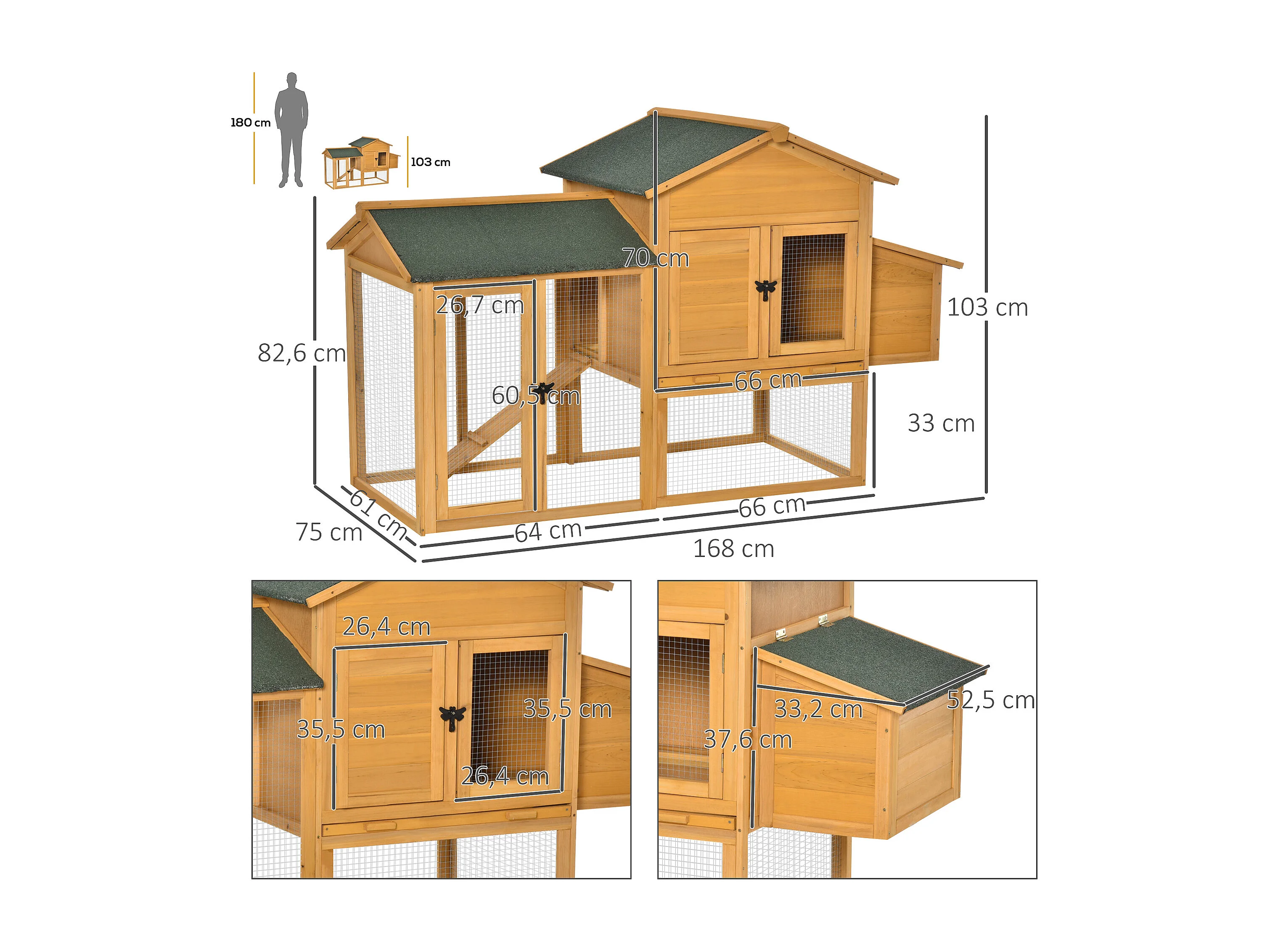 Poulailler cottage cage à poules sur pied dim. 168L x 75l x 103H cm multi-équipement bois sapin pré-huilé