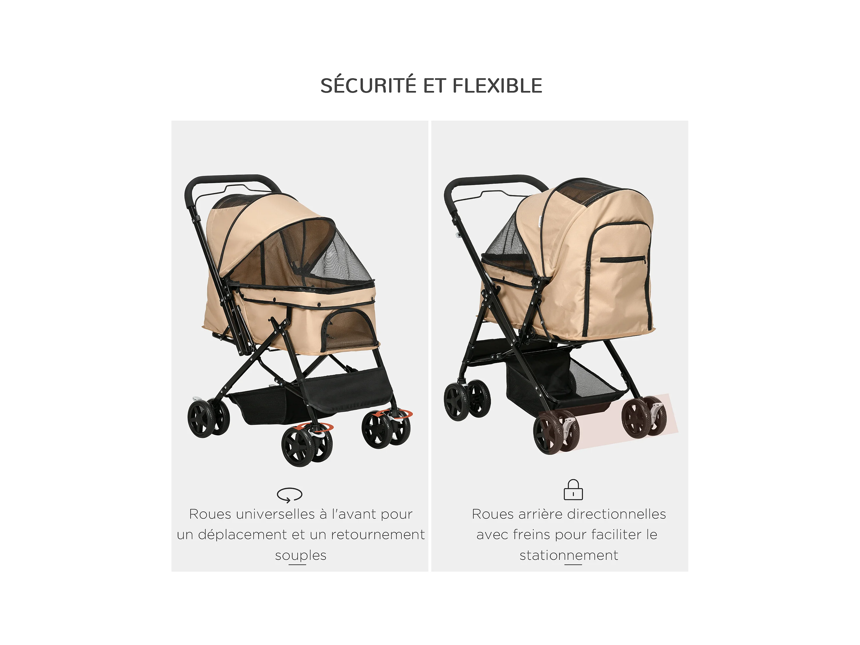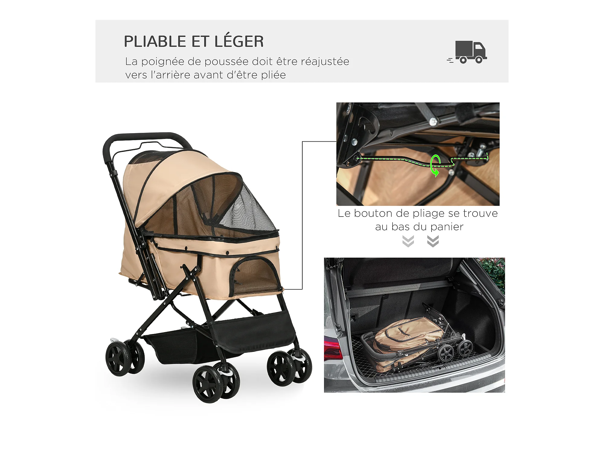 Poussette buggy pliable chien chat panier et sac de rangement attaches sécurité housse réglable poignée réglable acier Oxford beige
