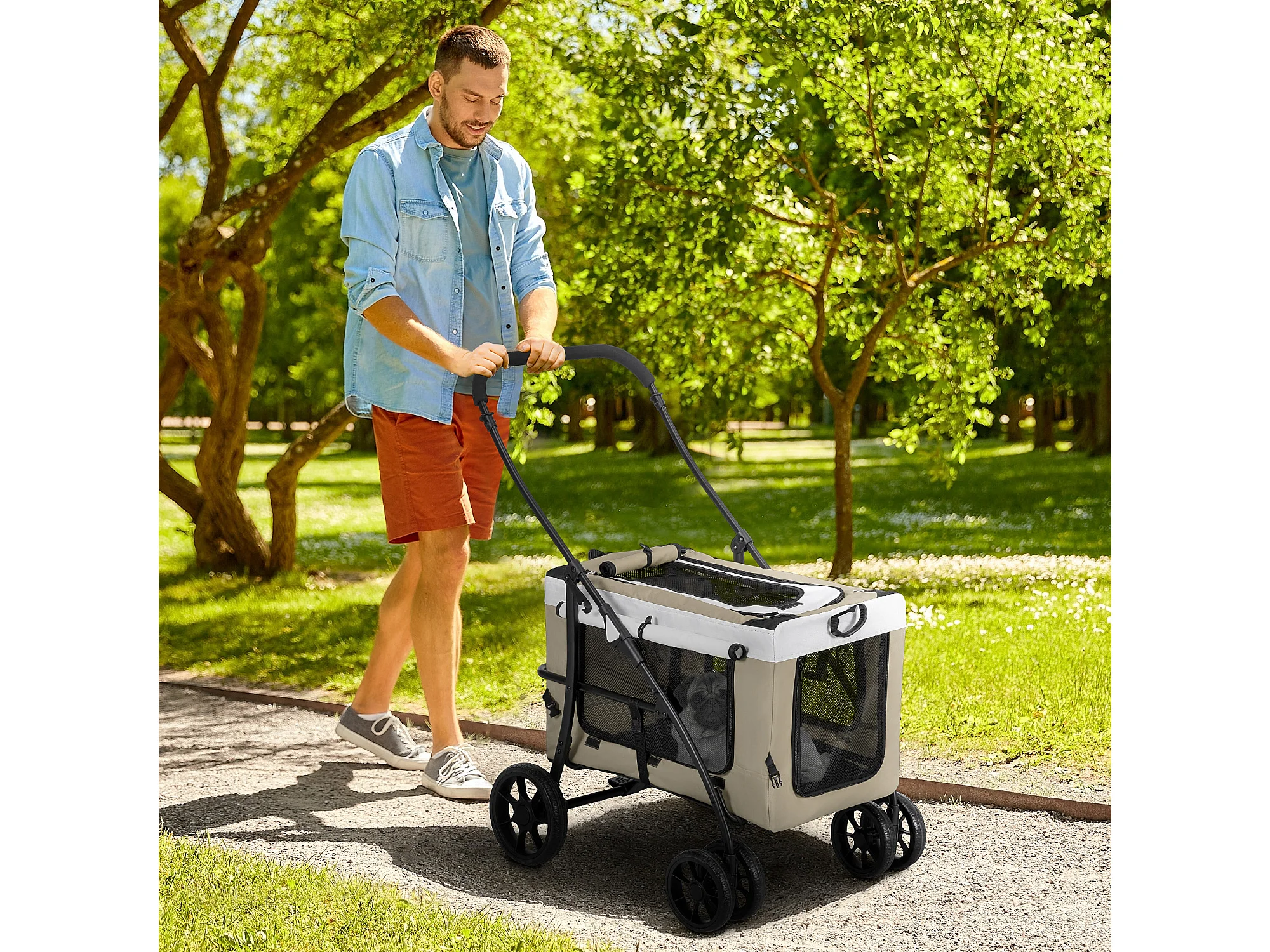 Poussette pliante pour petits chiens et chats, tissu oxford, kaki, avec rangement et roues pivotantes (67x45x96cm)
