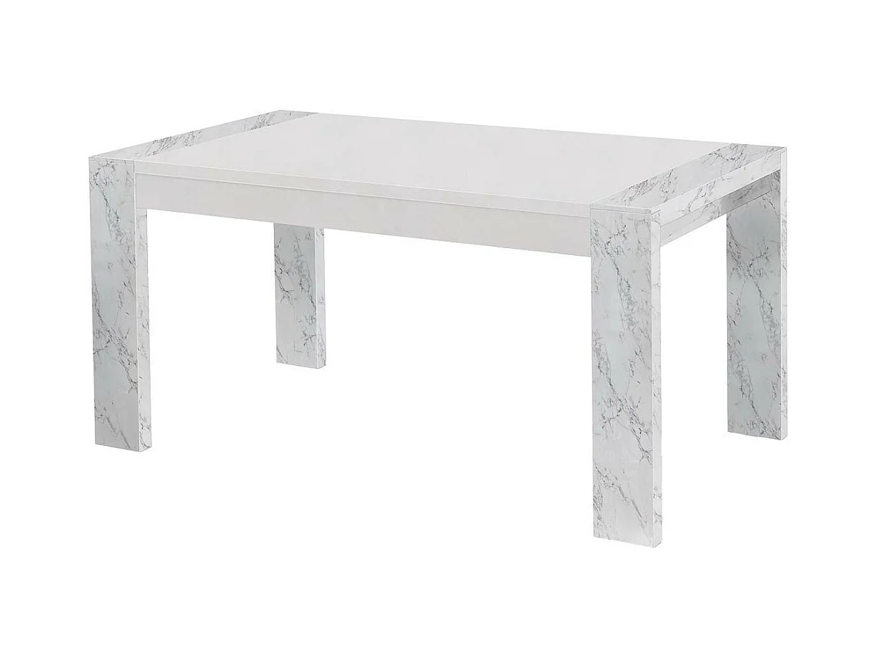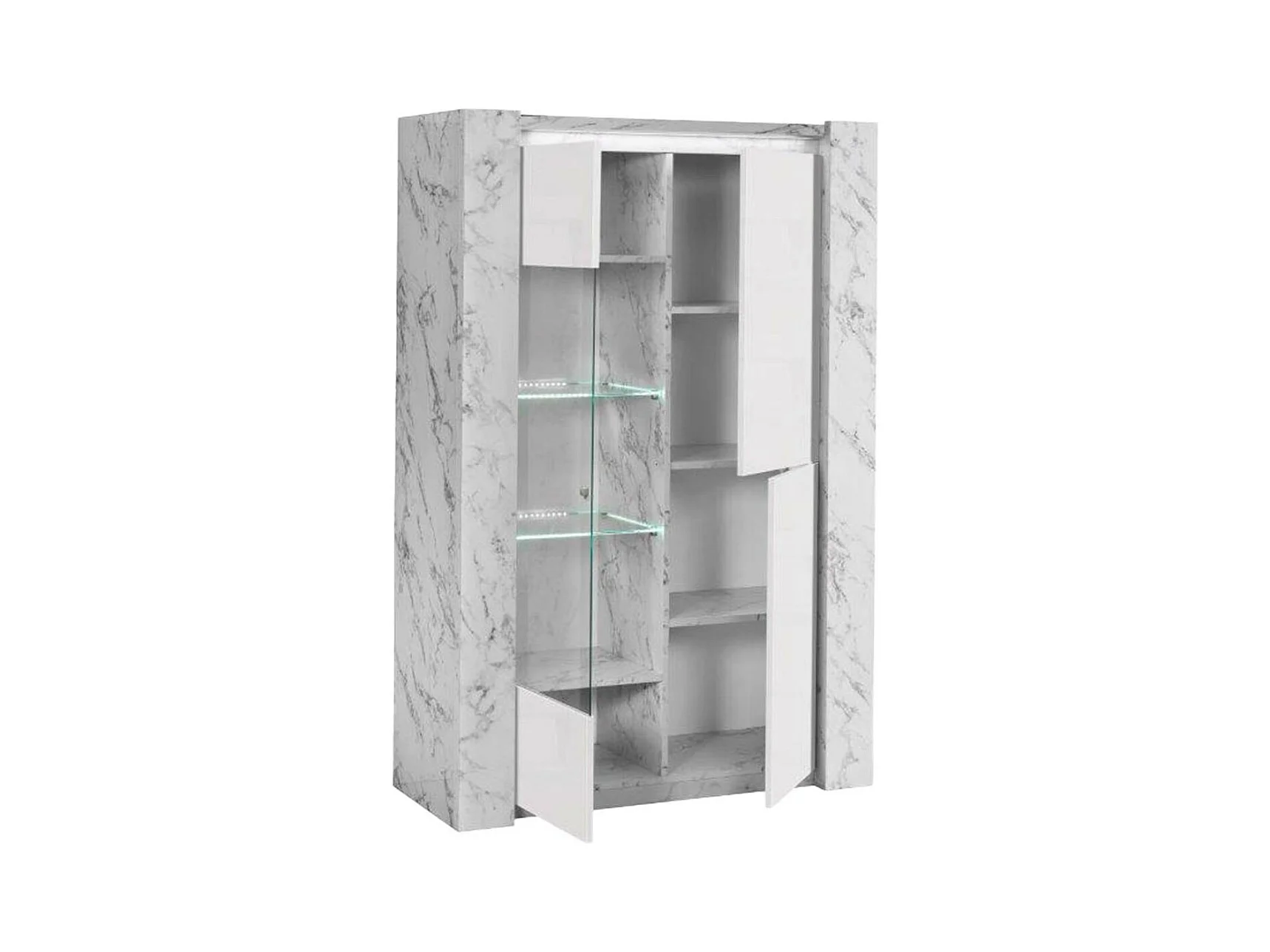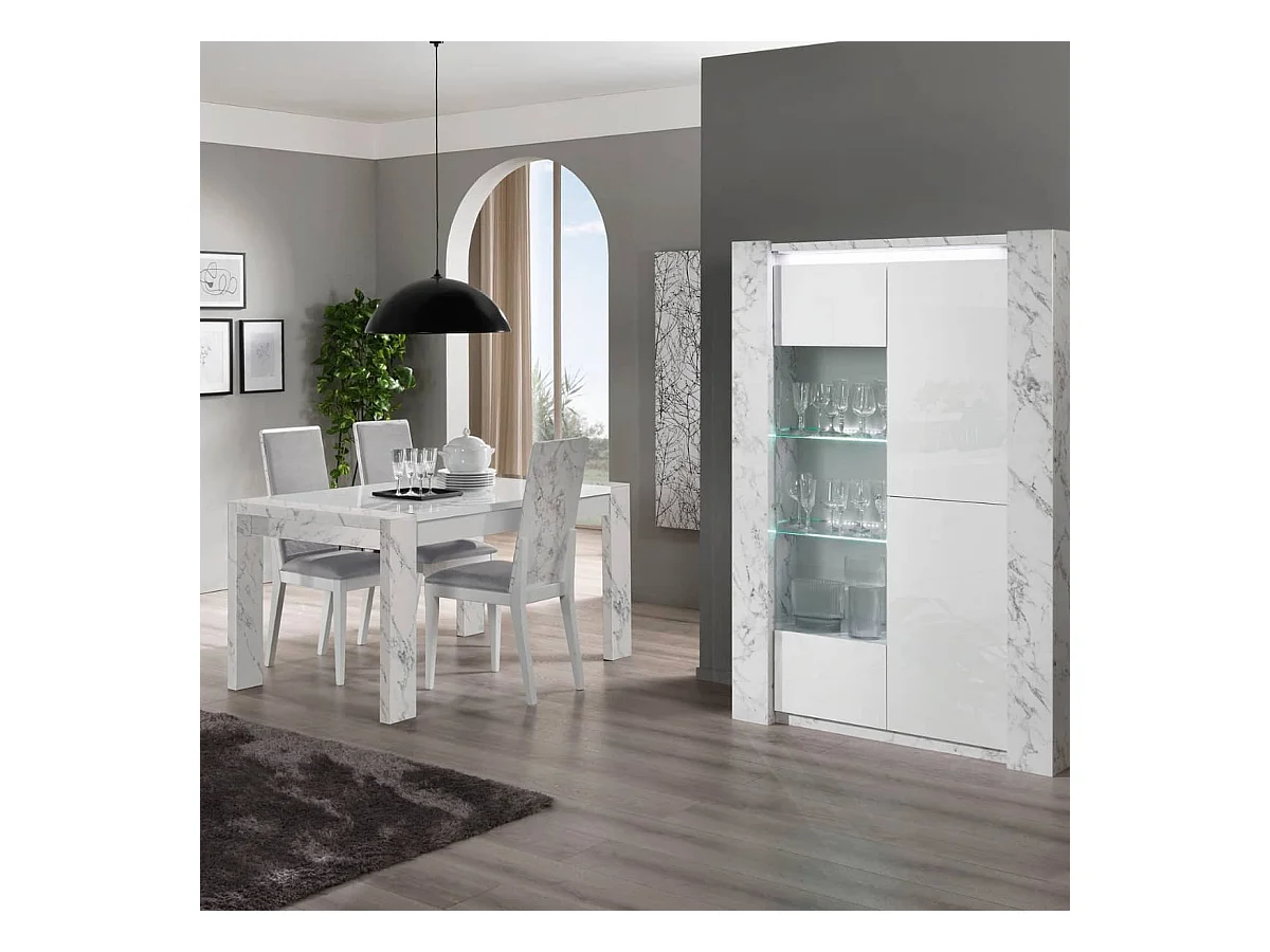 PRAVA - Ensemble Séjour Blanc et Effet Marbre Table 160cm + Vitrine avec Leds