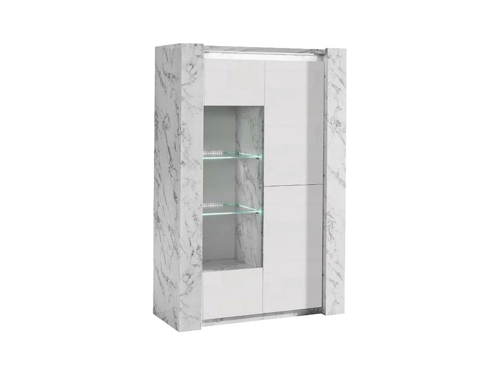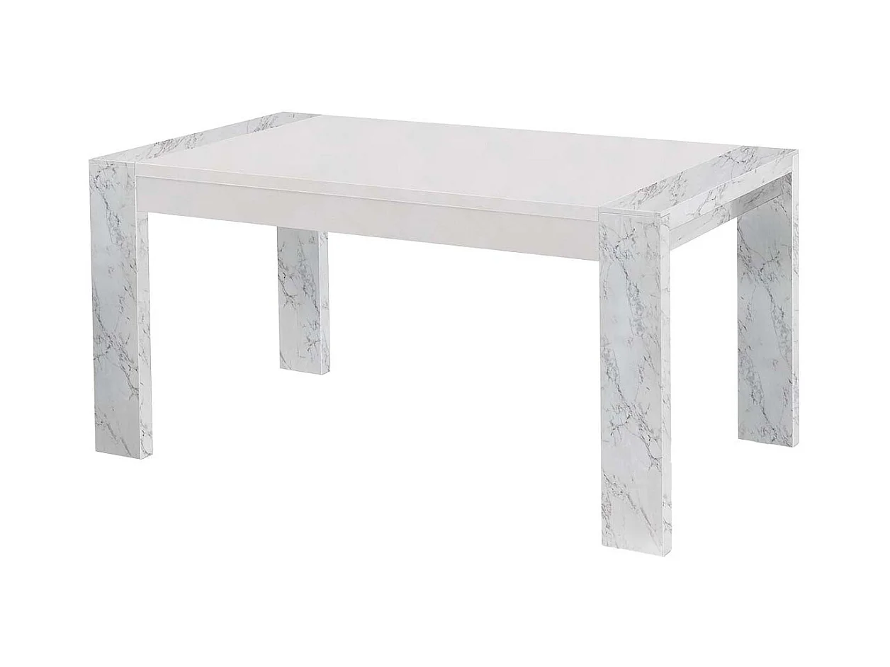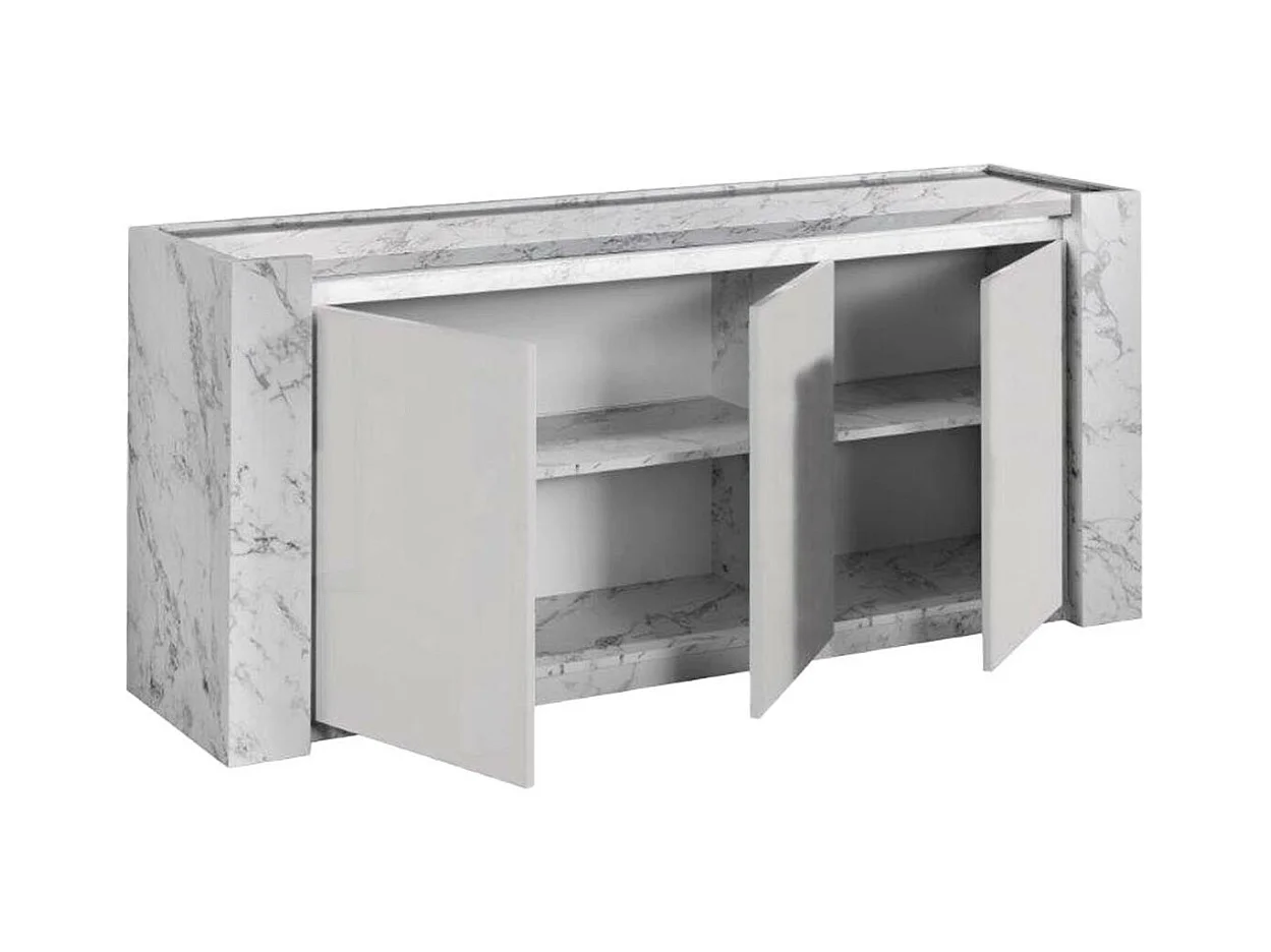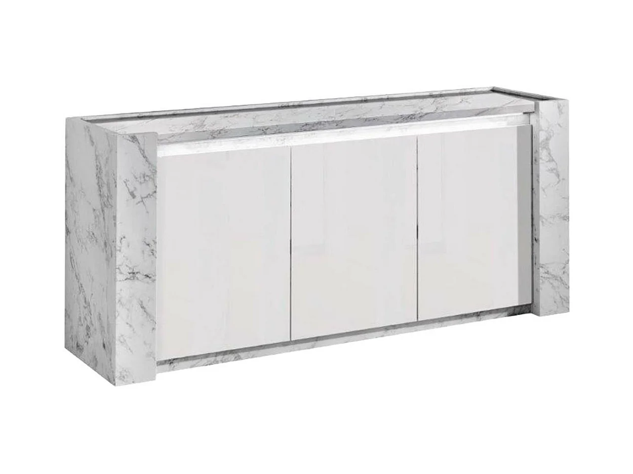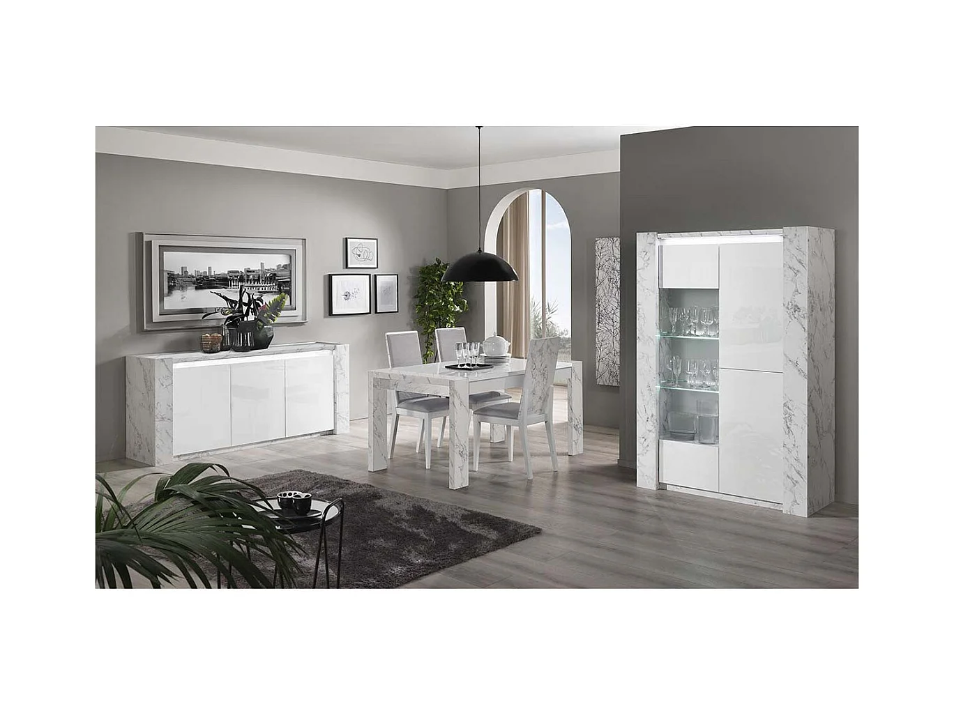 PRAVA - Ensemble Séjour Complet Blanc et Effet Marbre Table 160cm + Buffet et Vitrine avec Leds