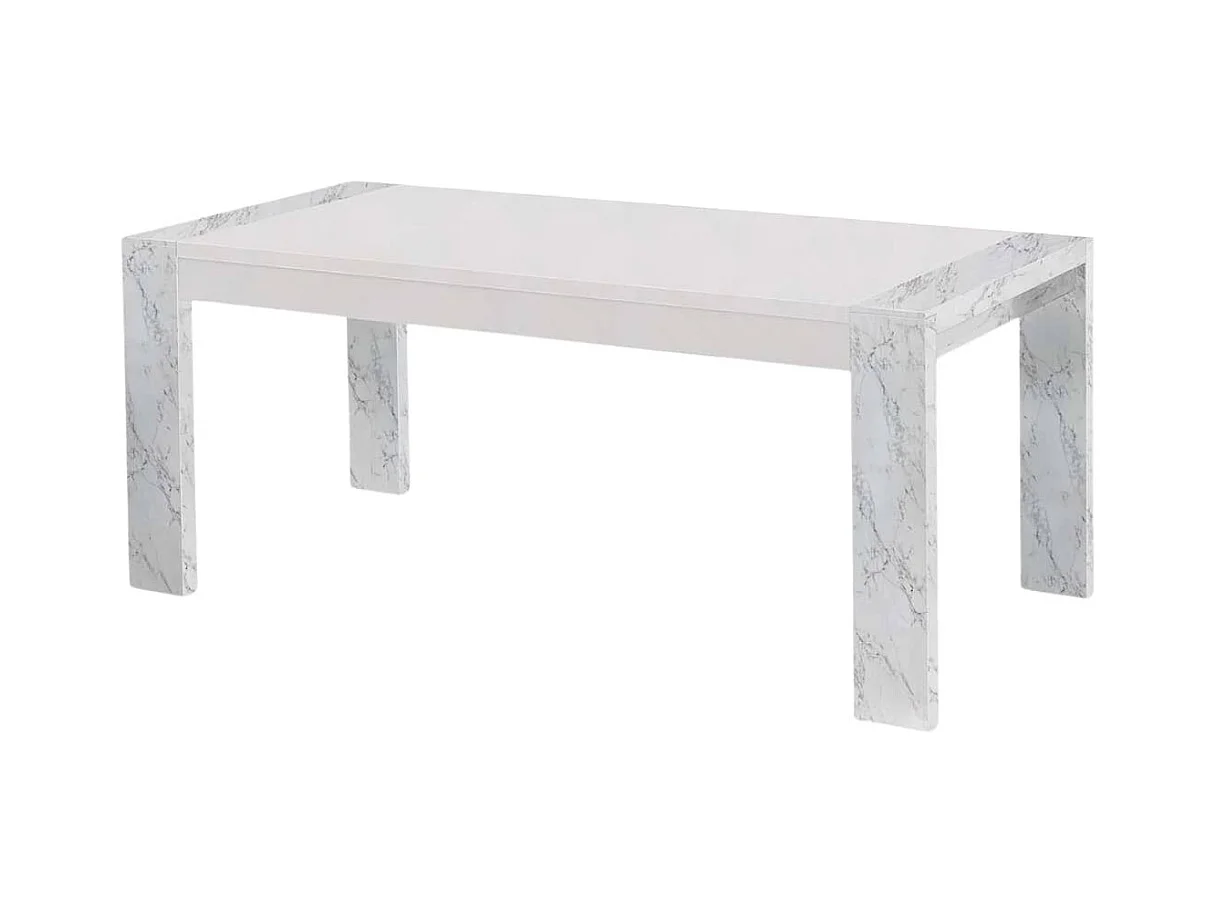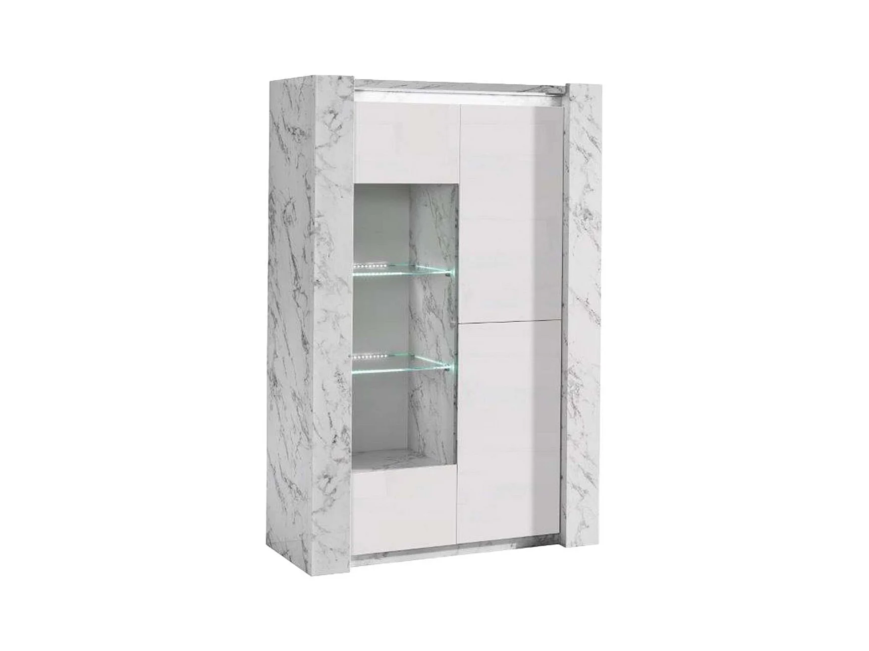 PRAVA - Ensemble Séjour Complet Blanc et Effet Marbre Table 190cm + Buffet et Vitrine avec Leds