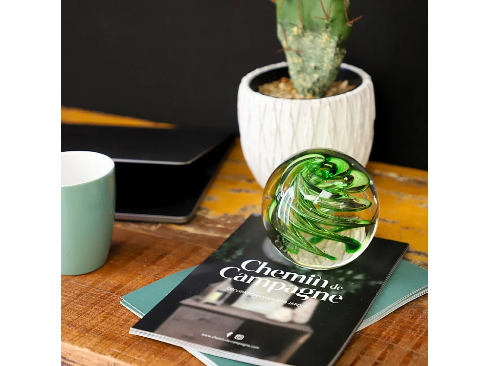 Presse papier sulfure "Tourbillons" en verre vert Ø.10 cm
