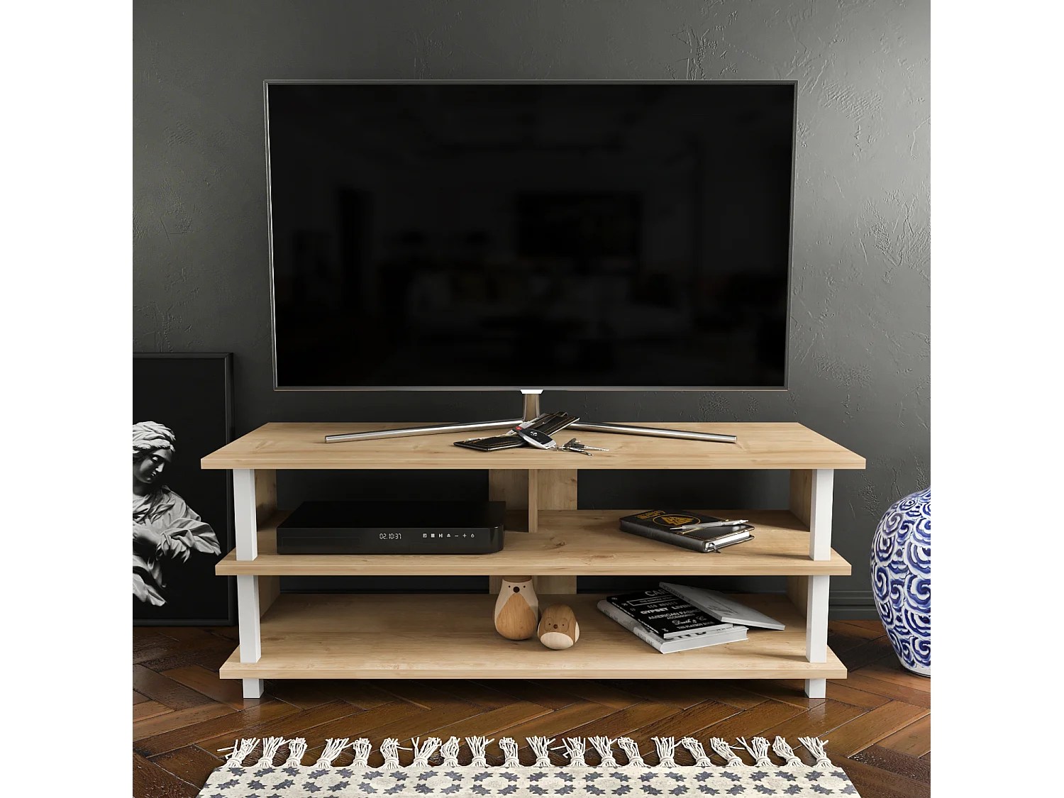 Pueblo Meuble TV 120 cm Niches et Étagères Ouvertes (Blanc et Chêne)