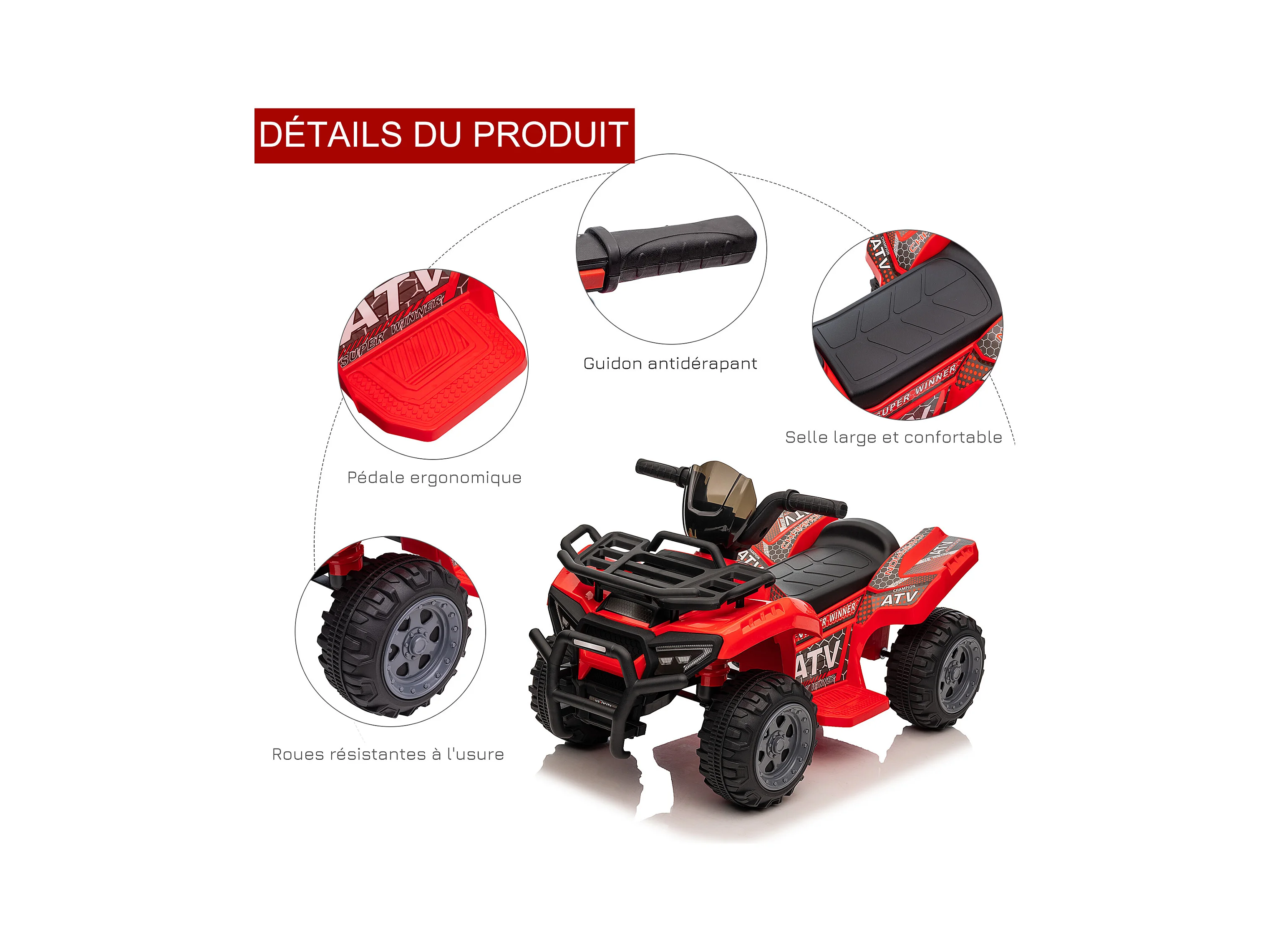 Quad buggy électrique enfant 12 V 3 Km/h max. effets lumineux et sonores rouge noir