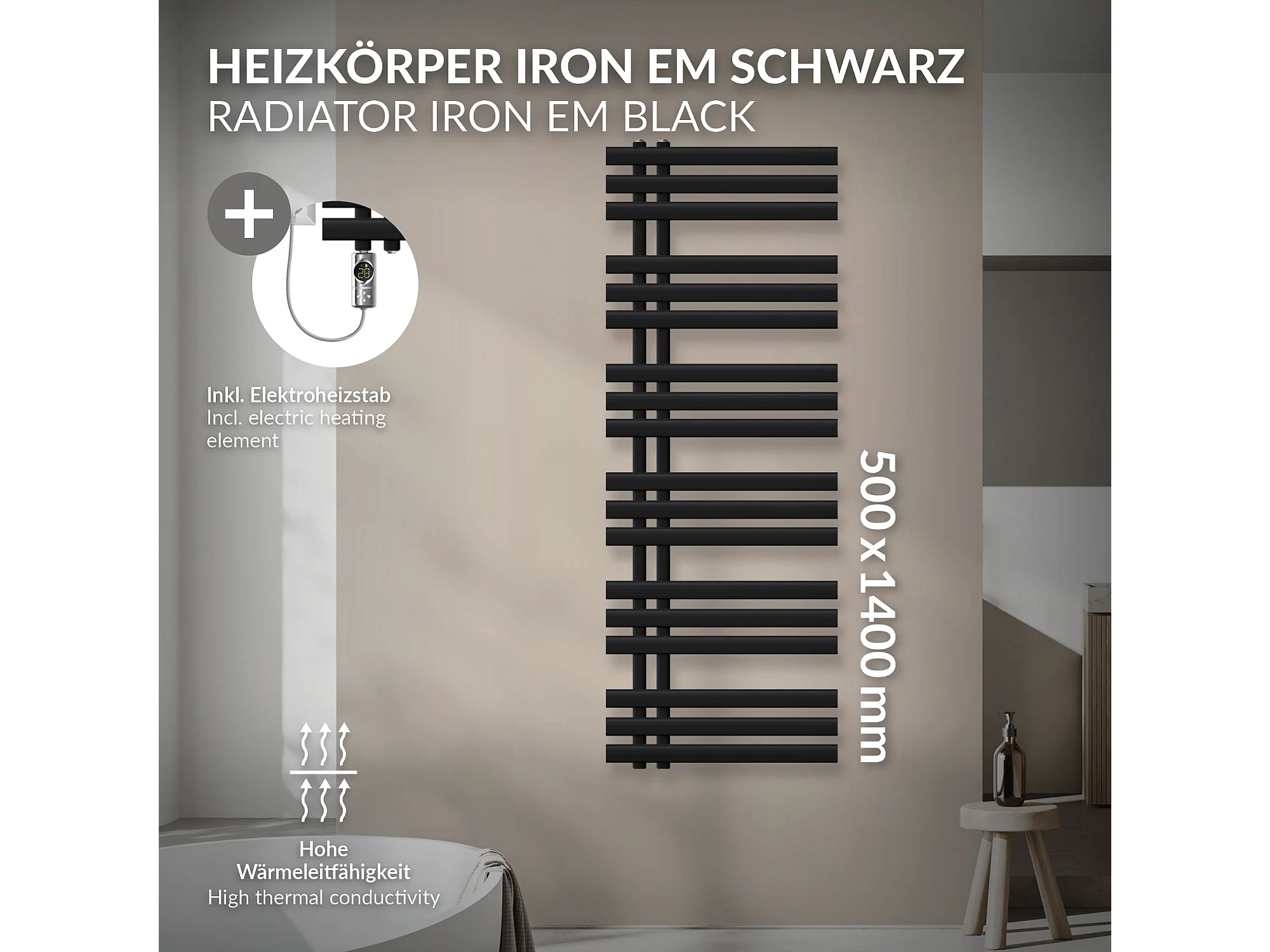 Radiateur de salle de bain acier noir mat 50x140cm avec élément chauffant 900W