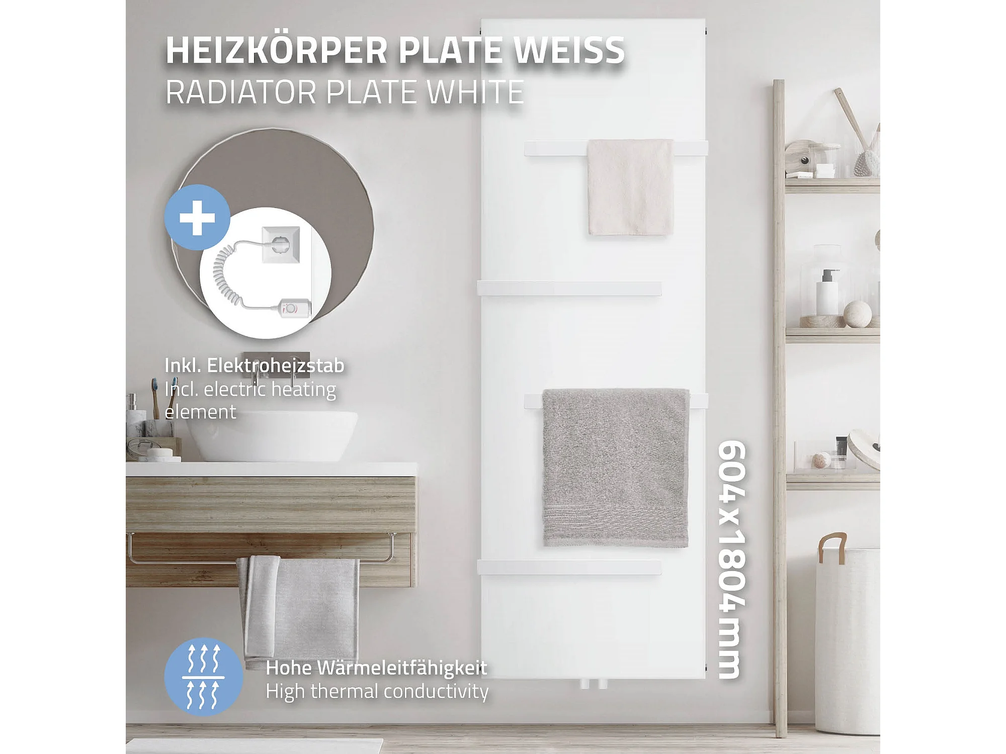 Radiateur électrique blanc élément chauffant 1200W 4 porte-serviettes 604x1800mm