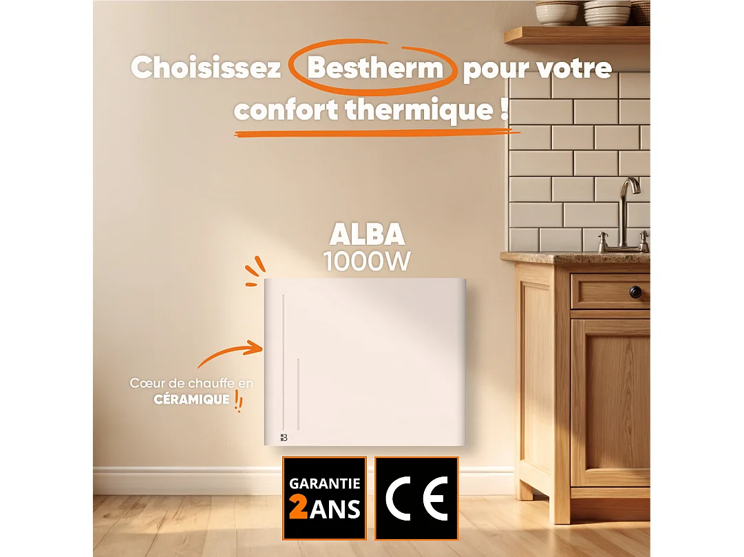 Radiateur électrique fixe à inertie sèche céramique 1500W Bestherm ALBA horizontal blanc