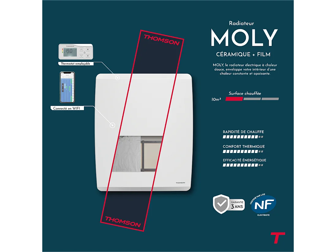 Radiateur électrique fixe connecté WiFi à inertie sèche céramique + film avec thermostat interchangeable 1000W THOMSON MOLY horizontal blanc