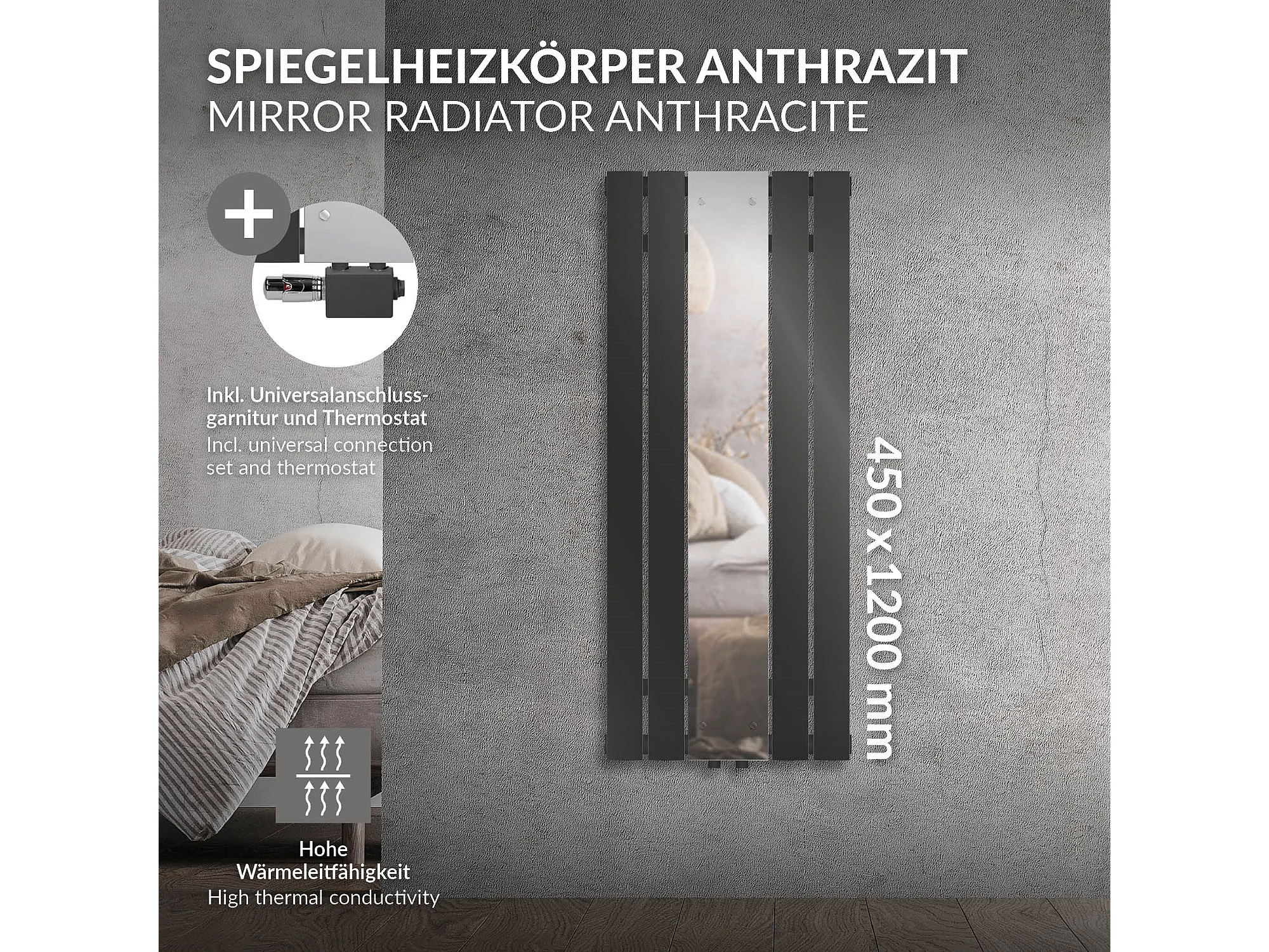 Radiateur plat anthracite 45x120 cm avec miroir et kit raccordement universel