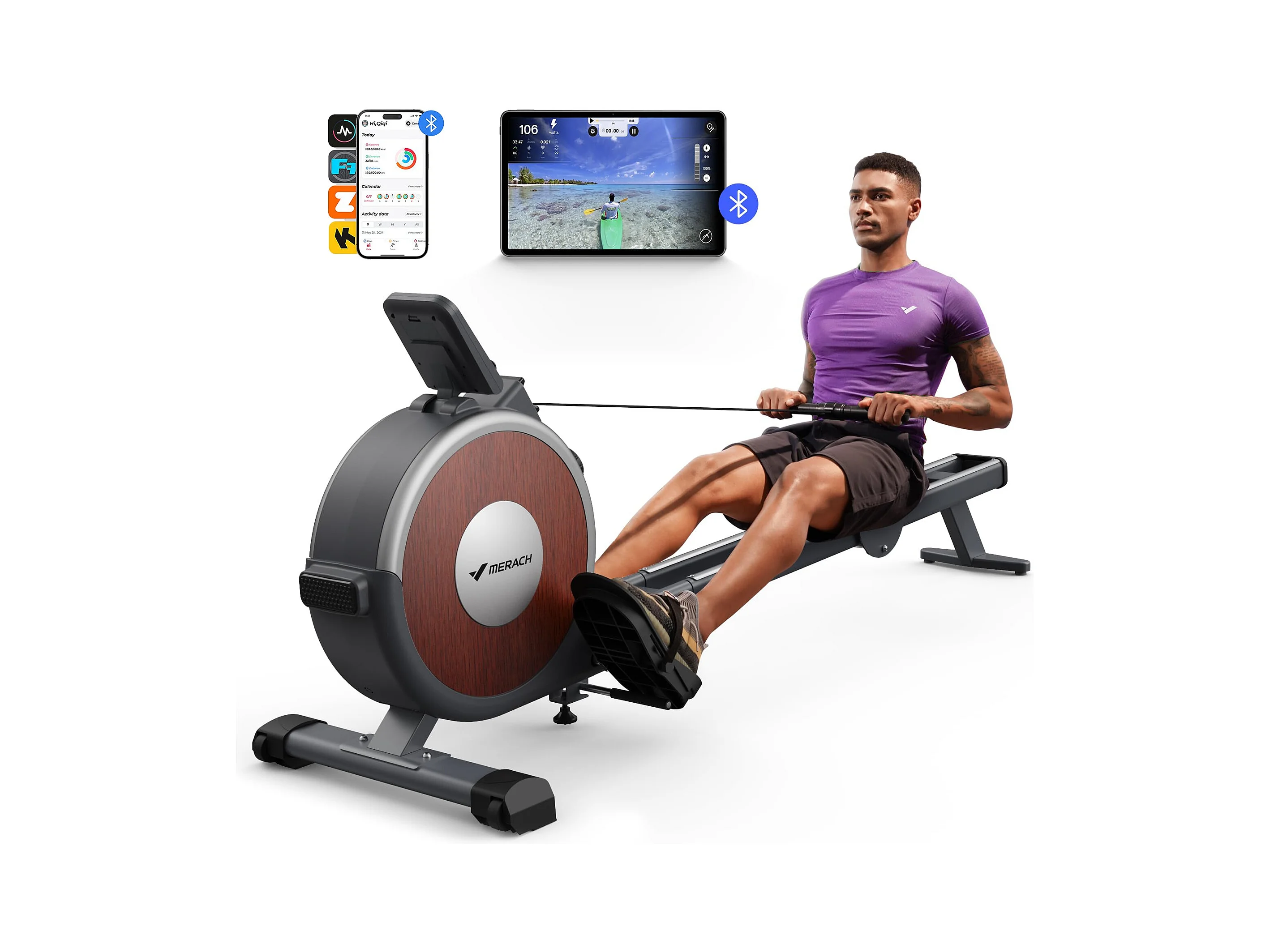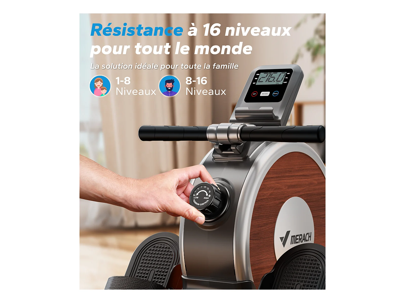 Rameur d'Appartement Merach, 16 Niveaux de Résistance, Deux Rails, Charge Maximale de 160 kg, Compatible avec APP