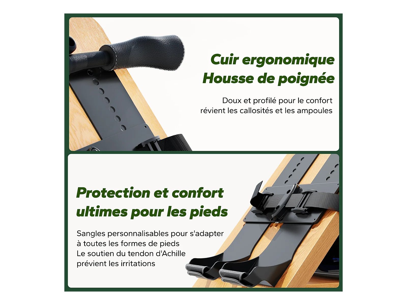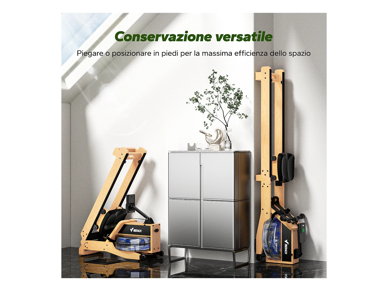 Rameur à eau pliable MERACH, 15 L, 6 repères de remplissage, Connectivité APP, Ecran LCD, Max 150kg, Bois d'hévéa clair