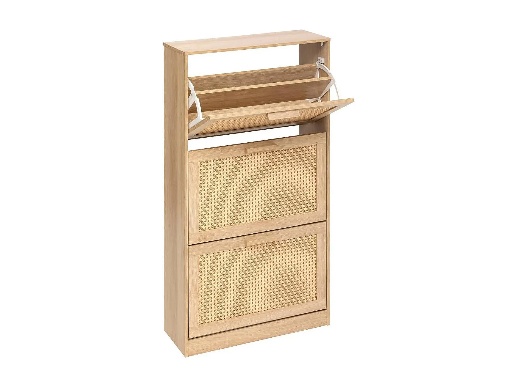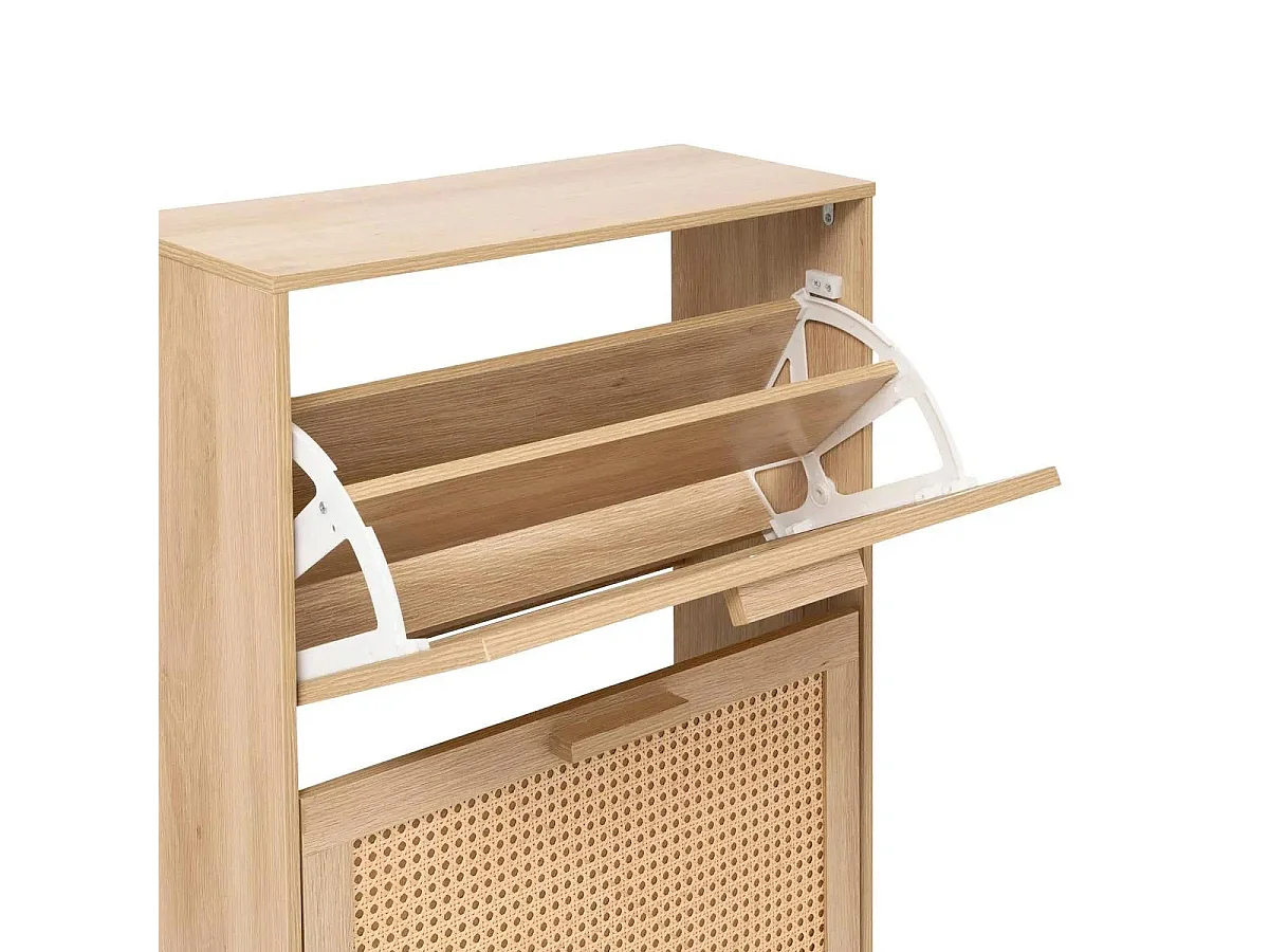 Armoire à chaussures en MDF avec portes en rattan, 3 portes basculantes et 1 tiroir, pieds et poignées en bois, couleur naturelle (90x17x125 cm)