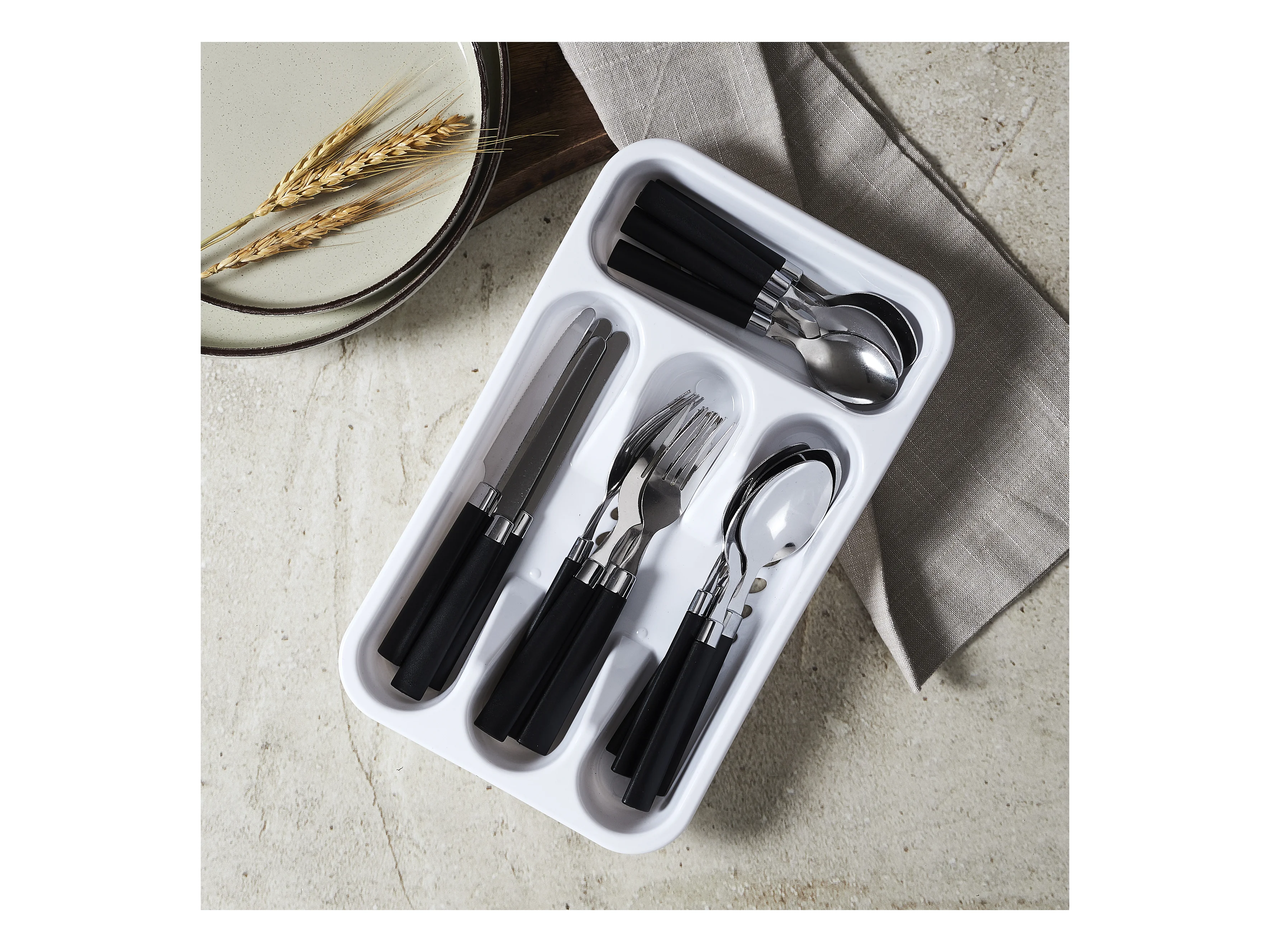 Range ménagère blanc avec 16 pièces en inox manches noirs en plastique