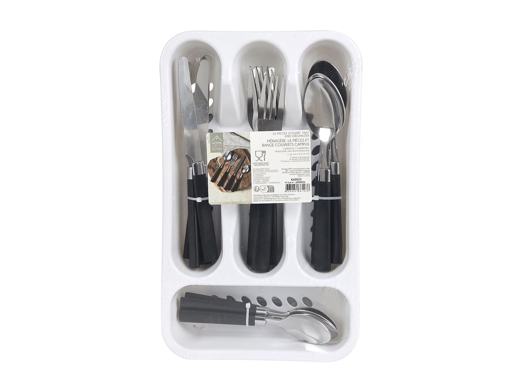 Range ménagère blanc avec 16 pièces en inox manches noirs en plastique