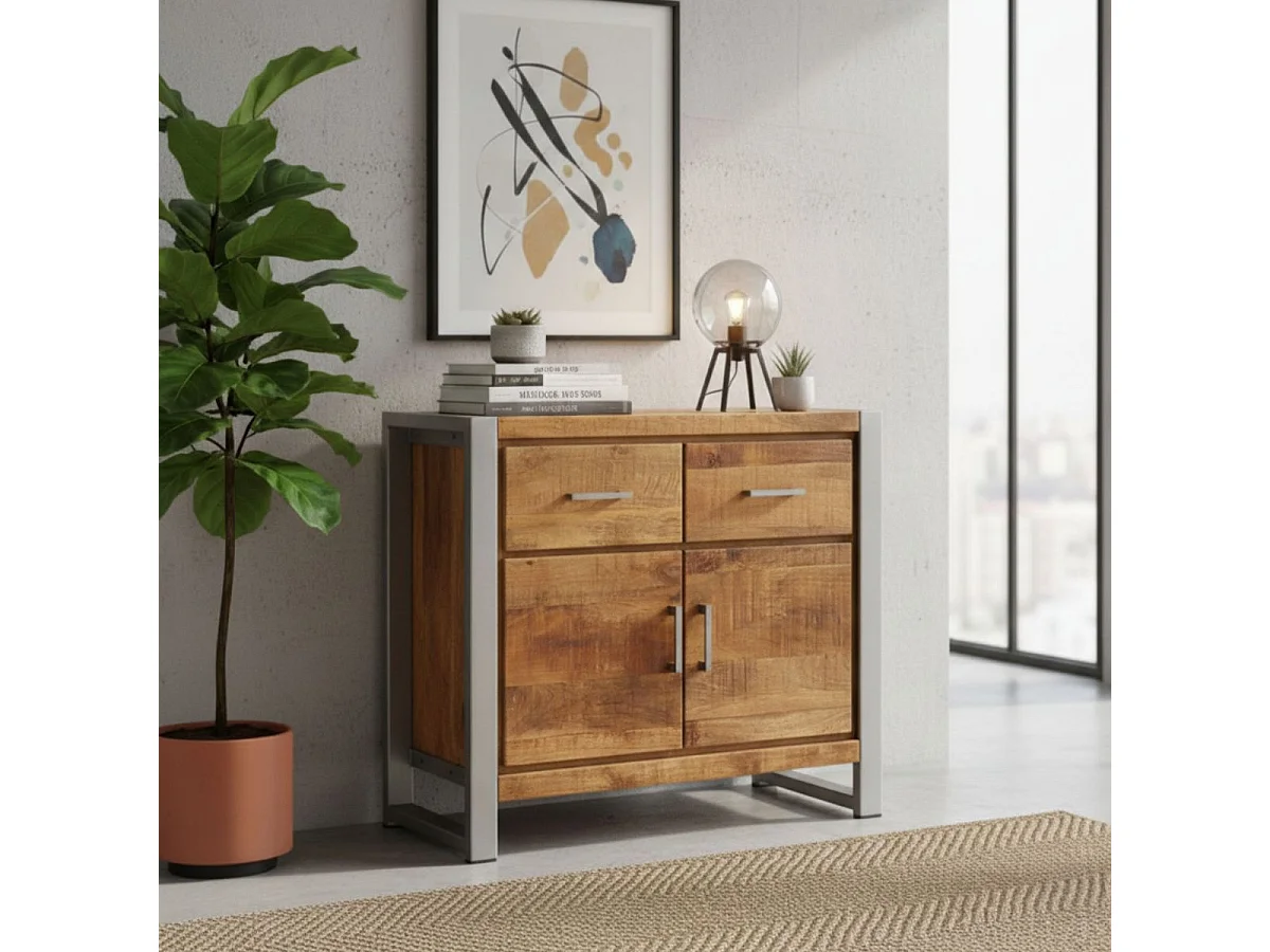 Rangement 2 portes 2 tiroirs en bois massif recyclé et acier patiné - MANGOVRE