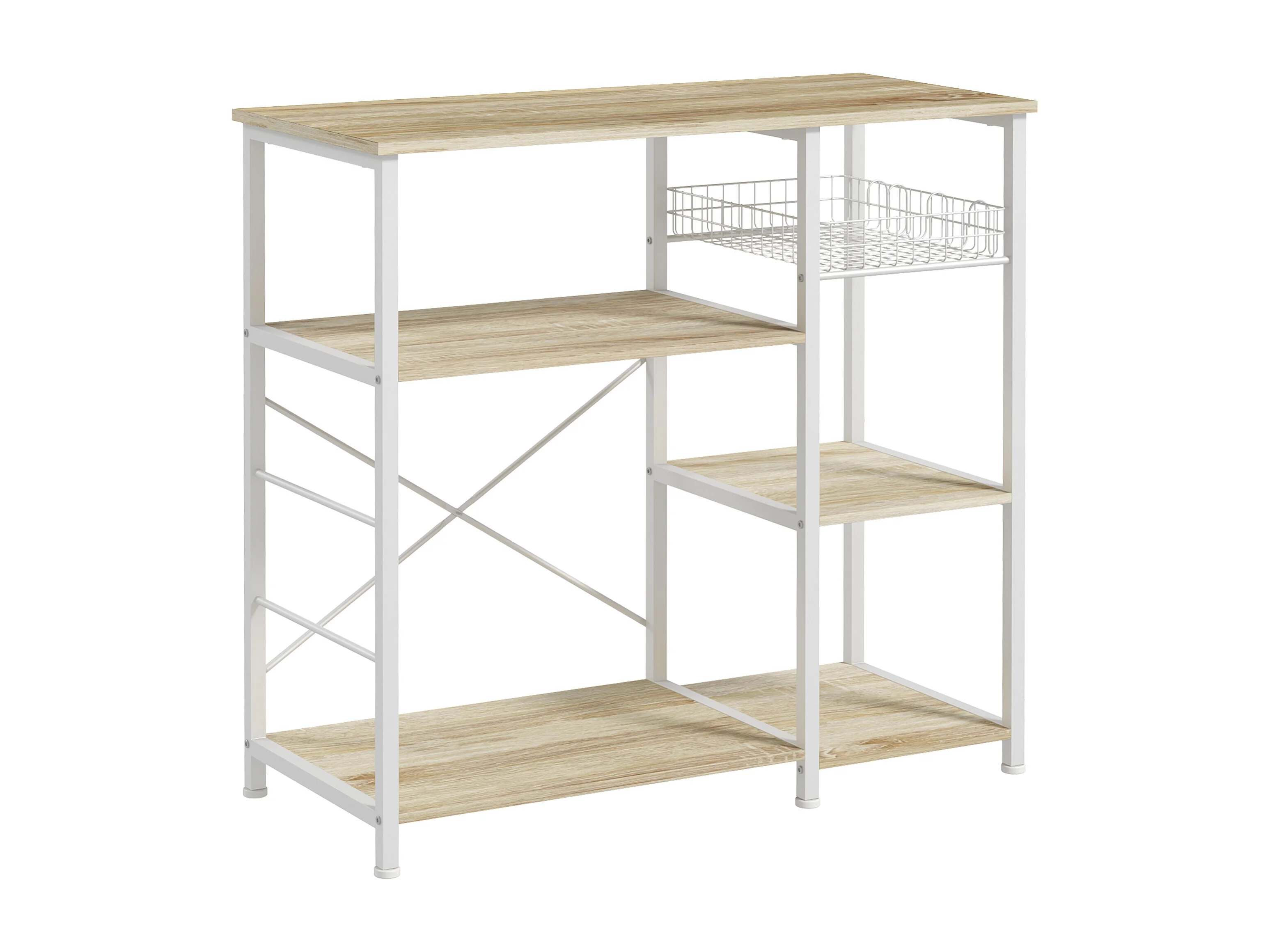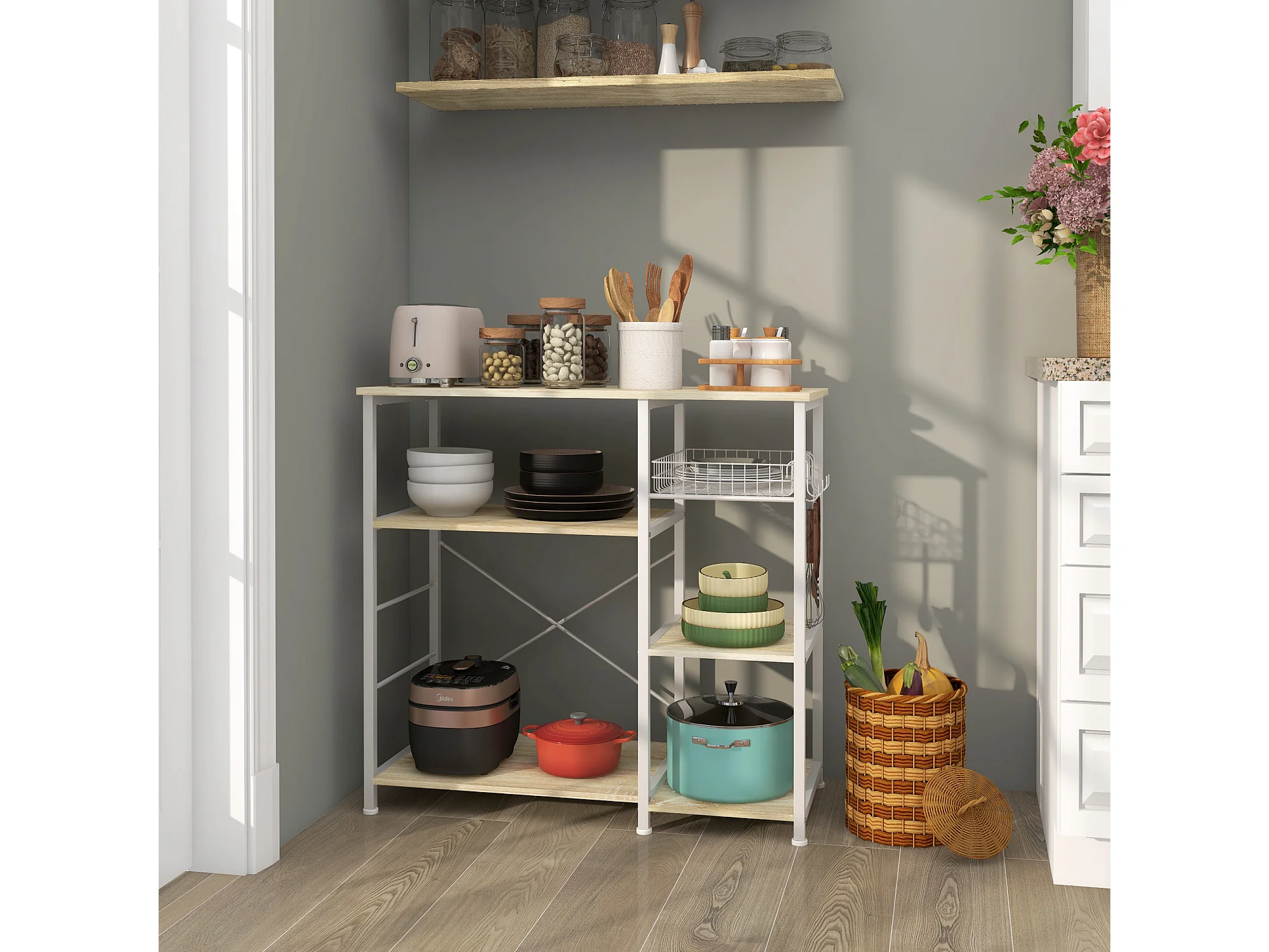 Rangement étagère de cuisine 4 étagères panier métal 4 crochets à ustensiles acier blanc aspect chêne clair