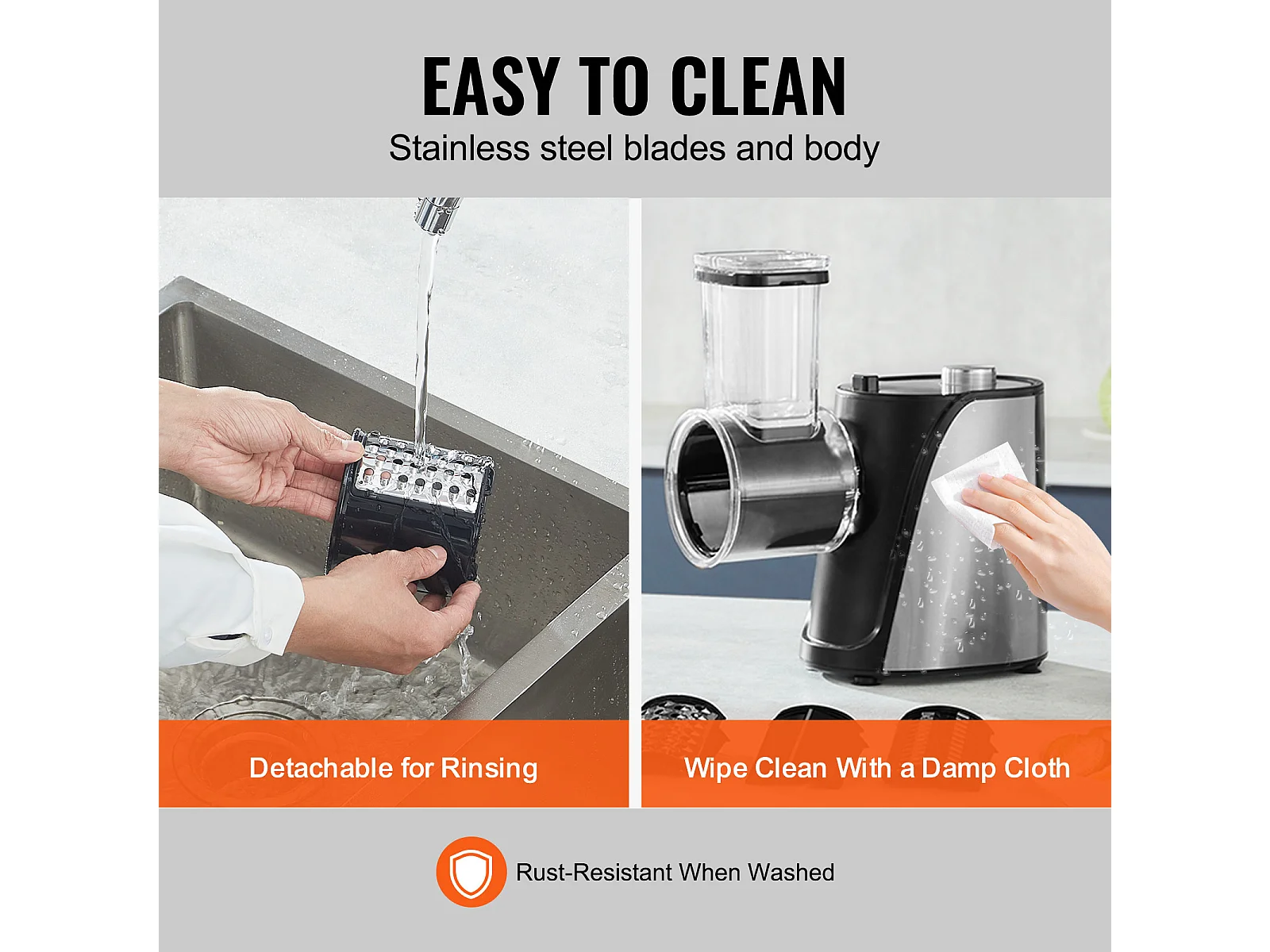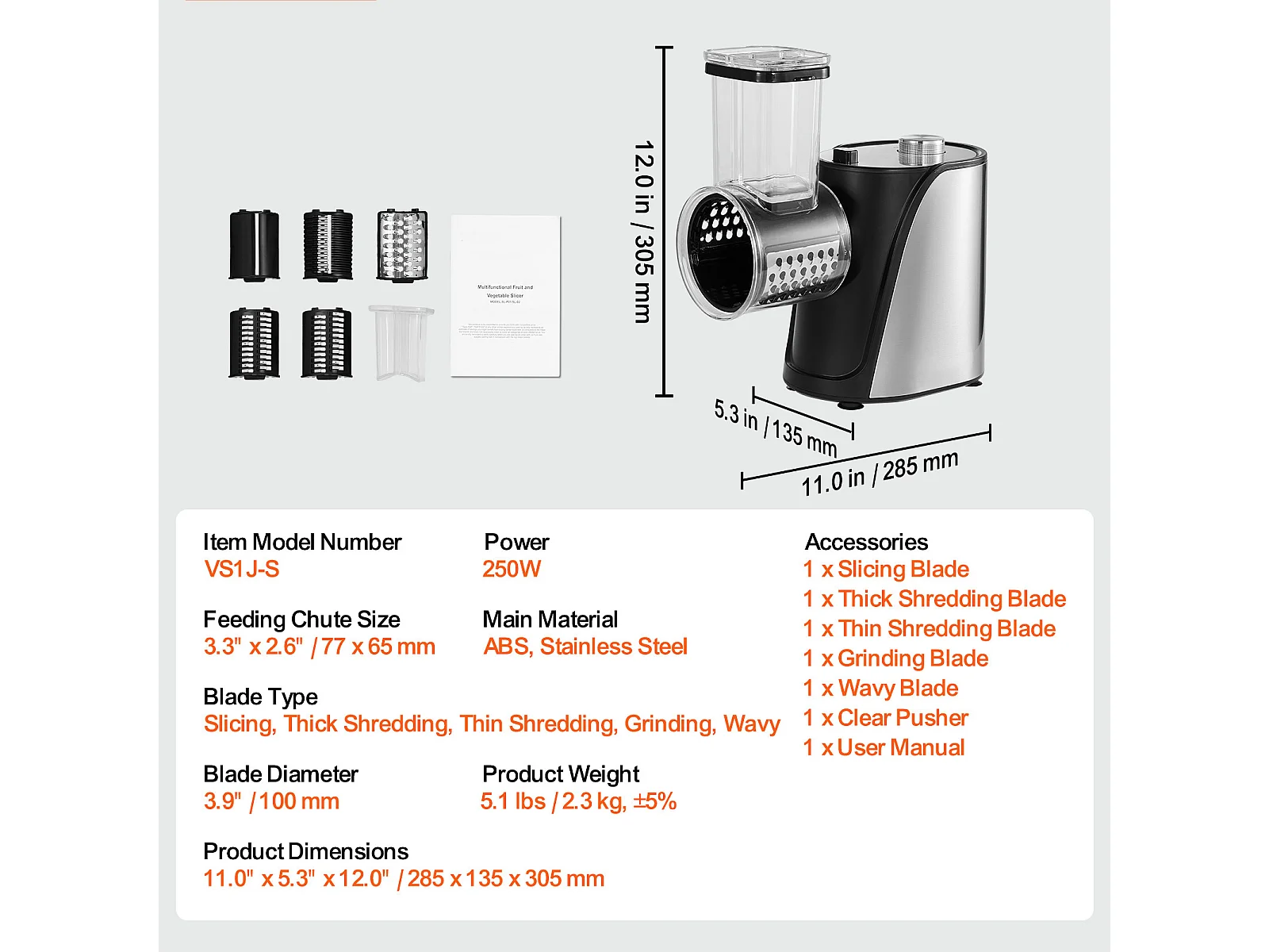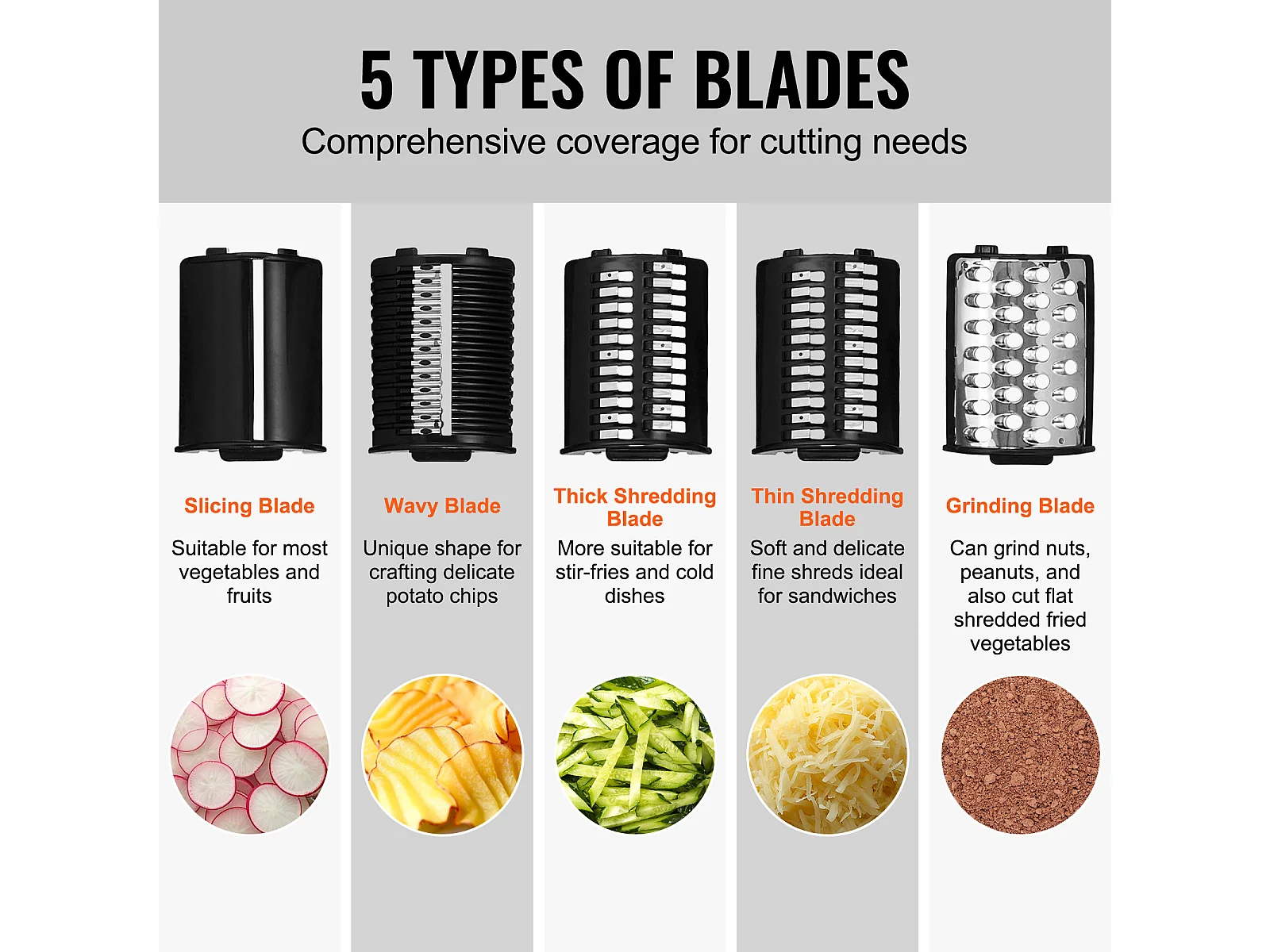 Râpe à Fromage Électrique SucceBuy 250 W, Machine à Salade, Trancheuse de Légumes, Tireur de Salade avec 5 Accessoires