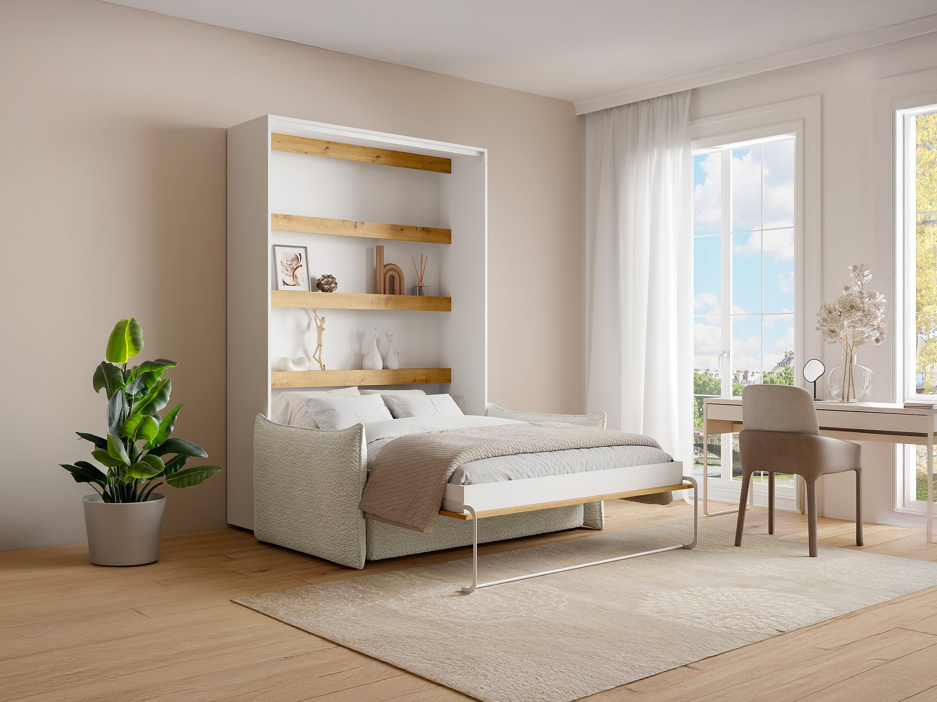 Lit escamotable 140 x 200 cm - Ouverture verticale manuelle - Avec LEDs - Blanc et naturel + Canapé - RAPILI